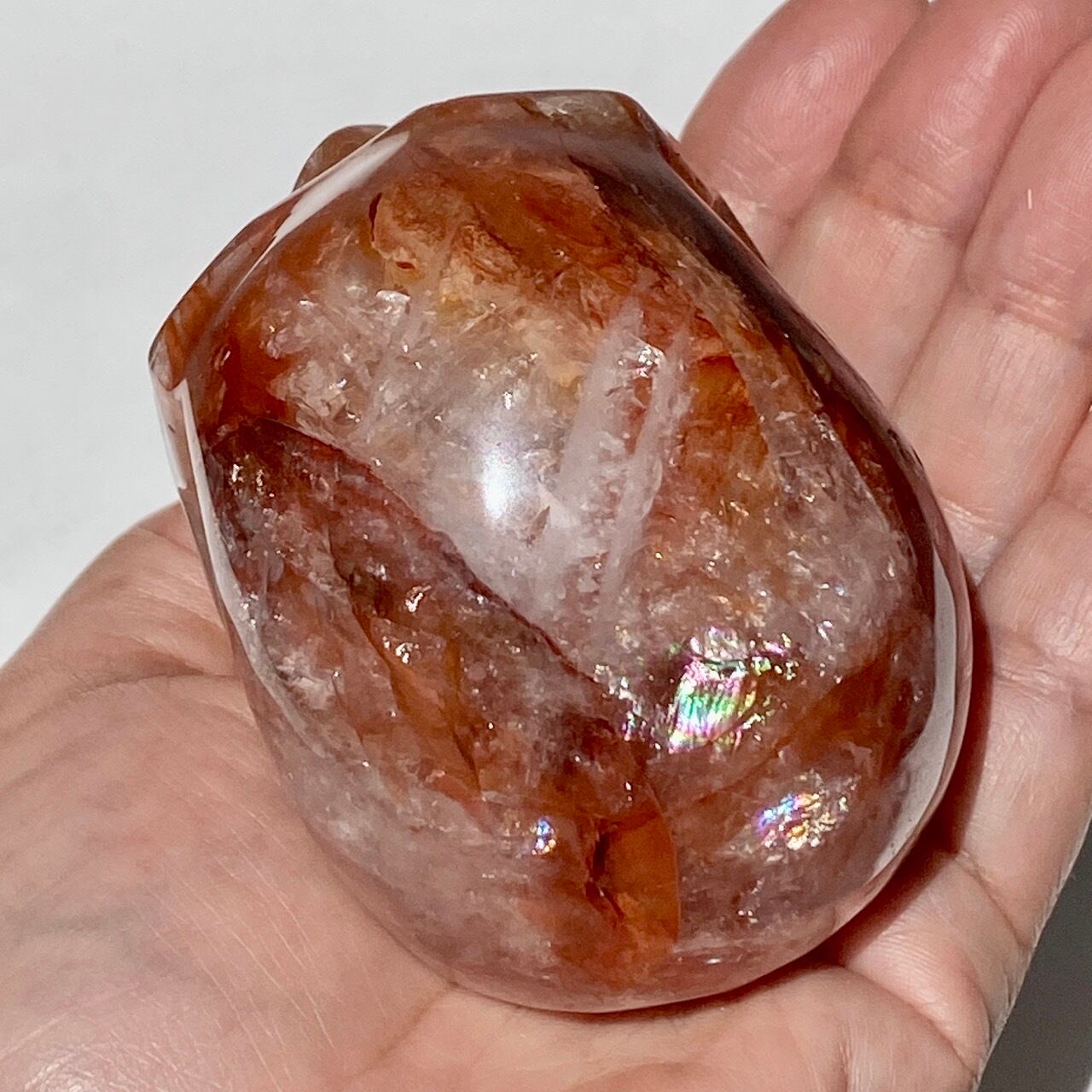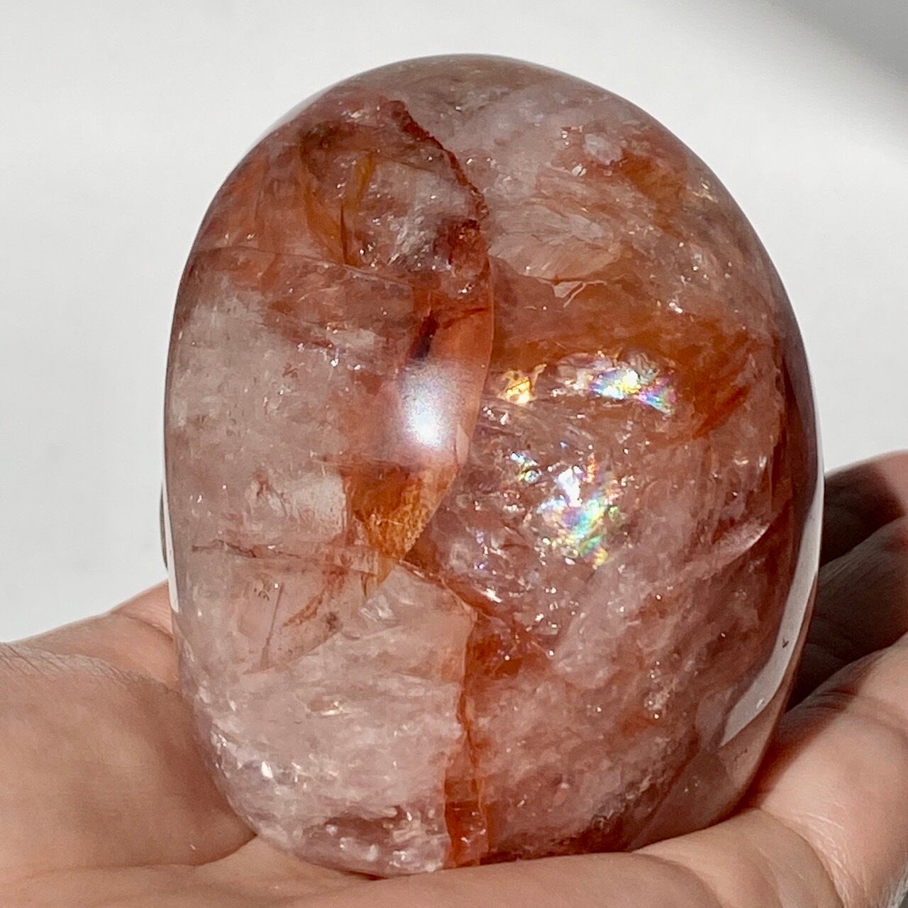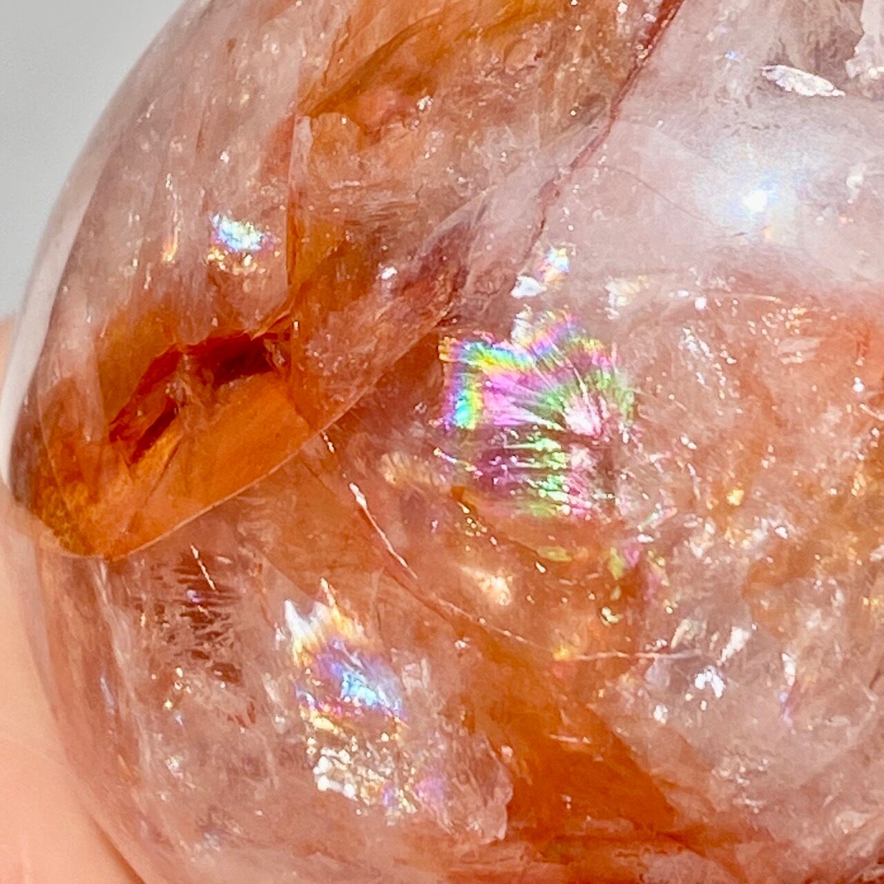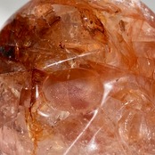 水晶に赤いレピドクロサイト(鱗鉄鉱)を内包する石で、その見た目から力強さを象徴し、持ち主に自信や決断力、そして前進する力をを与えてくれると言われています。