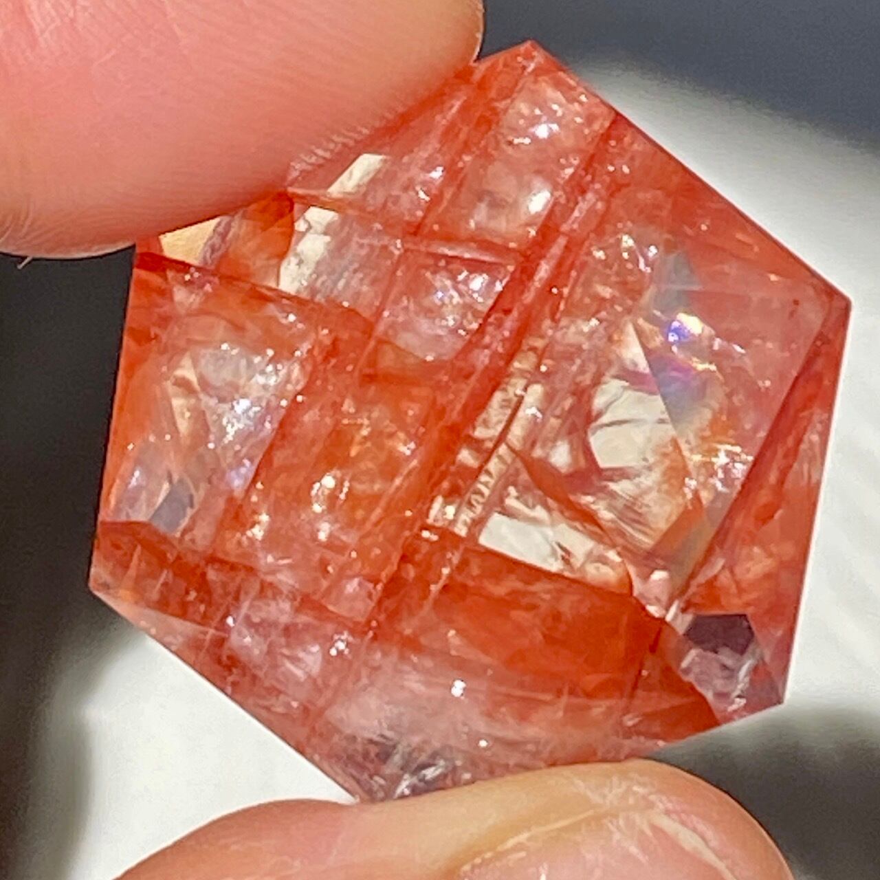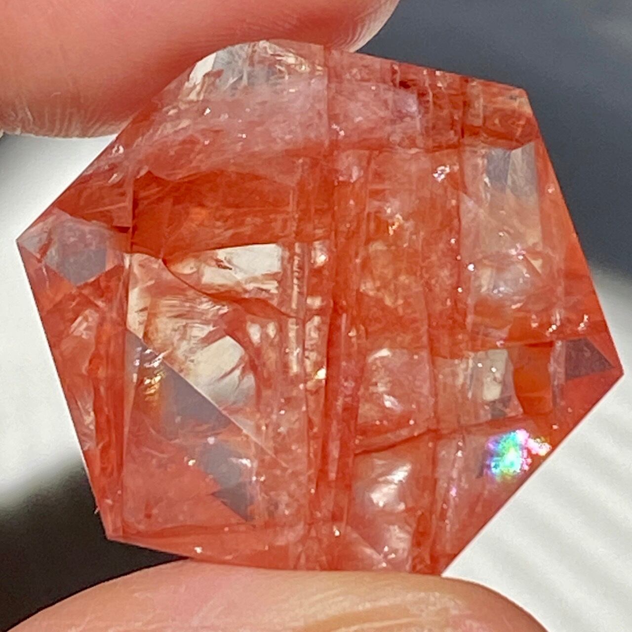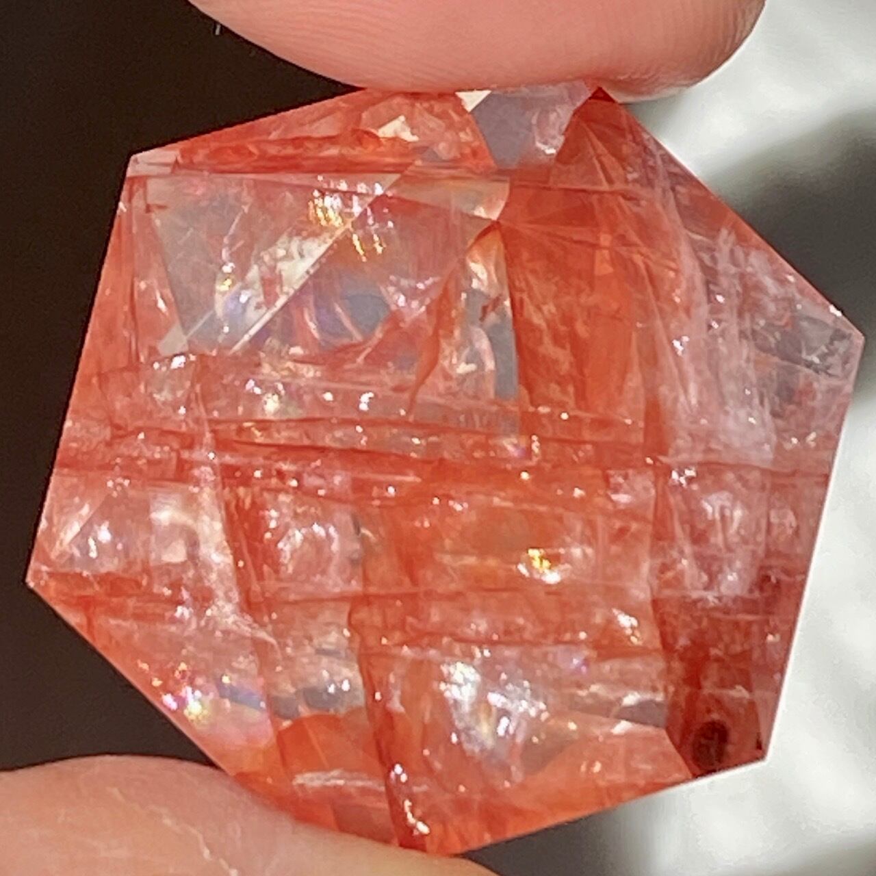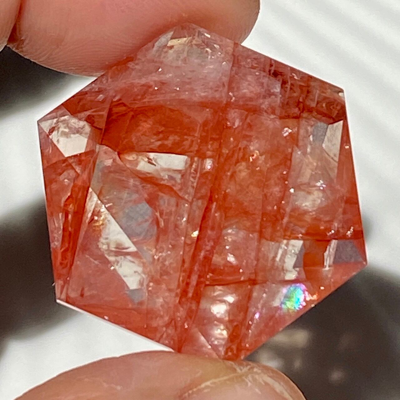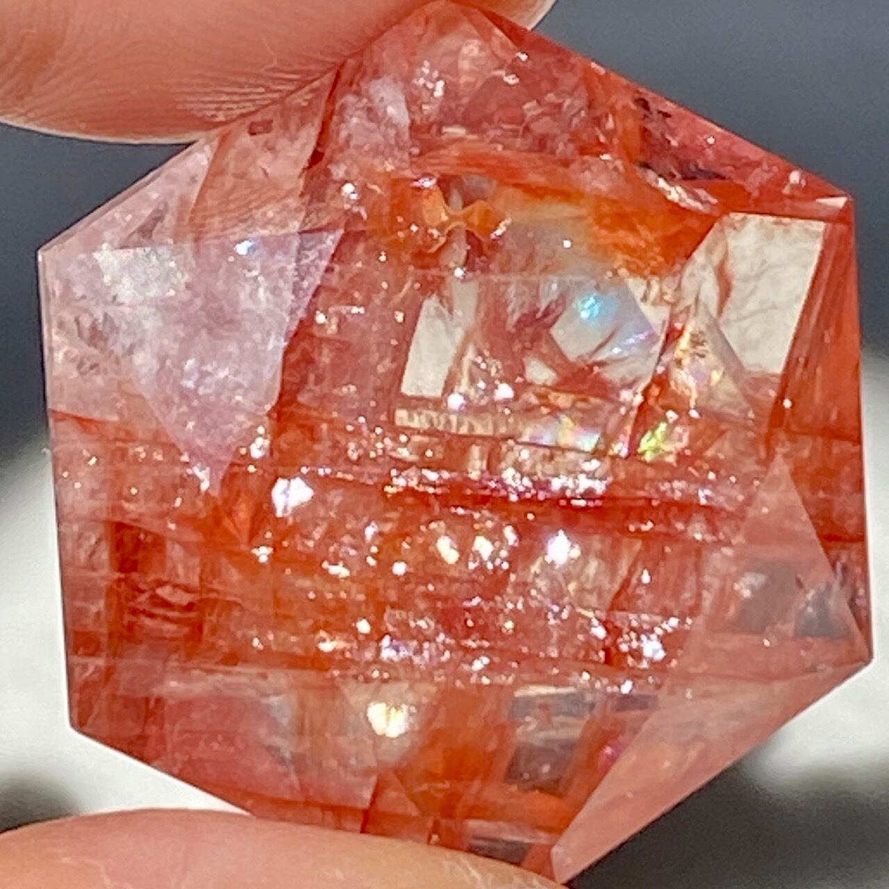 両面に面取りによりヘキサグラム(六芒星)が施された、ファイアークォーツのミニサイズのヘキサゴンになります。小さいながらもレインボー(虹)入りで、赤いインクルージョンがバランス良く入っている子です。角度を変えると沢山の細かい煌めきが楽しめますので、光にかざしてお楽しみ下さい。