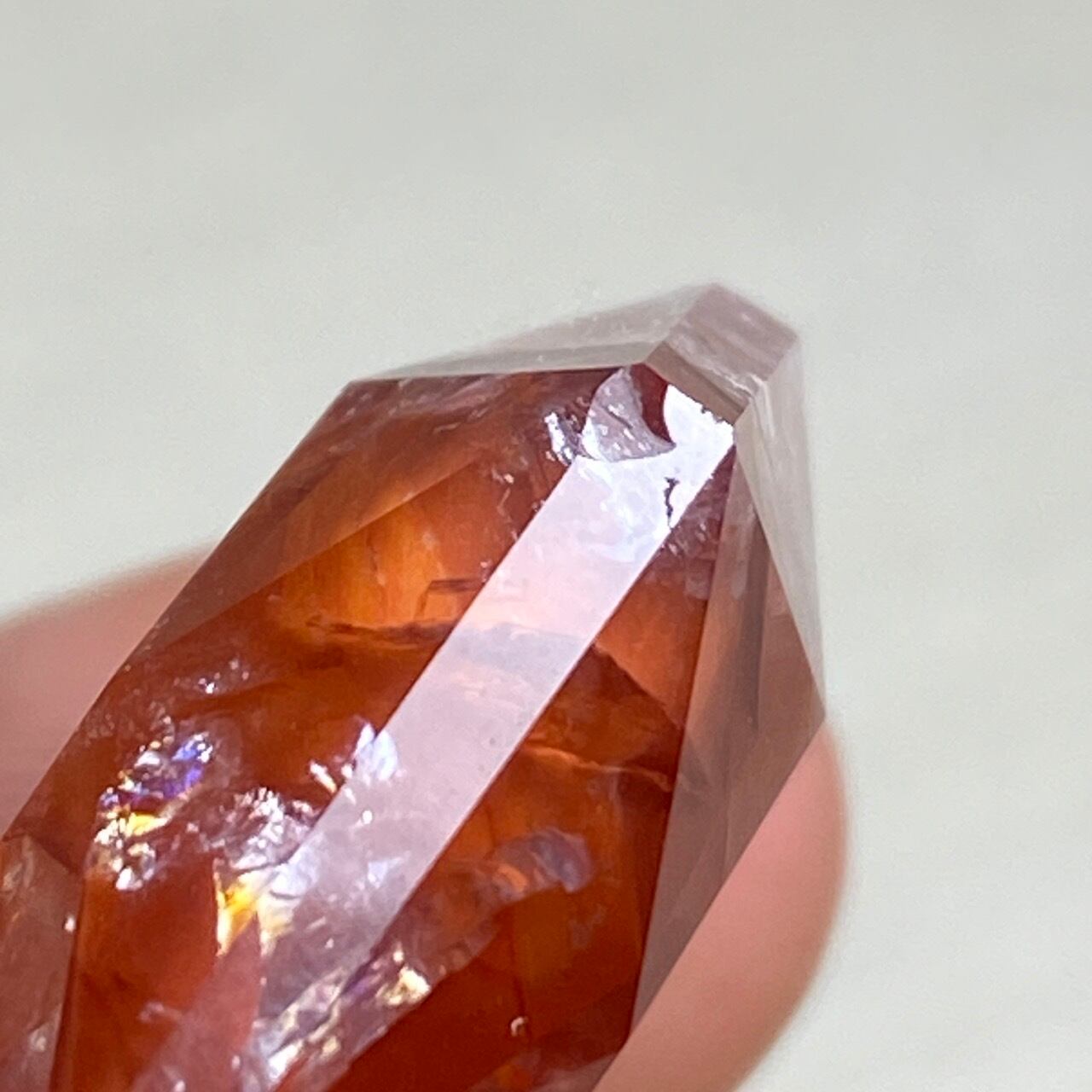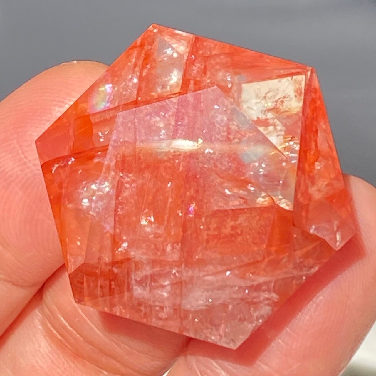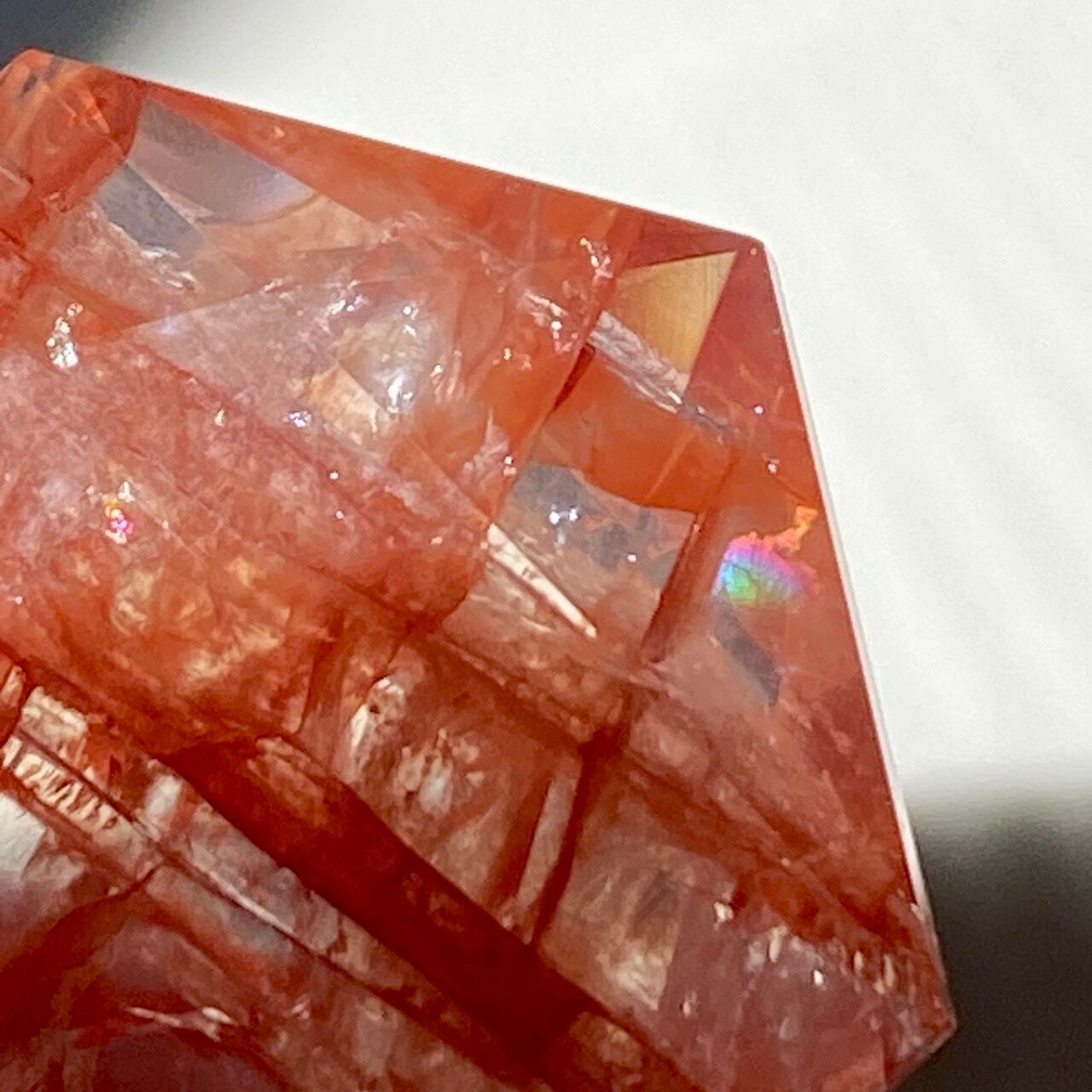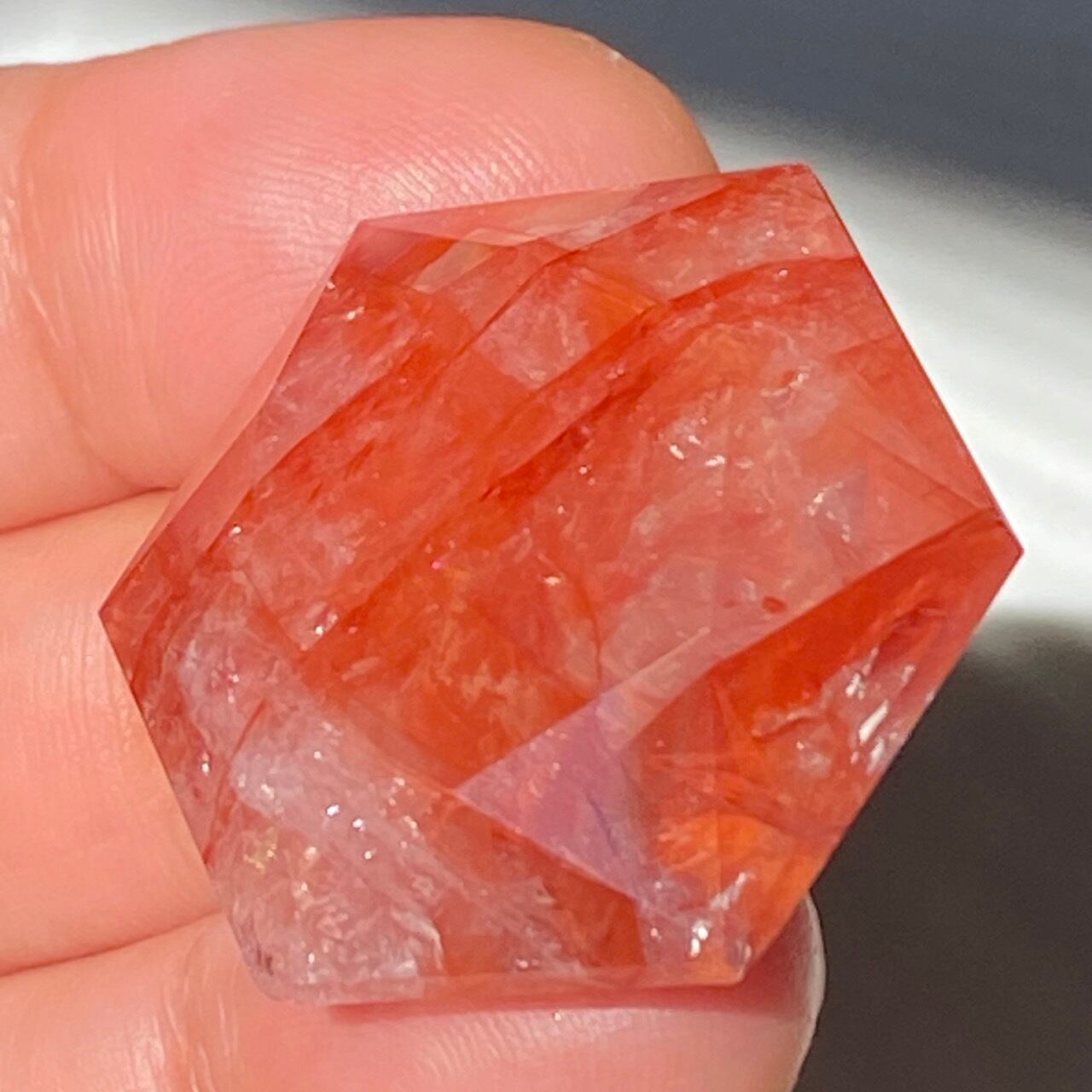 両面に面取りによりヘキサグラム(六芒星)が施された、ファイアークォーツのミニサイズのヘキサゴンになります。小さいながらもレインボー(虹)入りで、赤いインクルージョンがバランス良く入っている子です。角度を変えると沢山の細かい煌めきが楽しめますので、光にかざしてお楽しみ下さい。