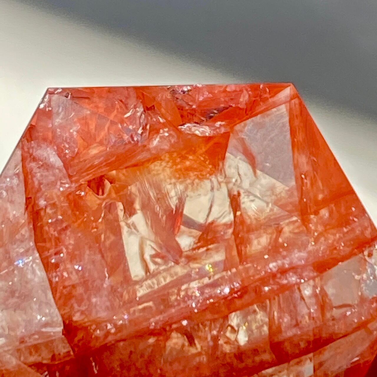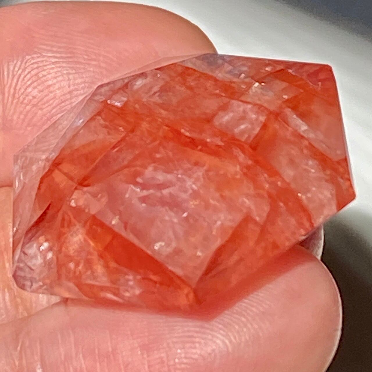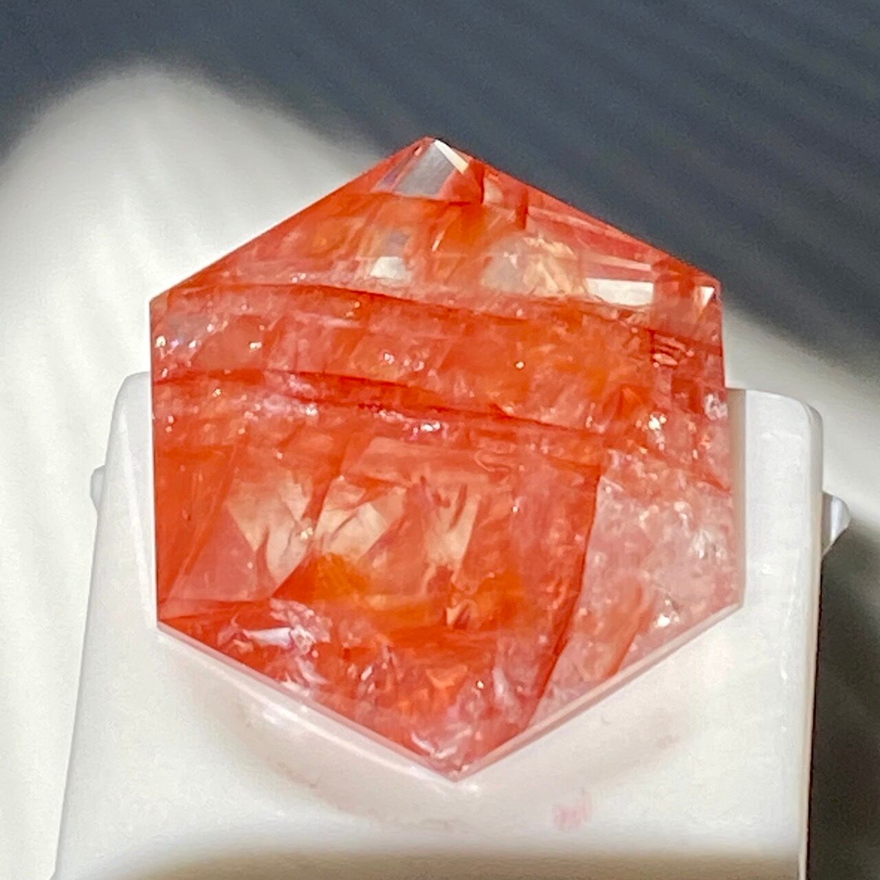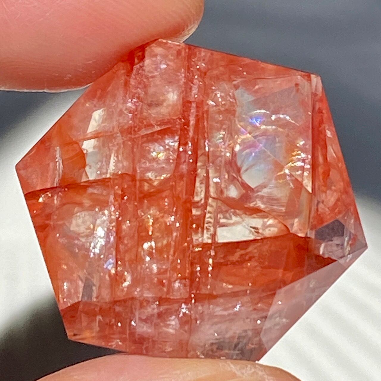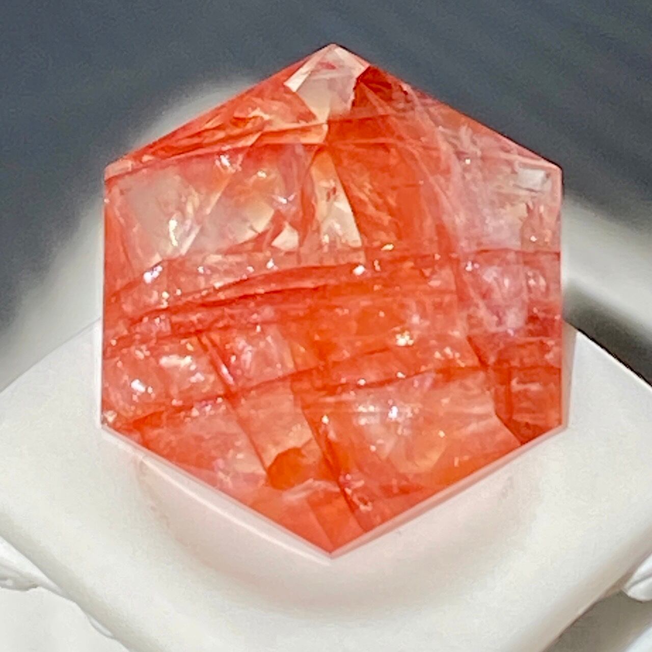 両面に面取りによりヘキサグラム(六芒星)が施された、ファイアークォーツのミニサイズのヘキサゴンになります。小さいながらもレインボー(虹)入りで、赤いインクルージョンがバランス良く入っている子です。角度を変えると沢山の細かい煌めきが楽しめますので、光にかざしてお楽しみ下さい。