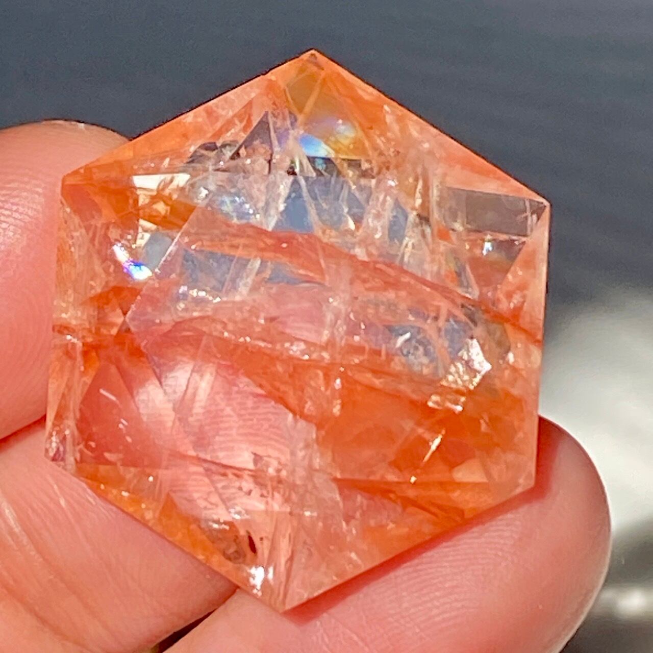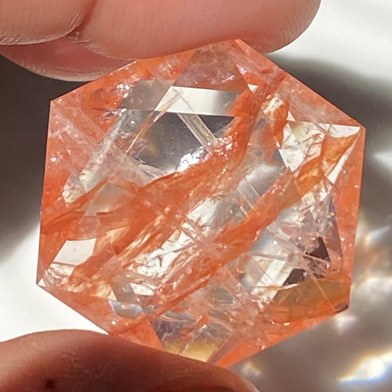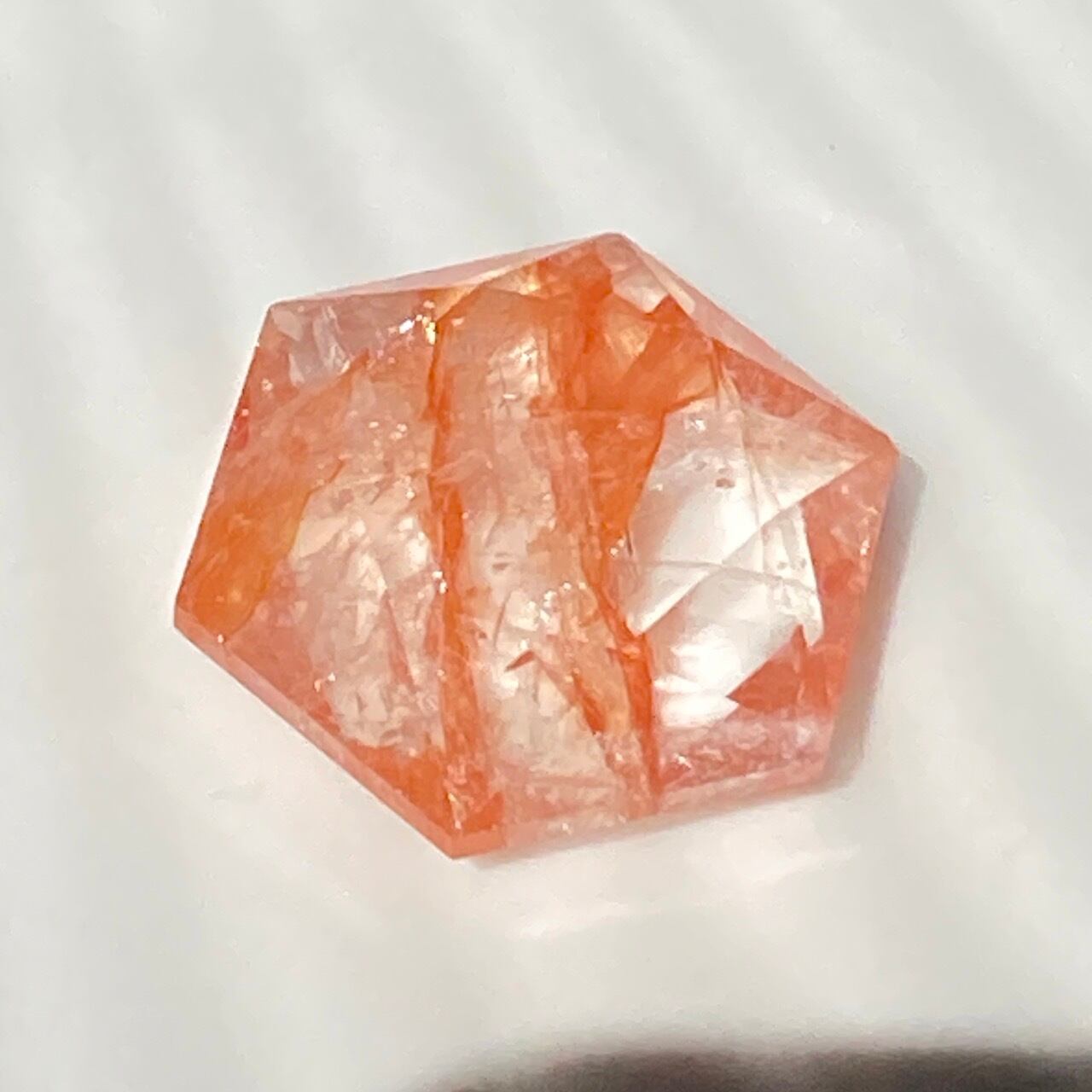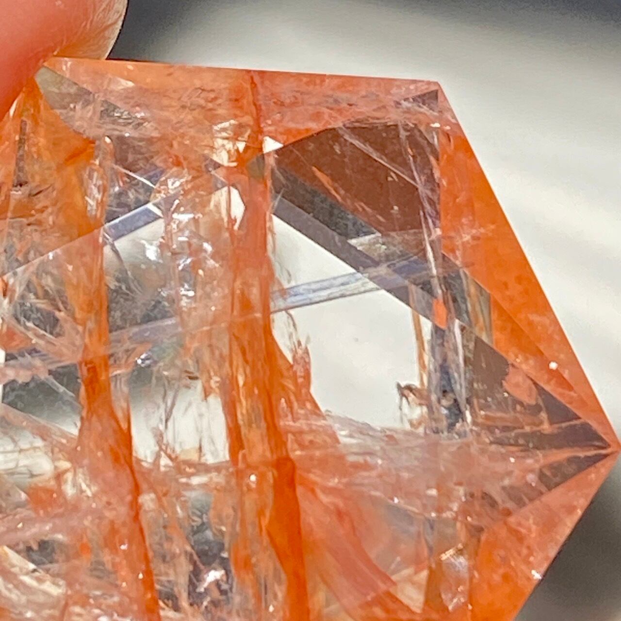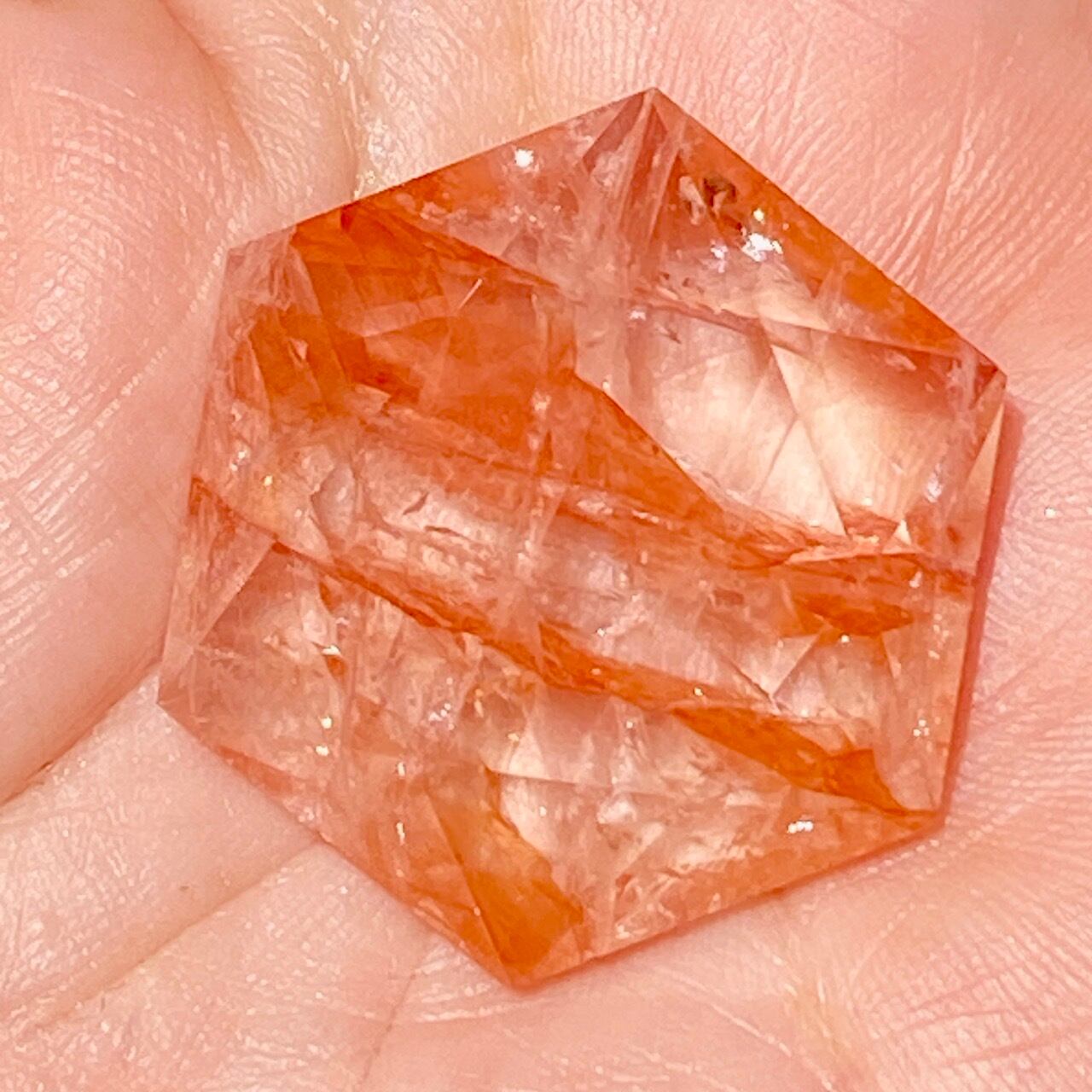 両面に面取りによりヘキサグラム(六芒星)が施された、ファイアークォーツのミニサイズのヘキサゴンになります。朱色のインクルージョンがさりげなく入っていて、その間からクォーツの抜群の透明感をお楽しみいただけます。小さな虹が数カ所入っているので、ひかりにかざして虹や面取りによるプリズムなど、表情をご確認ください。