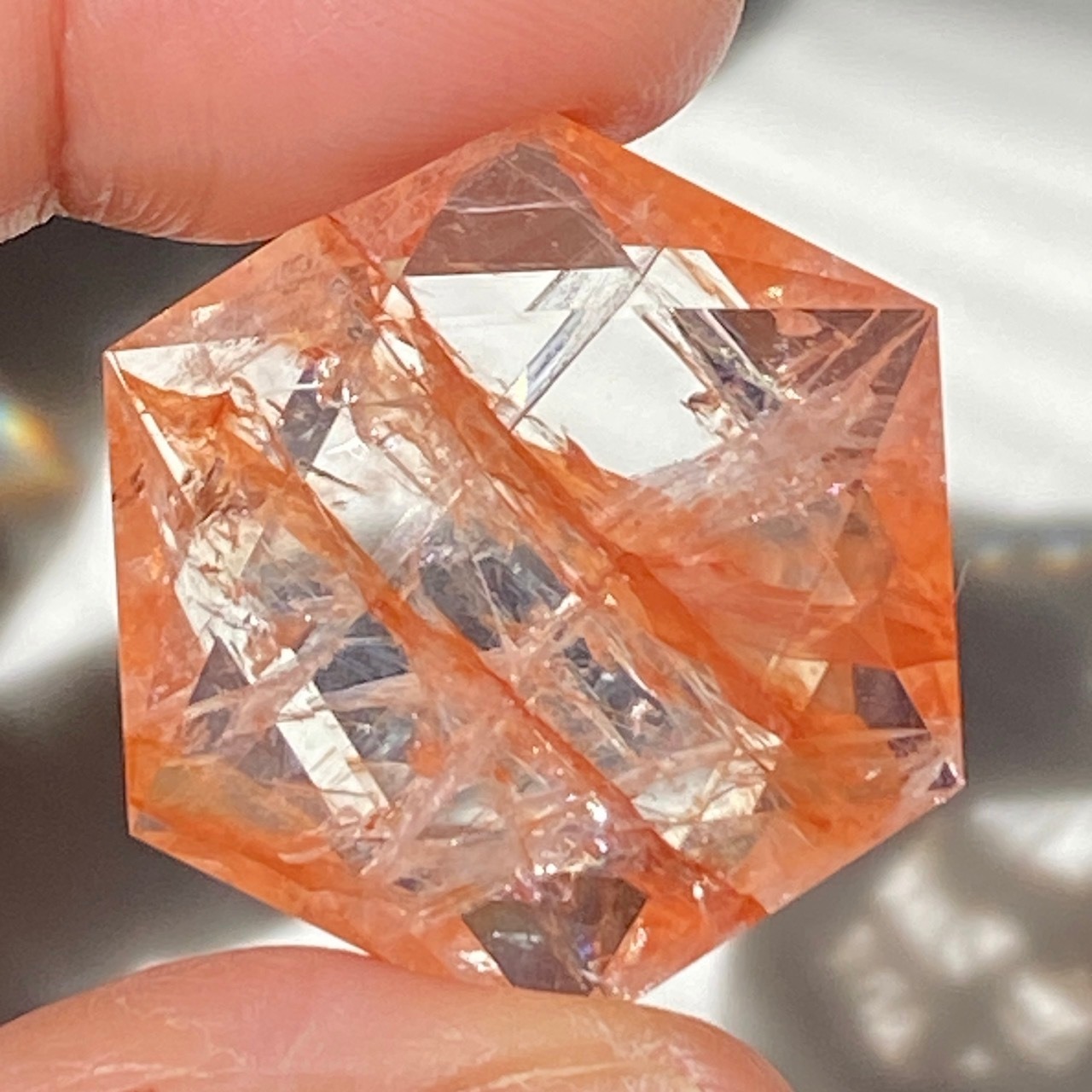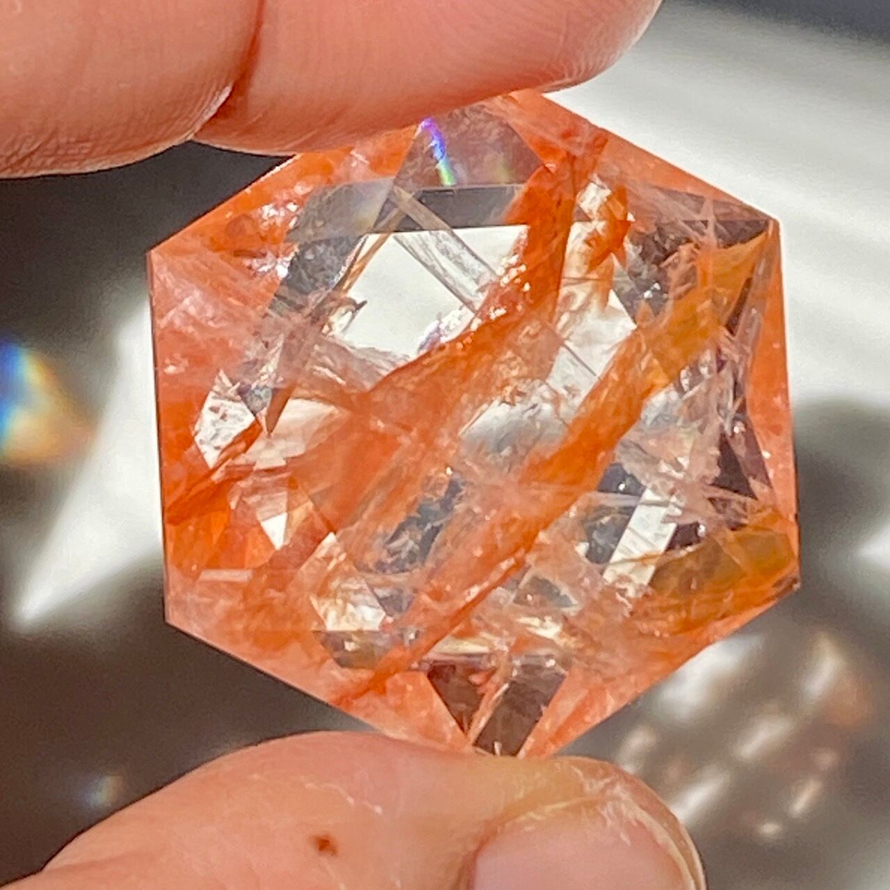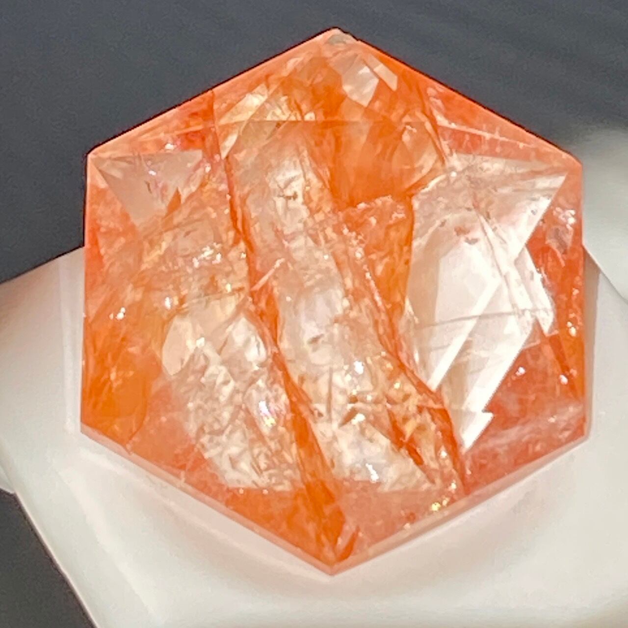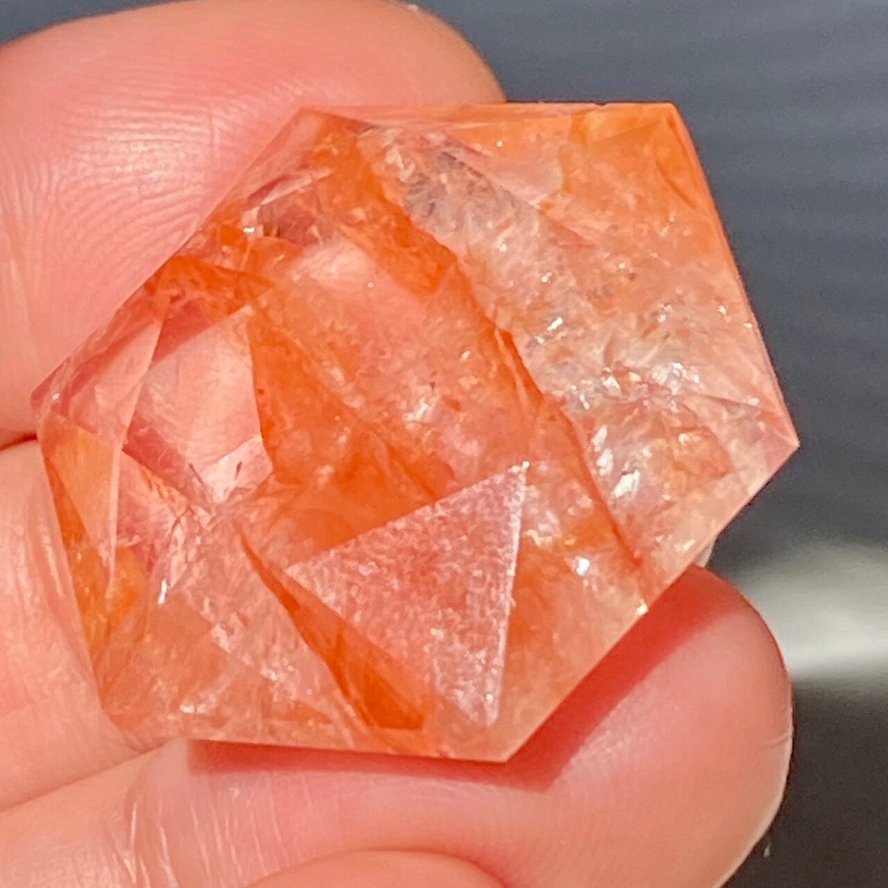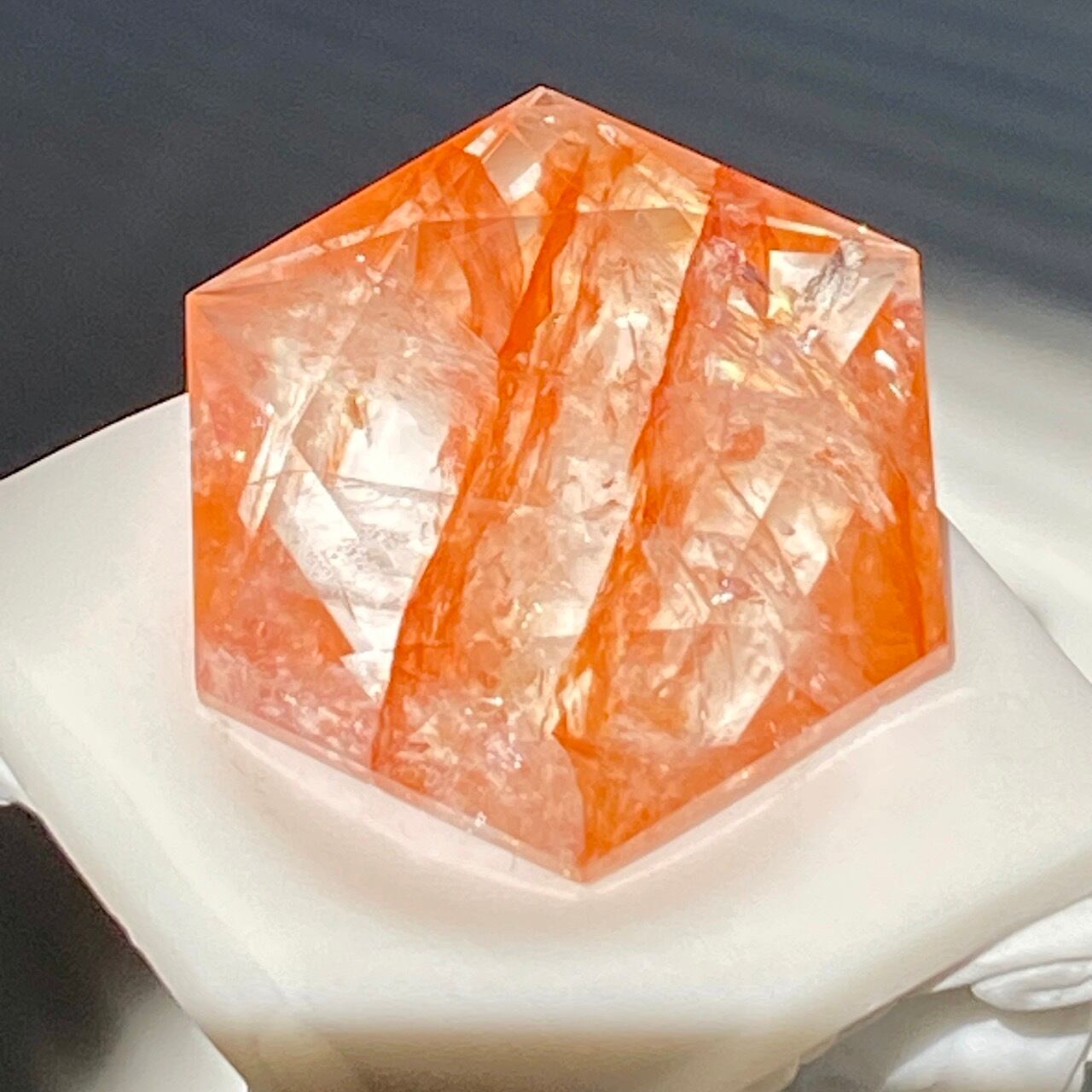 両面に面取りによりヘキサグラム(六芒星)が施された、ファイアークォーツのミニサイズのヘキサゴンになります。朱色のインクルージョンがさりげなく入っていて、その間からクォーツの抜群の透明感をお楽しみいただけます。小さな虹が数カ所入っているので、ひかりにかざして虹や面取りによるプリズムなど、表情をご確認ください。