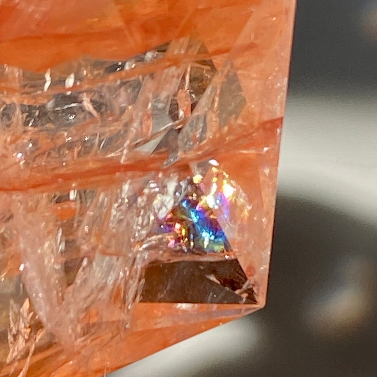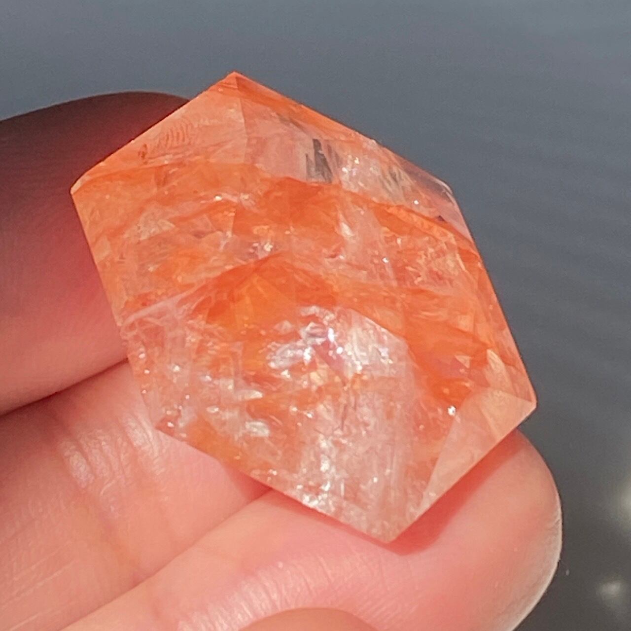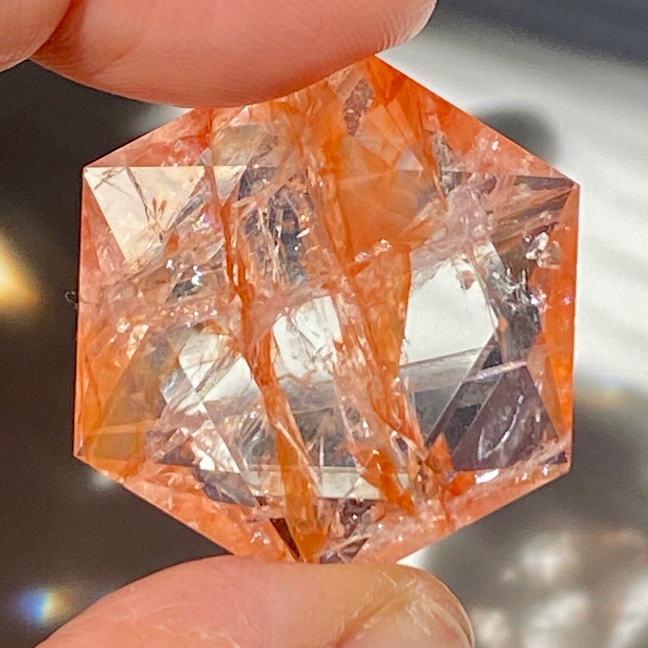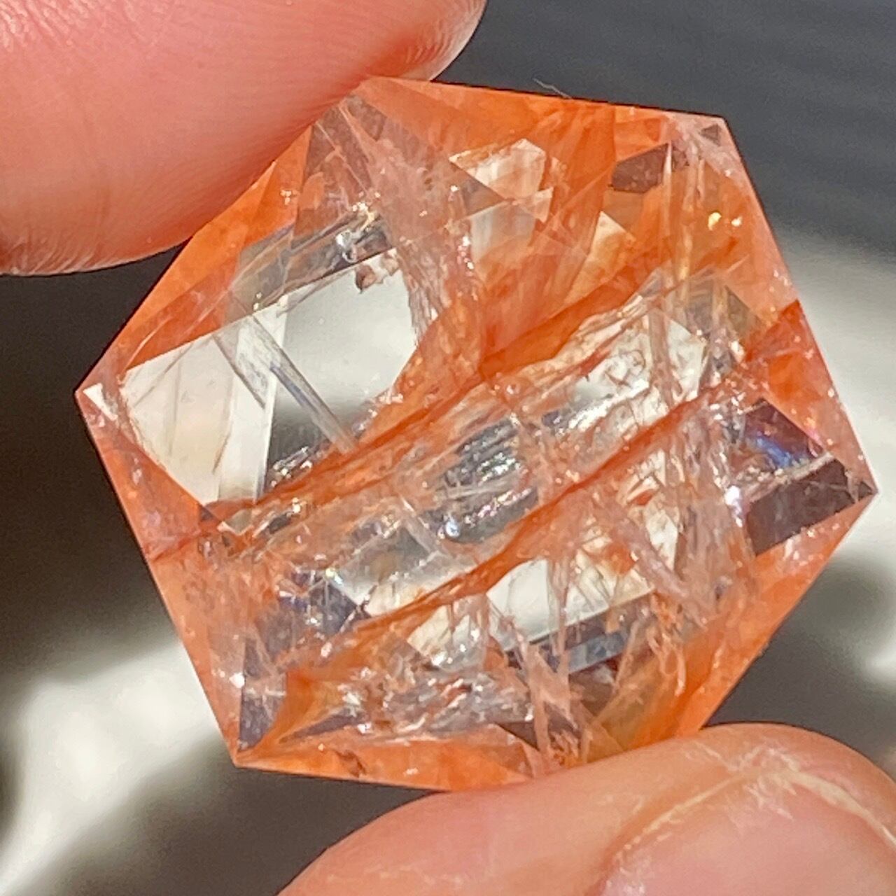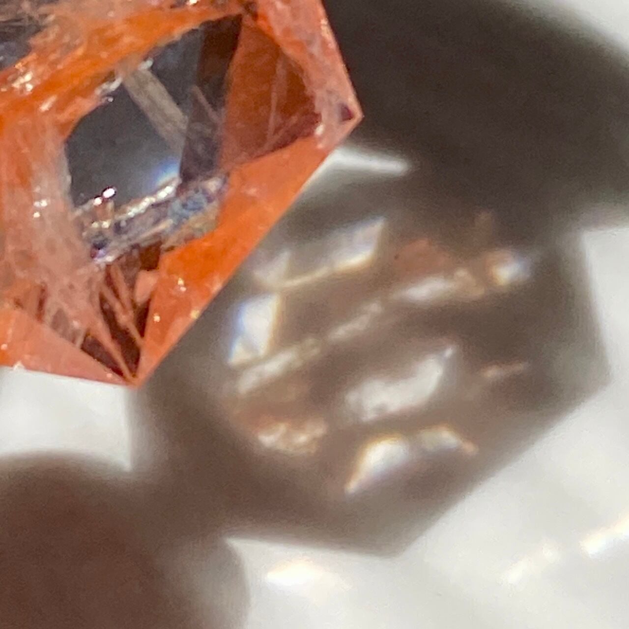 両面に面取りによりヘキサグラム(六芒星)が施された、ファイアークォーツのミニサイズのヘキサゴンになります。朱色のインクルージョンがさりげなく入っていて、その間からクォーツの抜群の透明感をお楽しみいただけます。小さな虹が数カ所入っているので、ひかりにかざして虹や面取りによるプリズムなど、表情をご確認ください。