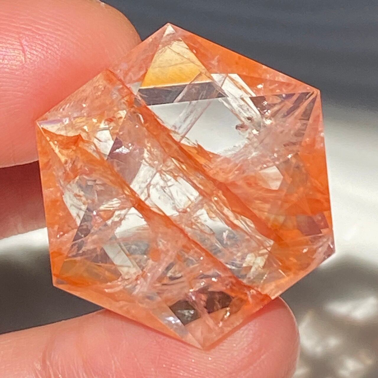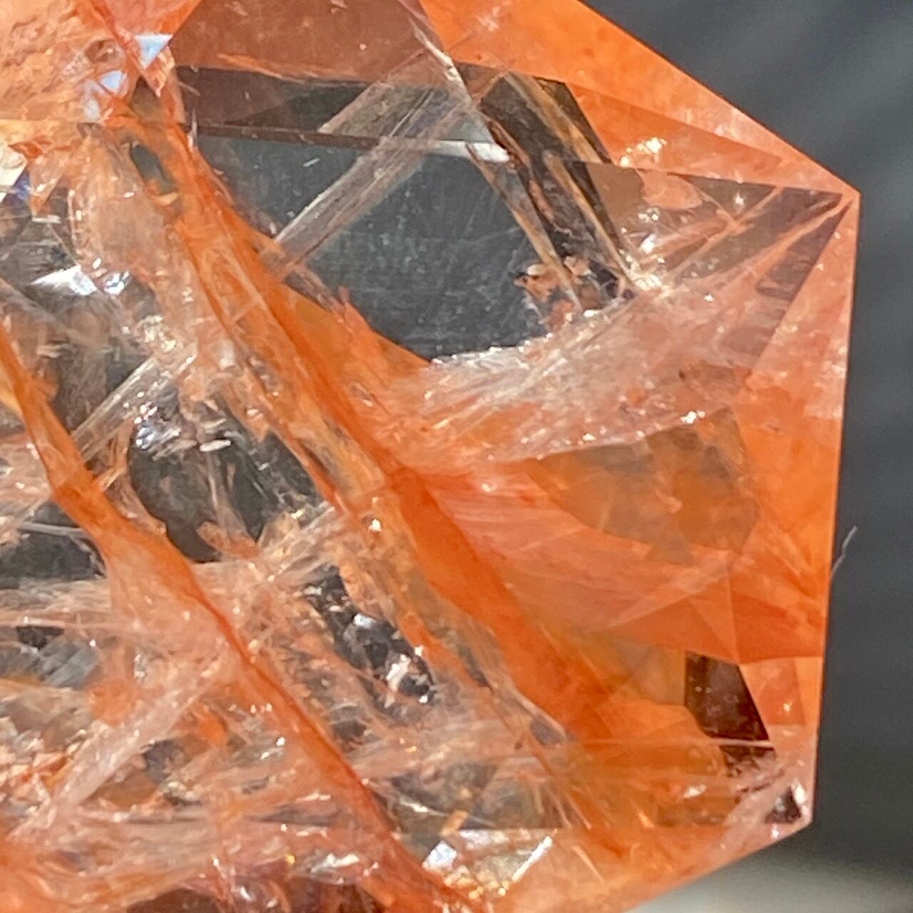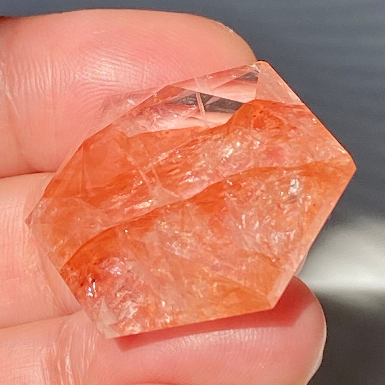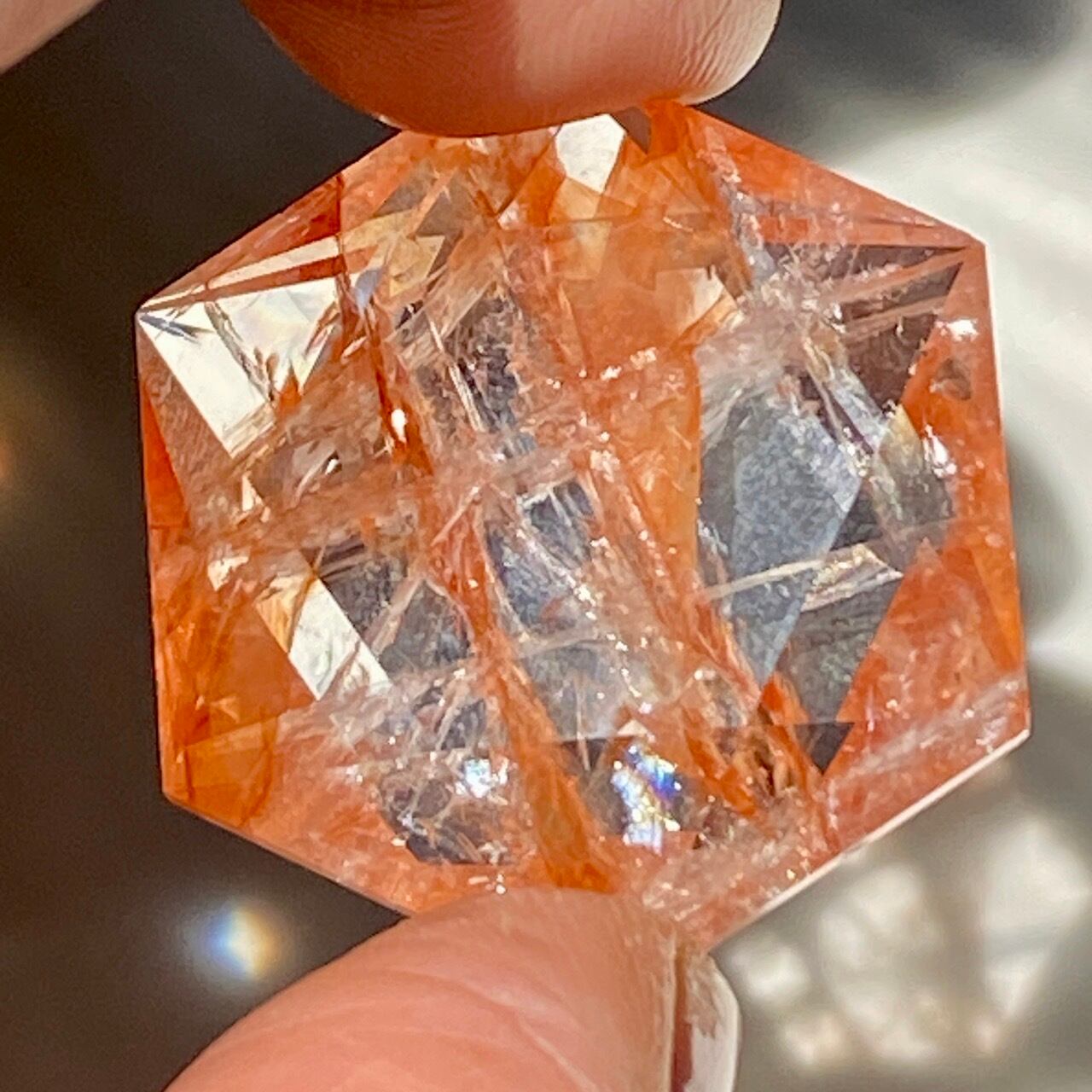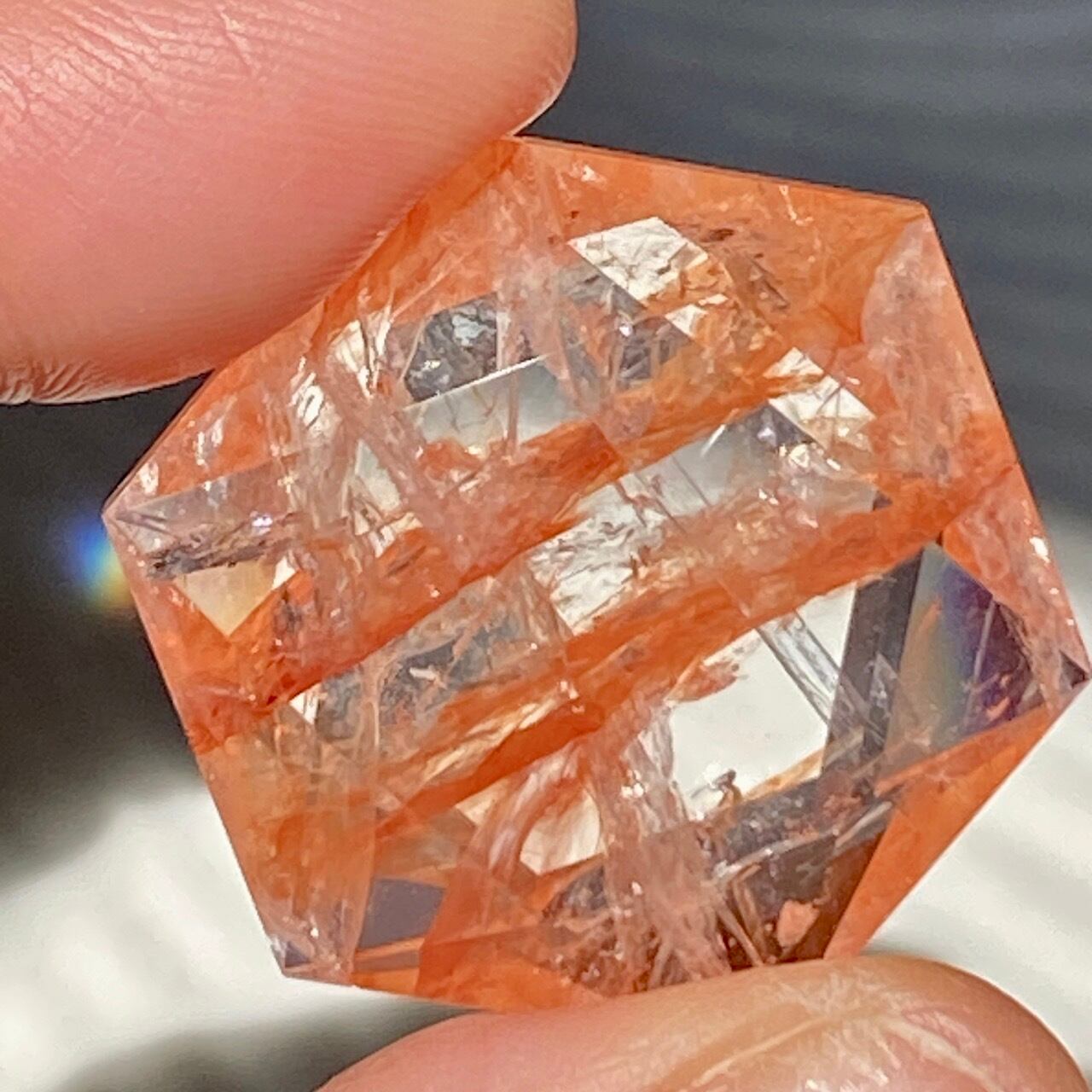 両面に面取りによりヘキサグラム(六芒星)が施された、ファイアークォーツのミニサイズのヘキサゴンになります。朱色のインクルージョンがさりげなく入っていて、その間からクォーツの抜群の透明感をお楽しみいただけます。小さな虹が数カ所入っているので、ひかりにかざして虹や面取りによるプリズムなど、表情をご確認ください。