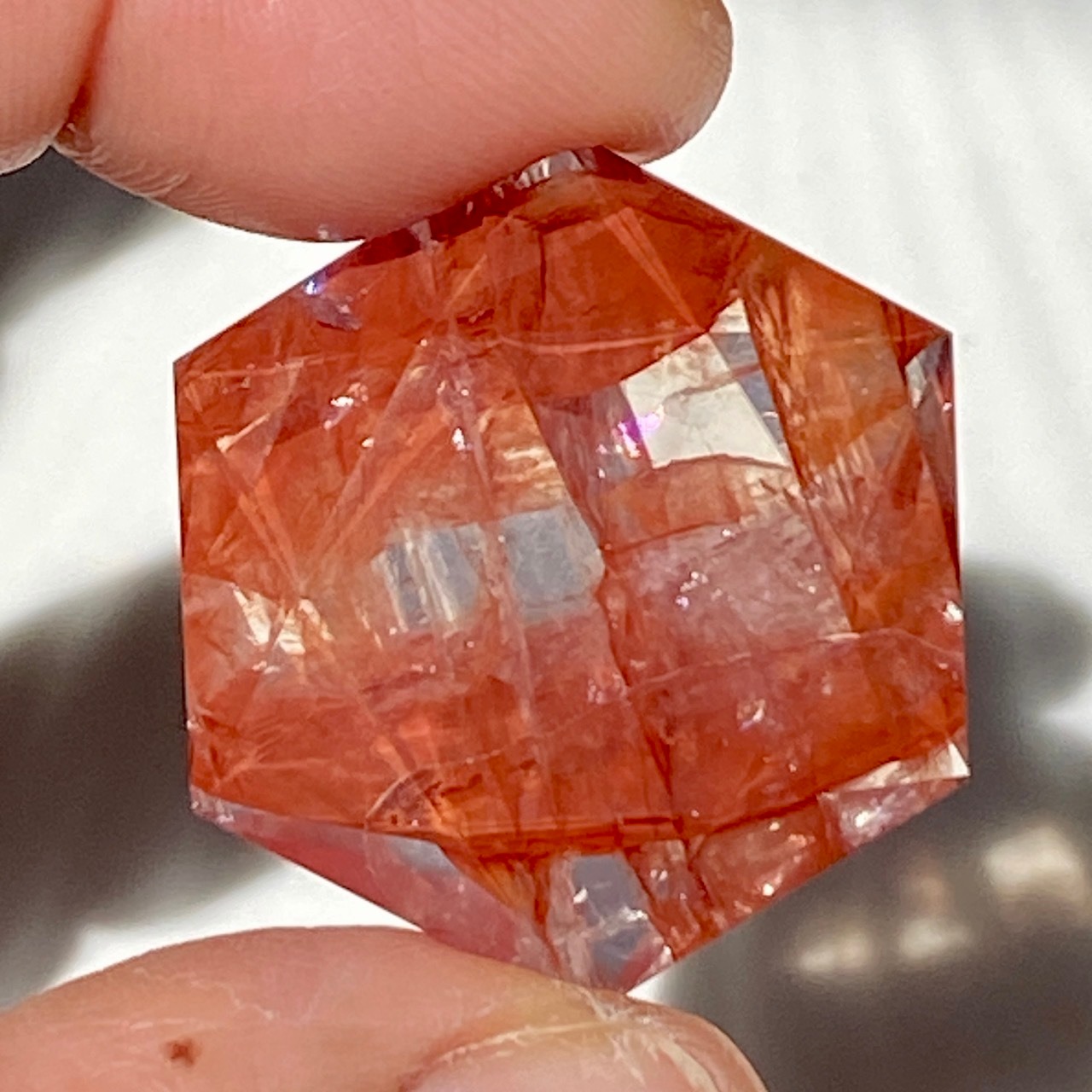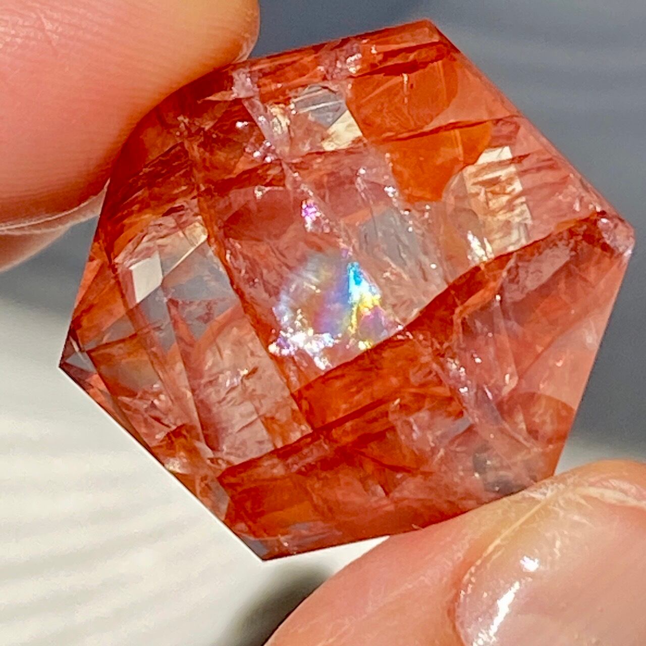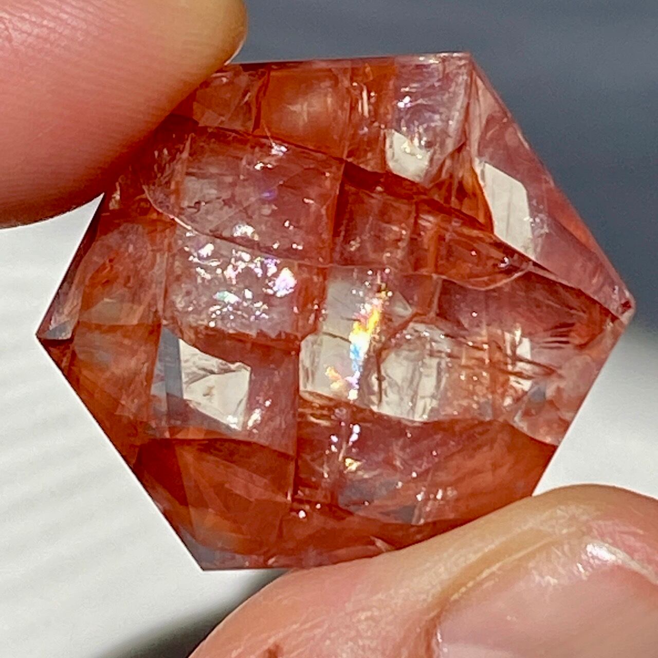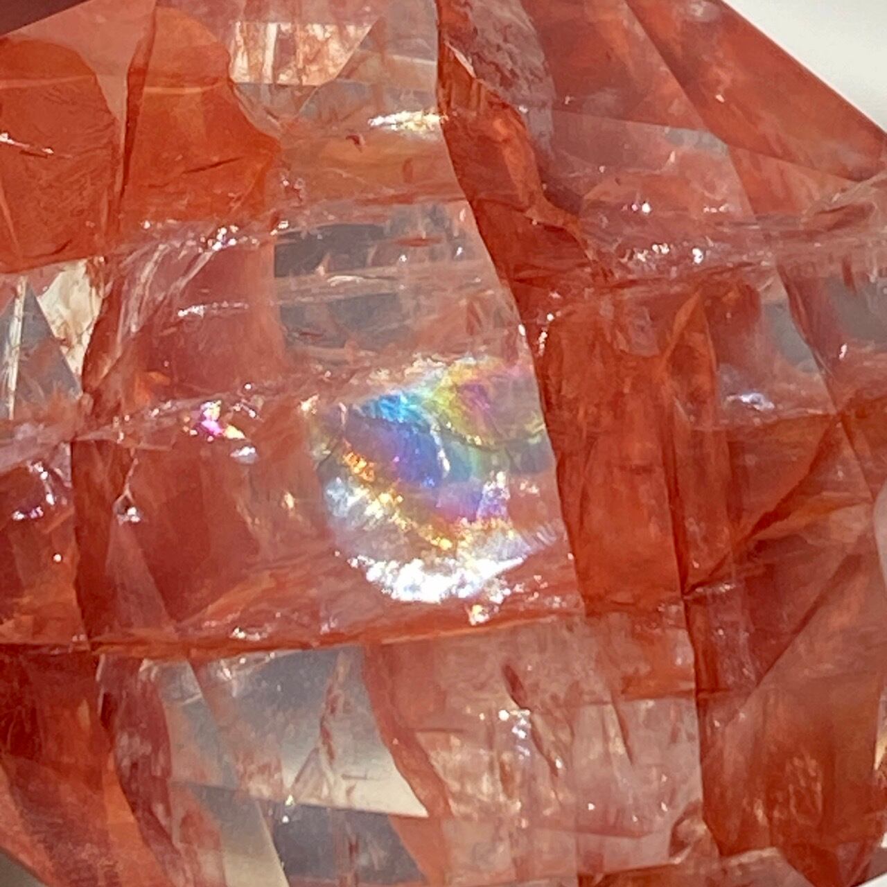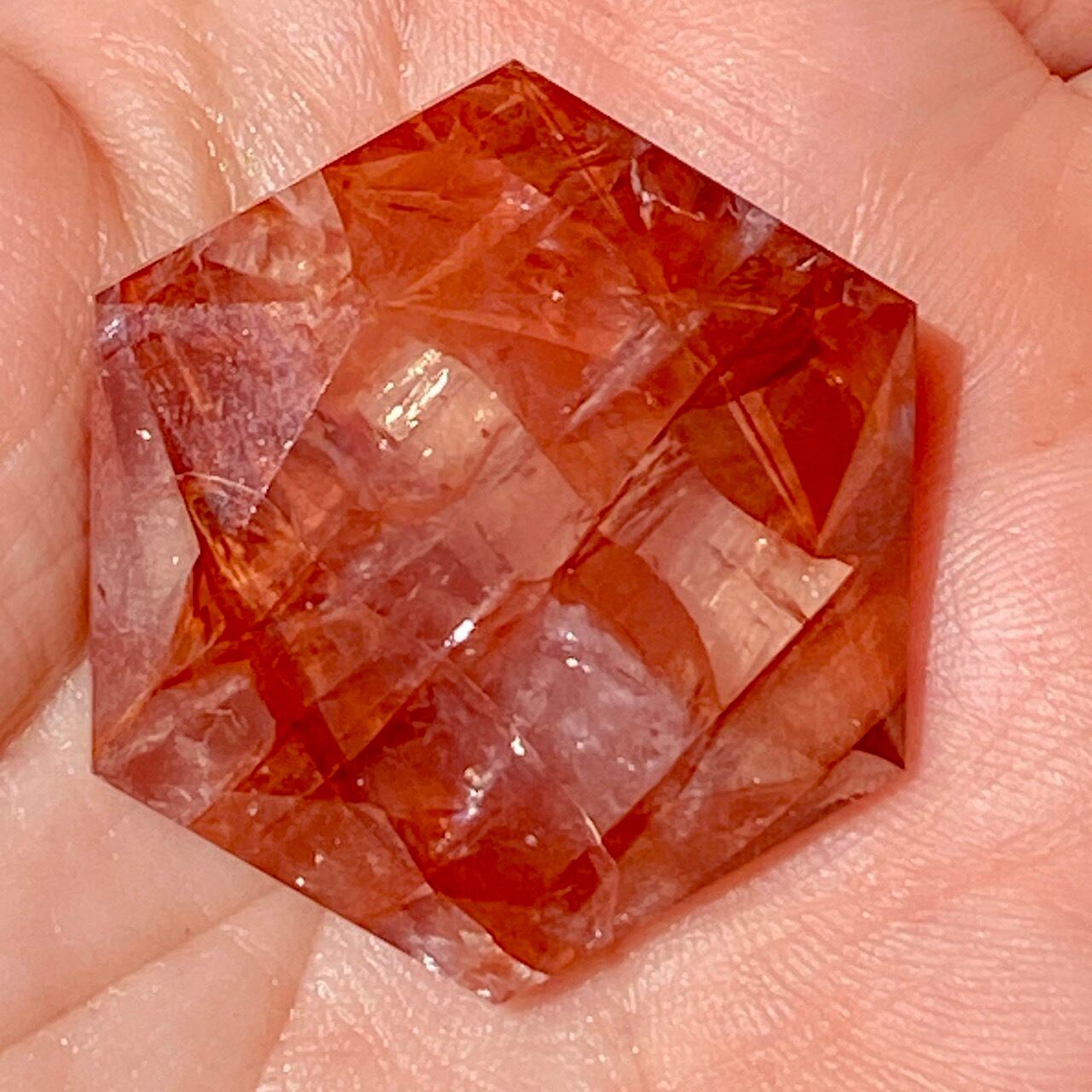 両面に面取りによりヘキサグラム(六芒星)が施された、ファイアークォーツのミニサイズのヘキサゴンになります。複数のレインボー(虹)入りで、惜しみなく入っている赤いインクルージョンの間からクォーツの透明感を楽しめます。角度を変えて表情の変化や煌めきを愛でて頂けると嬉しいです♡