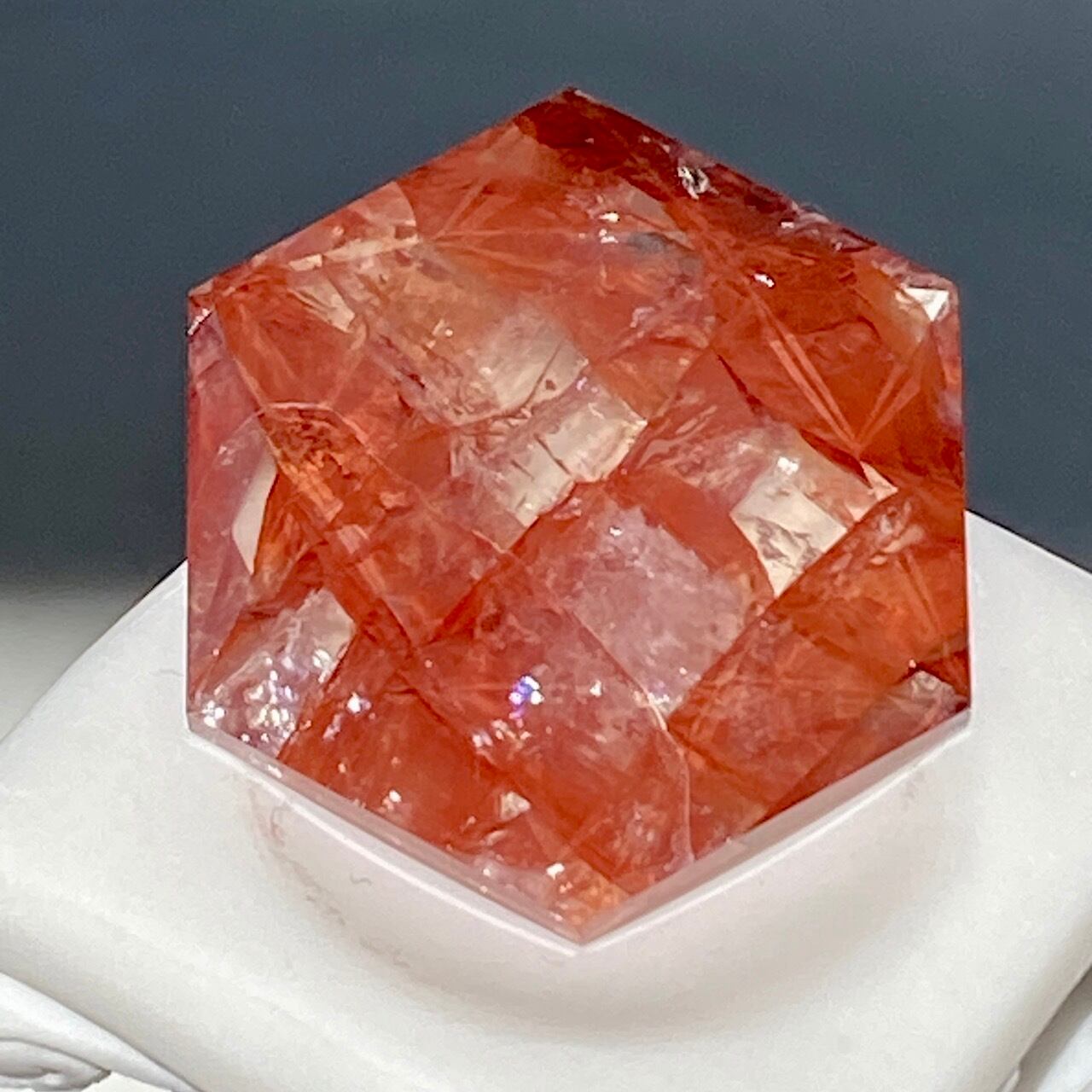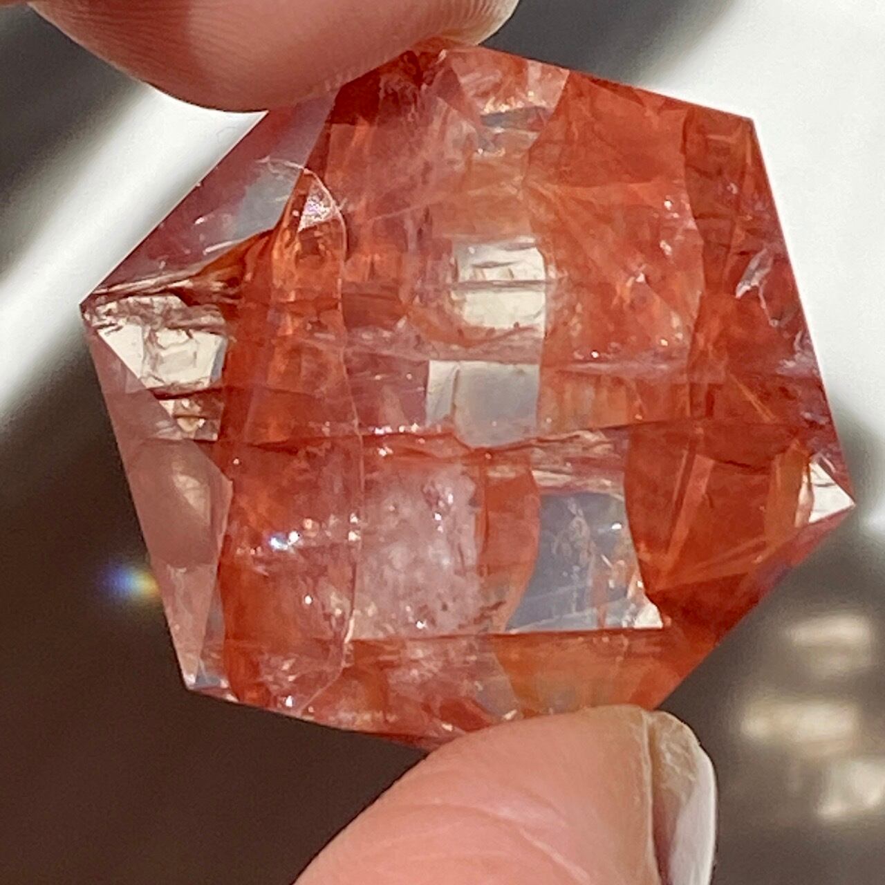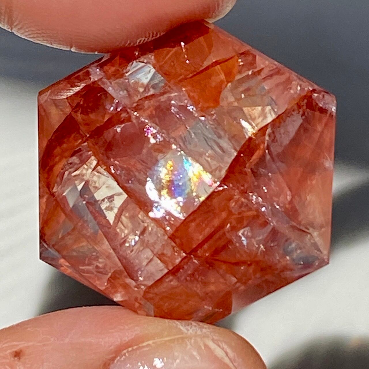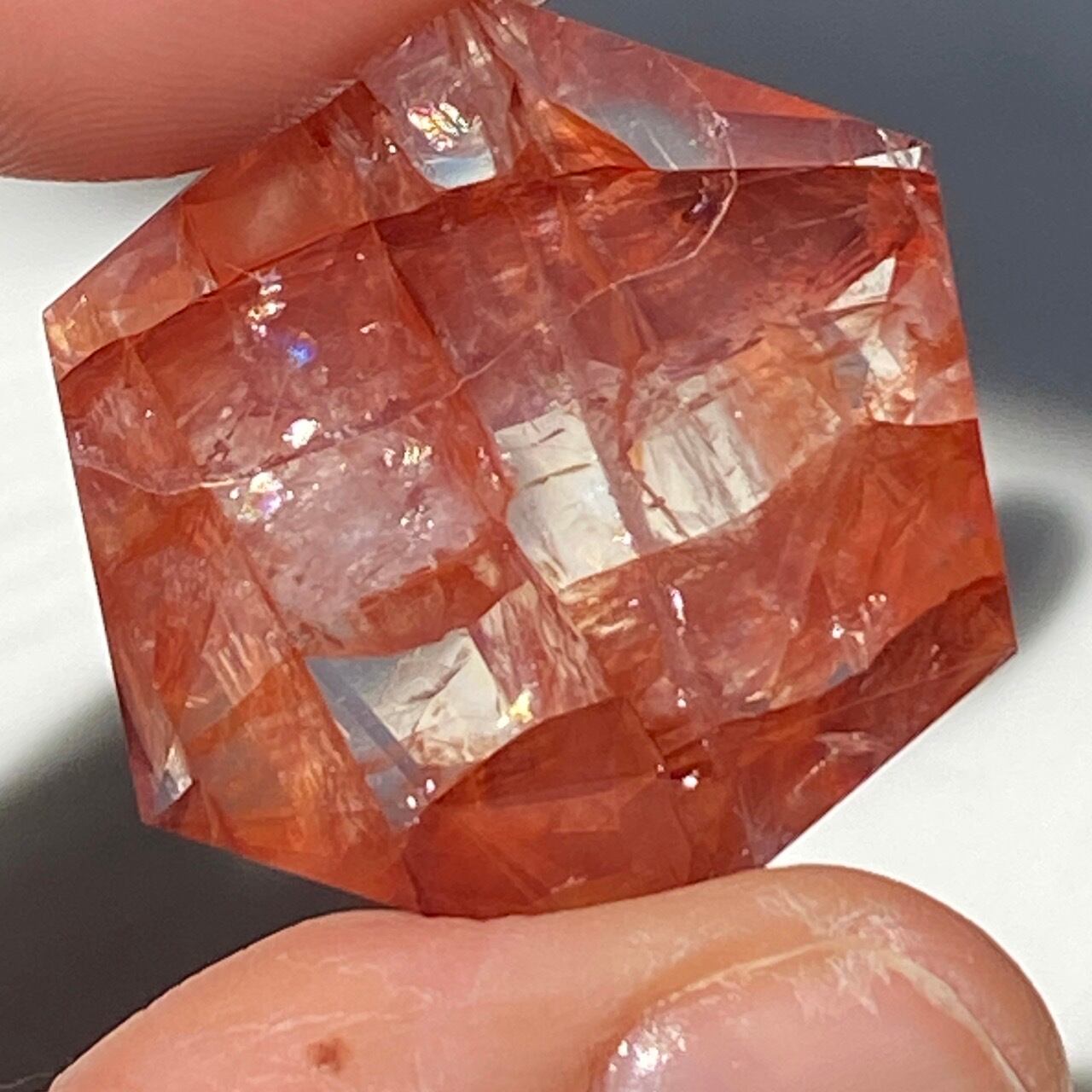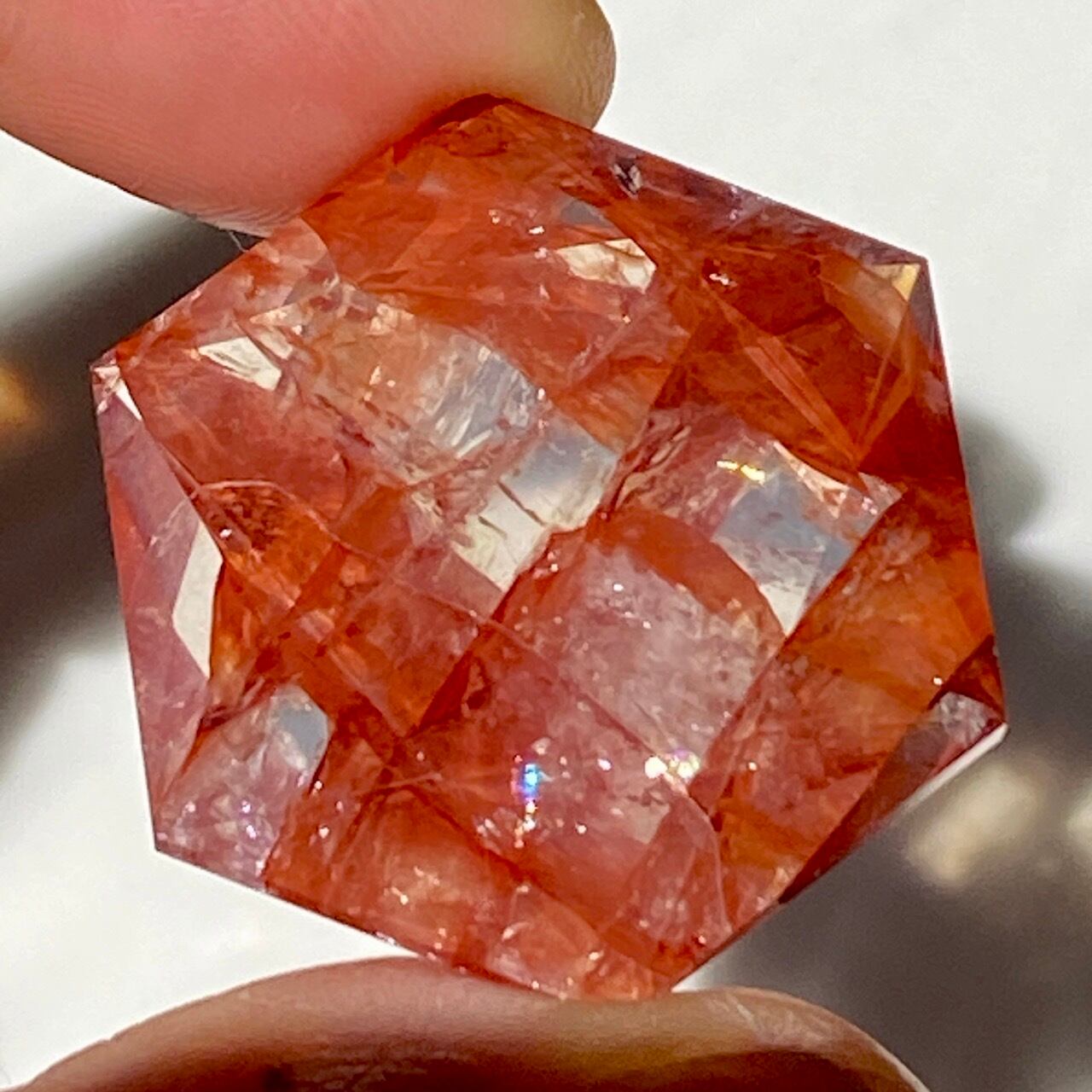 両面に面取りによりヘキサグラム(六芒星)が施された、ファイアークォーツのミニサイズのヘキサゴンになります。複数のレインボー(虹)入りで、惜しみなく入っている赤いインクルージョンの間からクォーツの透明感を楽しめます。角度を変えて表情の変化や煌めきを愛でて頂けると嬉しいです♡