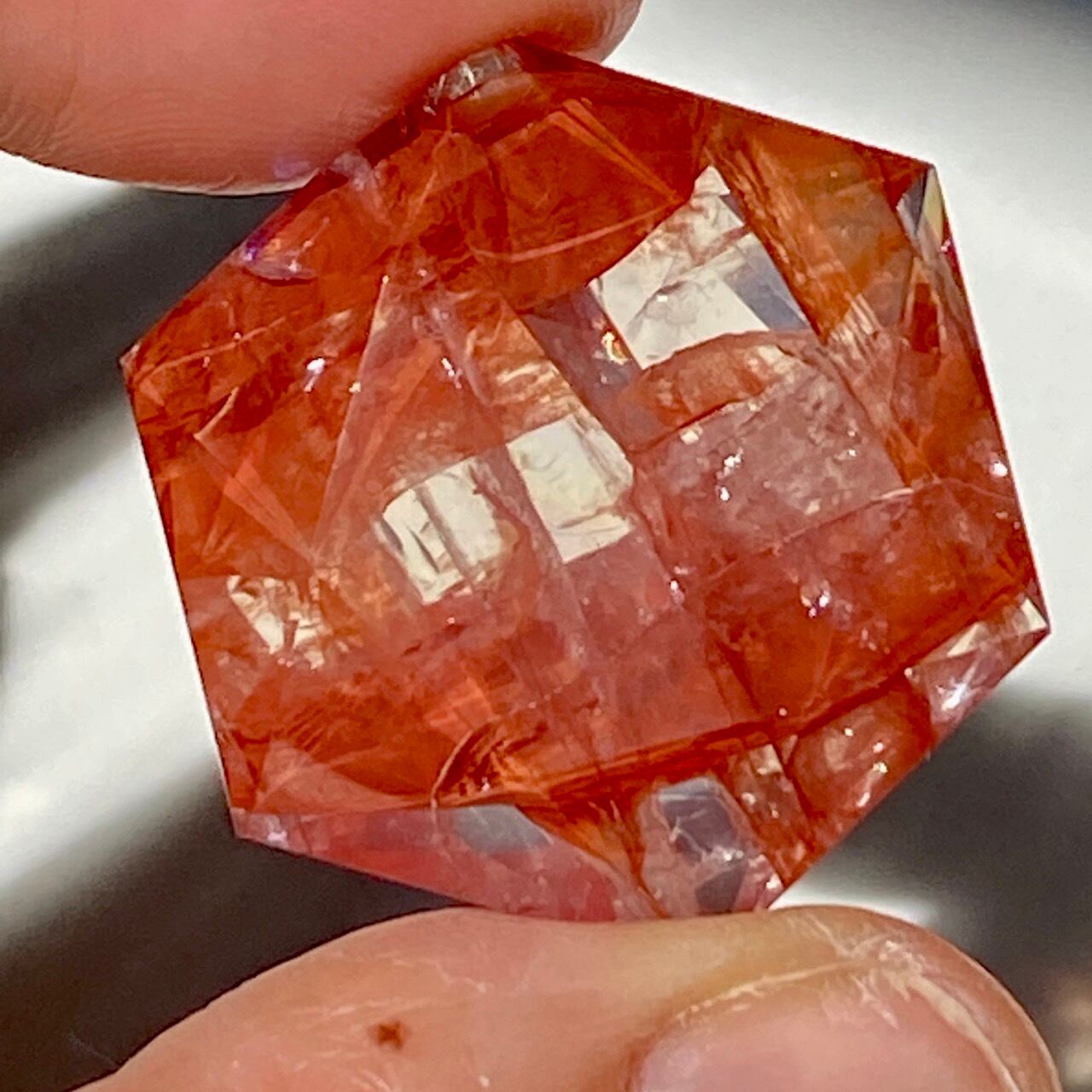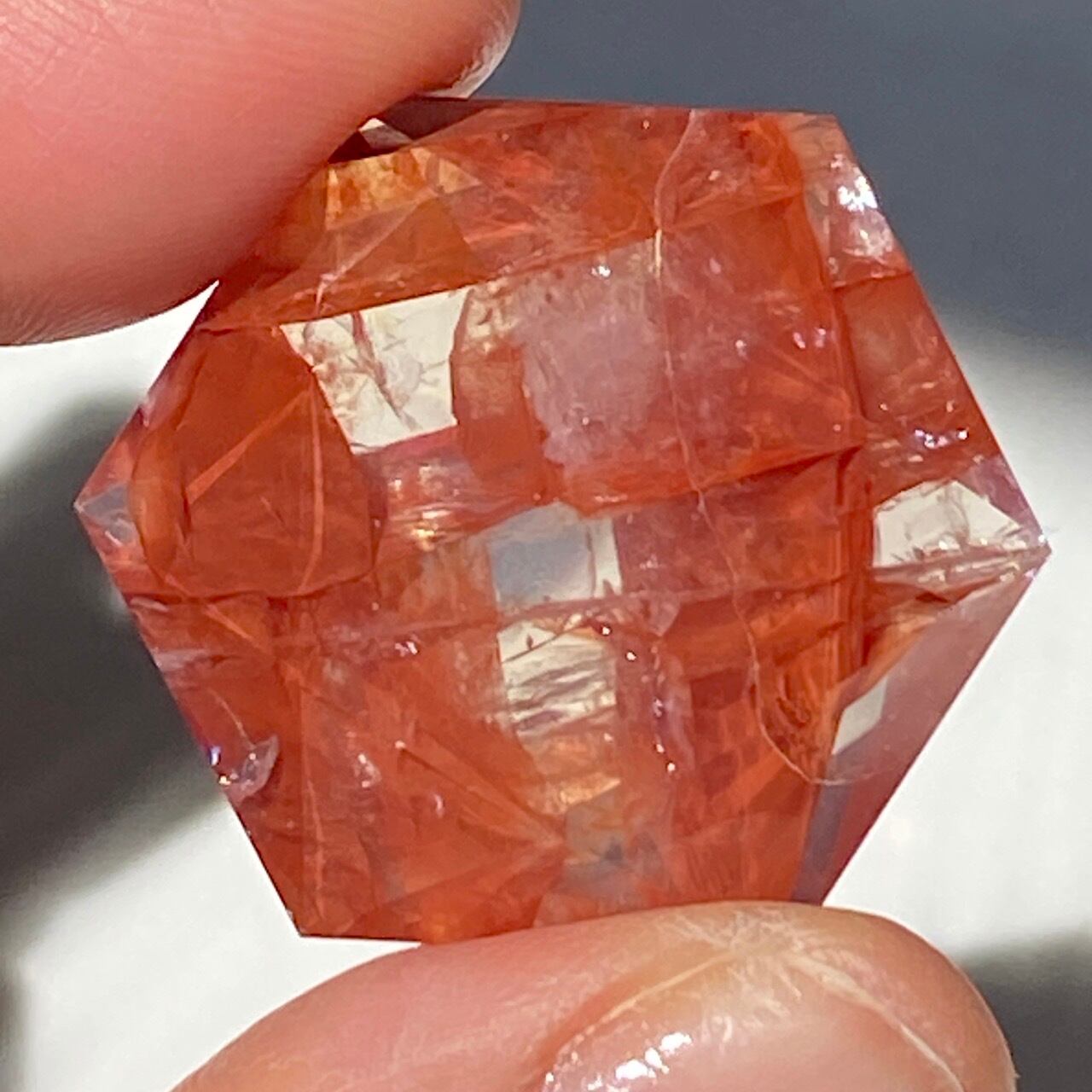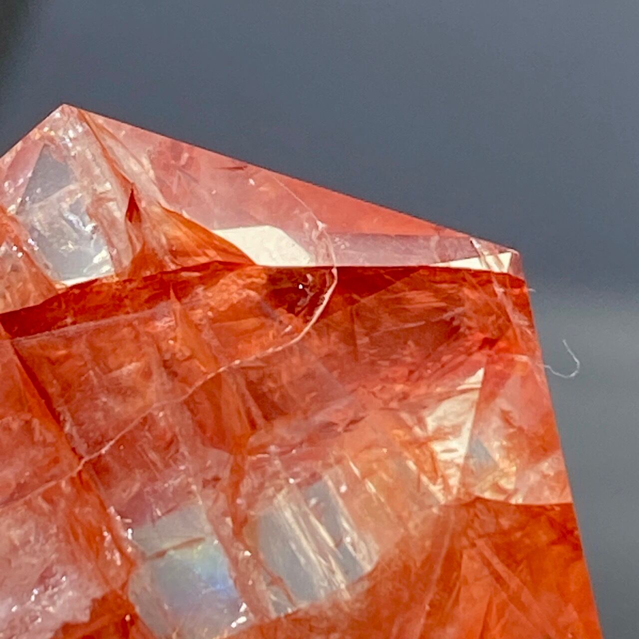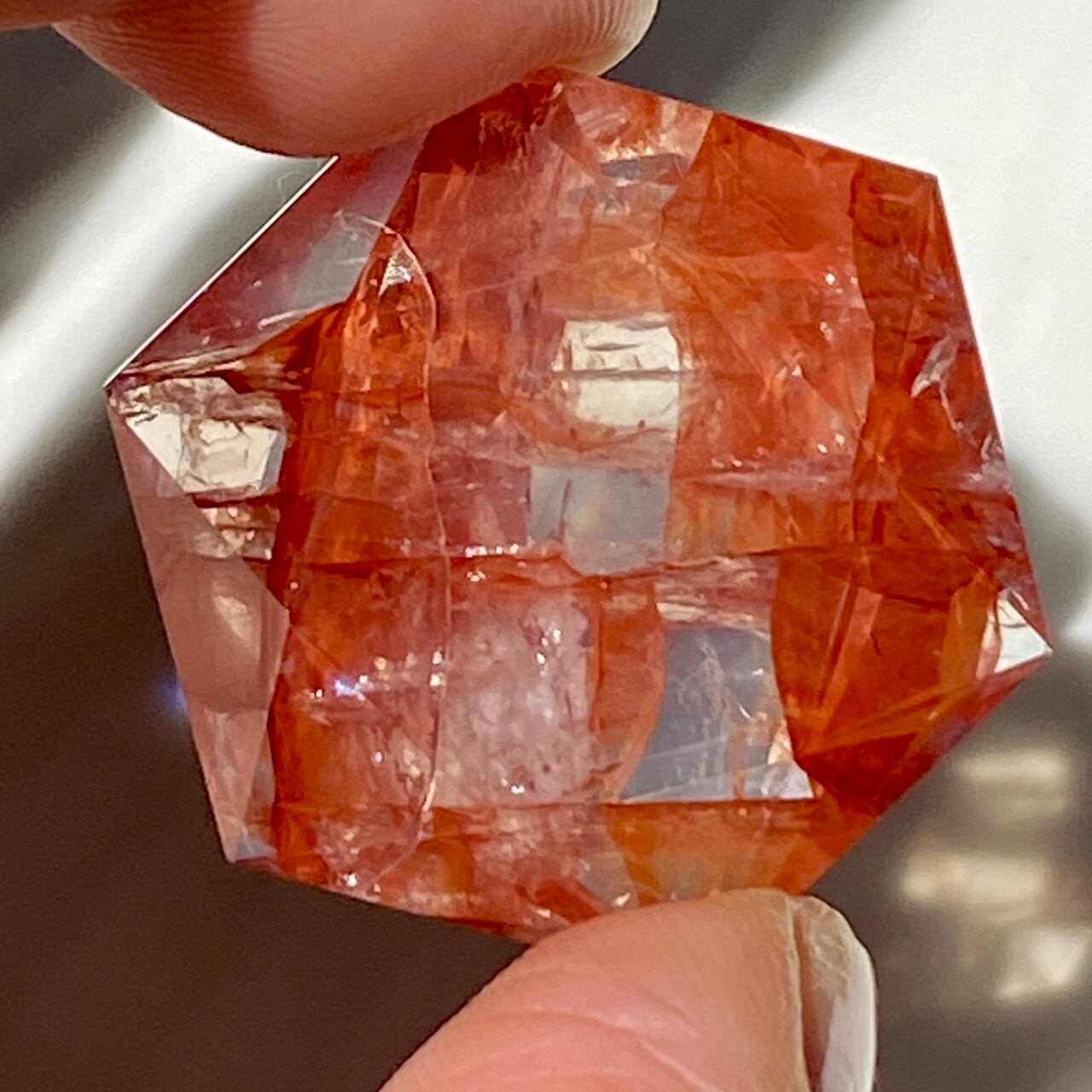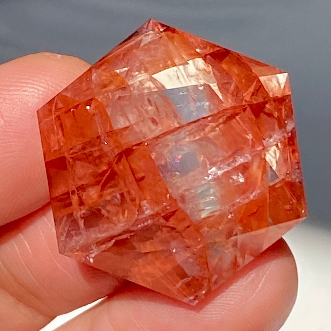 両面に面取りによりヘキサグラム(六芒星)が施された、ファイアークォーツのミニサイズのヘキサゴンになります。複数のレインボー(虹)入りで、惜しみなく入っている赤いインクルージョンの間からクォーツの透明感を楽しめます。角度を変えて表情の変化や煌めきを愛でて頂けると嬉しいです♡
