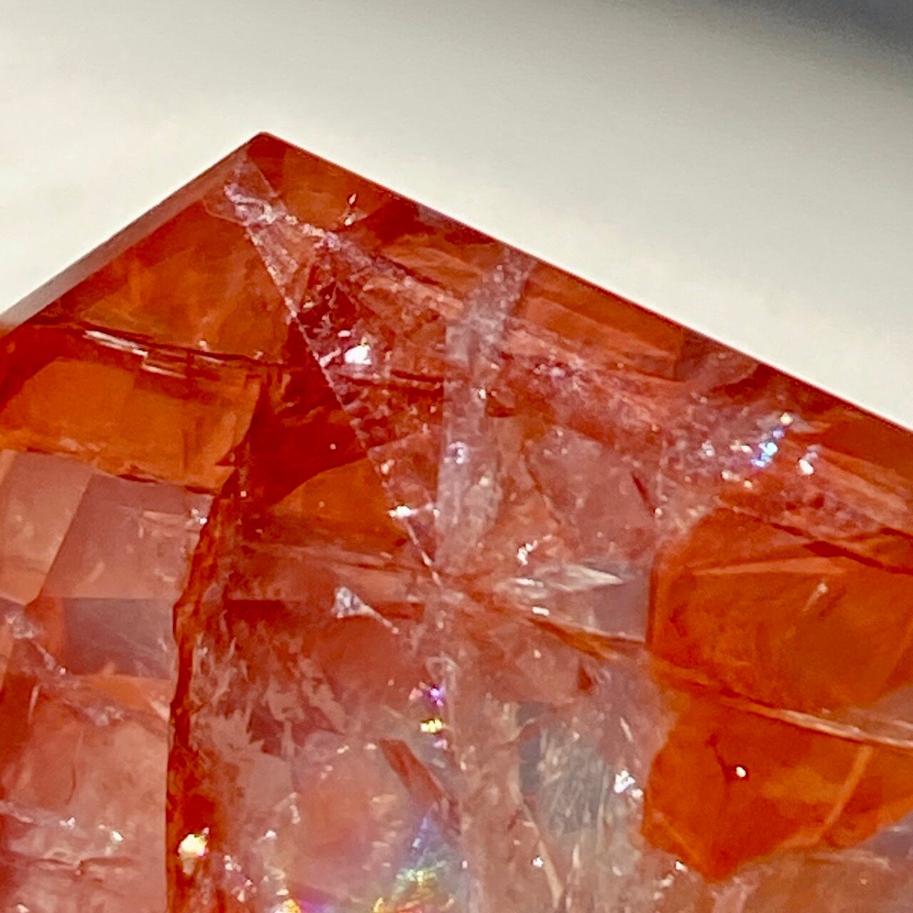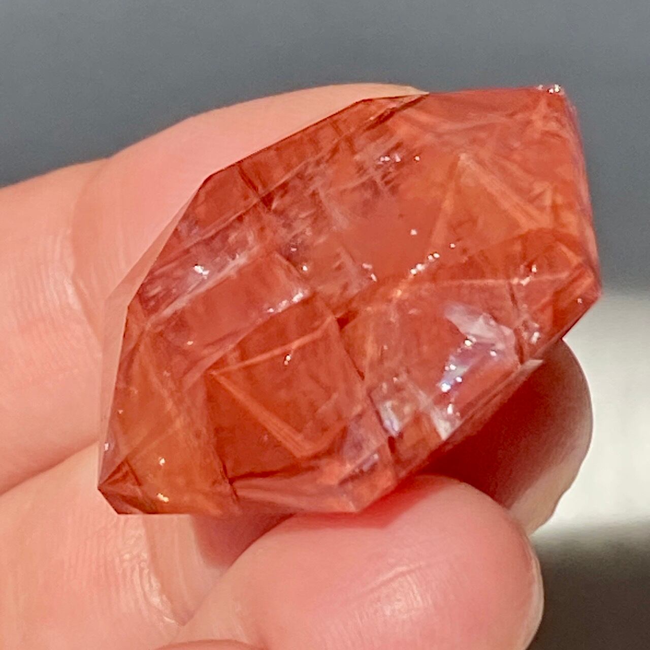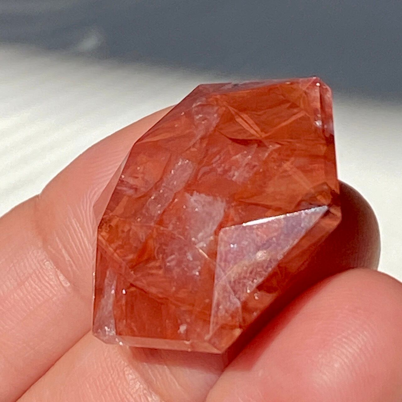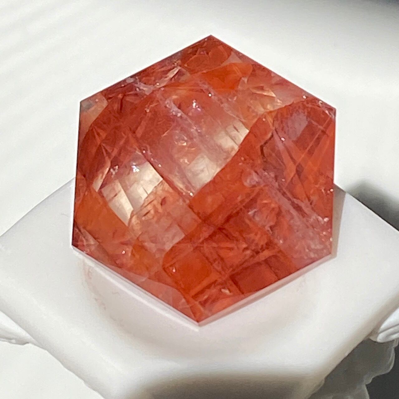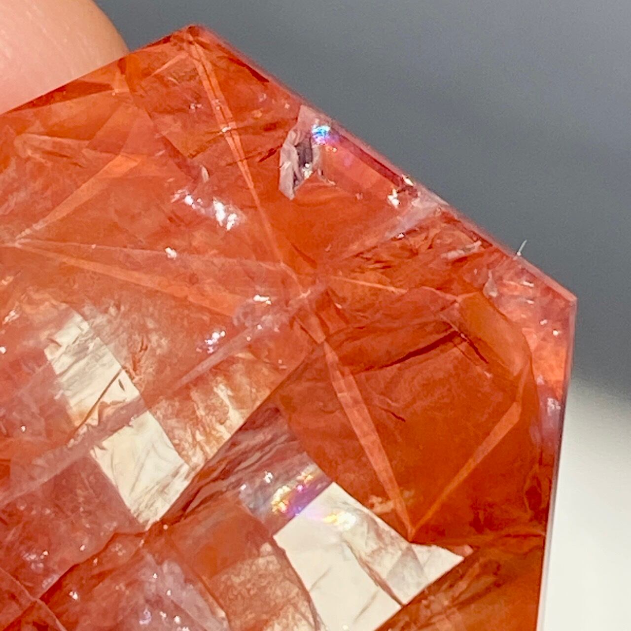 両面に面取りによりヘキサグラム(六芒星)が施された、ファイアークォーツのミニサイズのヘキサゴンになります。複数のレインボー(虹)入りで、惜しみなく入っている赤いインクルージョンの間からクォーツの透明感を楽しめます。角度を変えて表情の変化や煌めきを愛でて頂けると嬉しいです♡