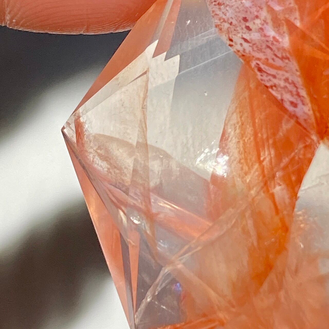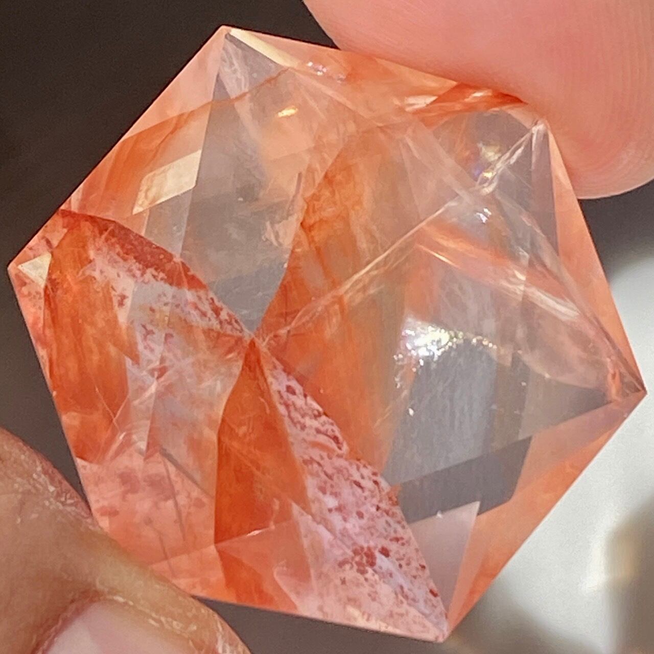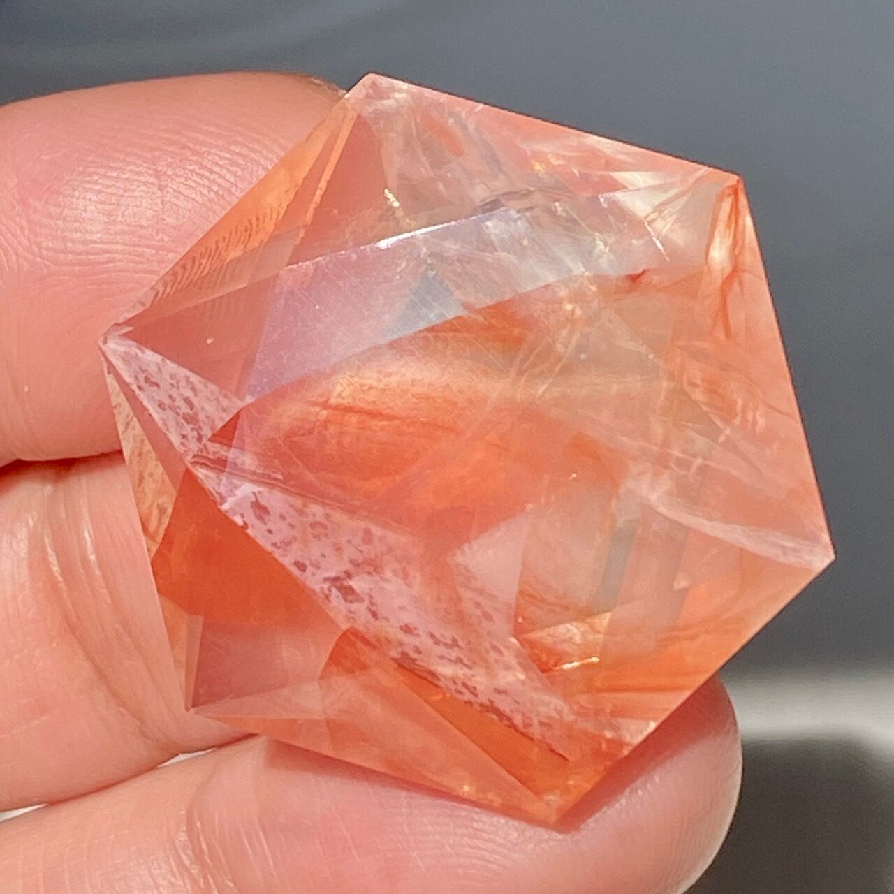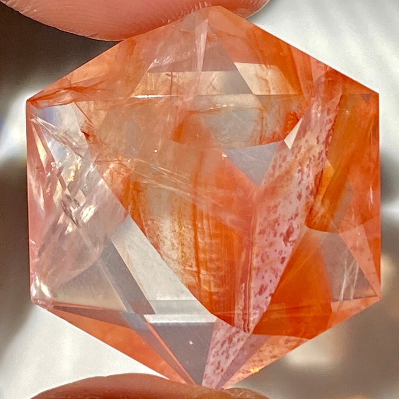 両面に面取りによりヘキサグラム(六芒星)が施された、ファイアークォーツのミニサイズのヘキサゴンになります。小さいながらもレインボー(虹)入りで、淡い朱色系のインクルージョンの間からクォーツの透明感を味わえます。2つの羽のようなインクルージョンが立体的に交差していて、拡大してみるとその表情が素晴らしく(内ひとつはまだら模様になっていて美しく)、是非光にかざして角度を変えて表情をお楽しみ下さい。店主オススメの子です。