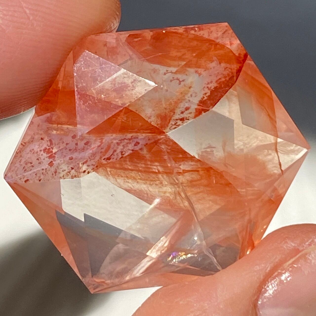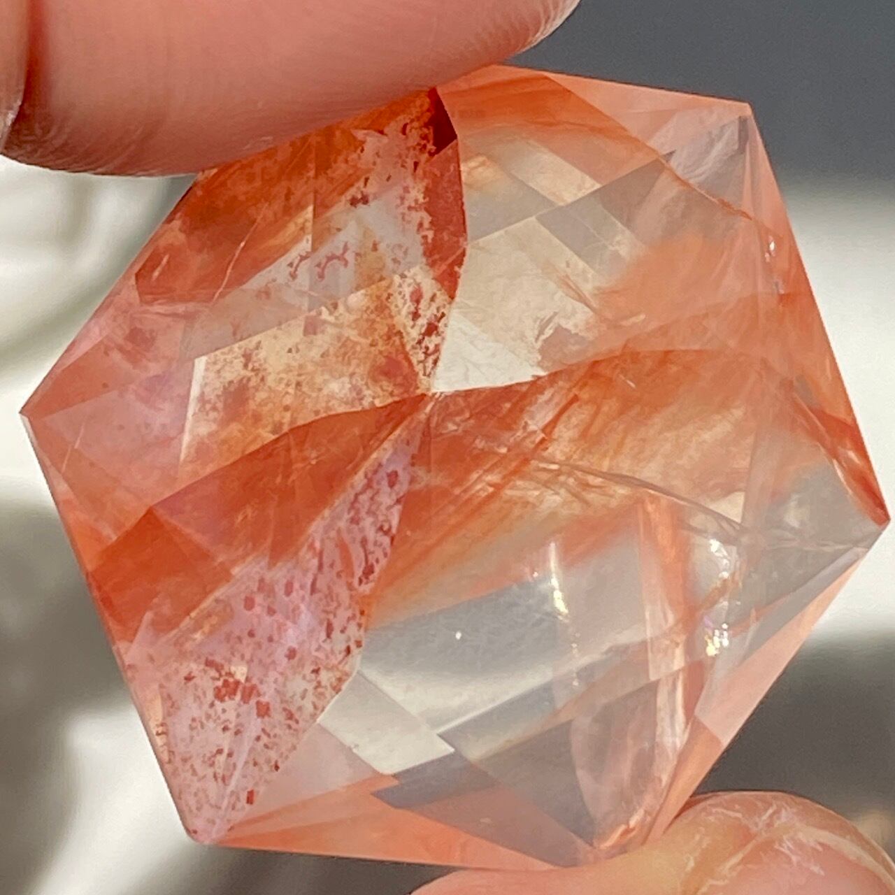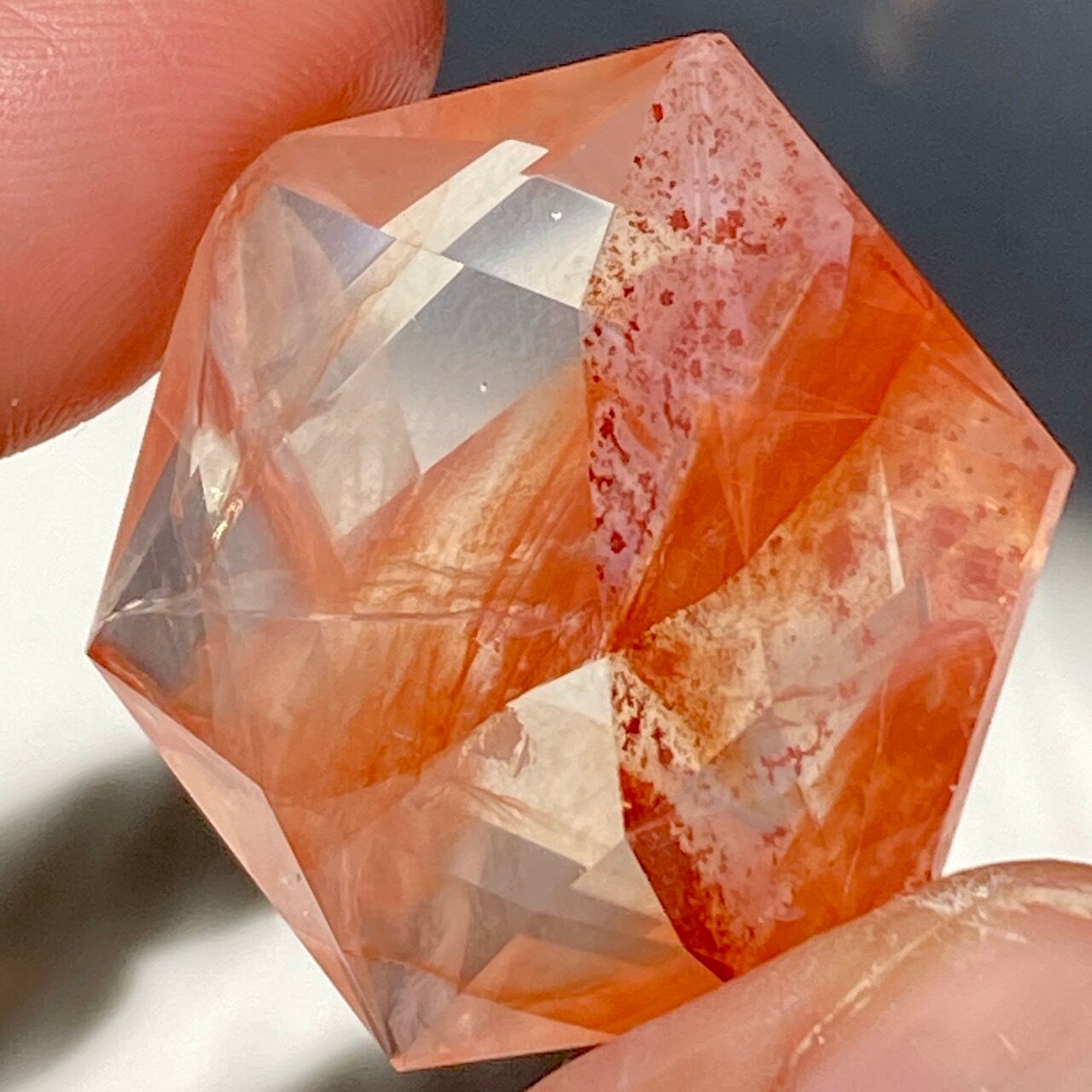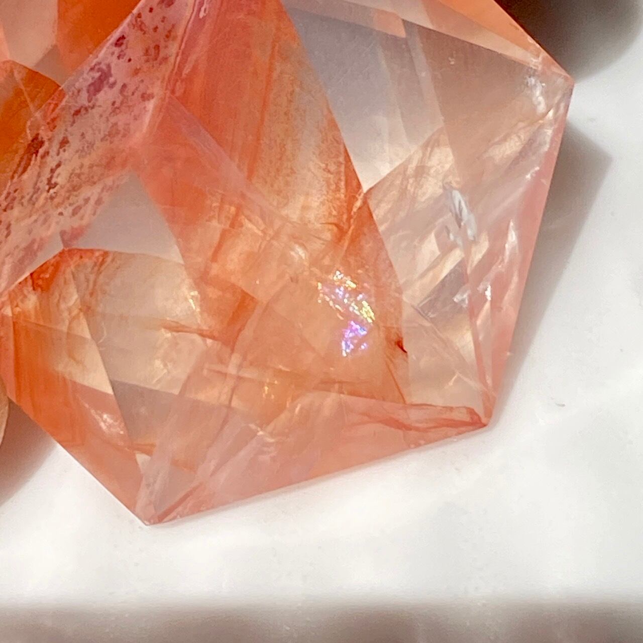 両面に面取りによりヘキサグラム(六芒星)が施された、ファイアークォーツのミニサイズのヘキサゴンになります。小さいながらもレインボー(虹)入りで、淡い朱色系のインクルージョンの間からクォーツの透明感を味わえます。2つの羽のようなインクルージョンが立体的に交差していて、拡大してみるとその表情が素晴らしく(内ひとつはまだら模様になっていて美しく)、是非光にかざして角度を変えて表情をお楽しみ下さい。店主オススメの子です。