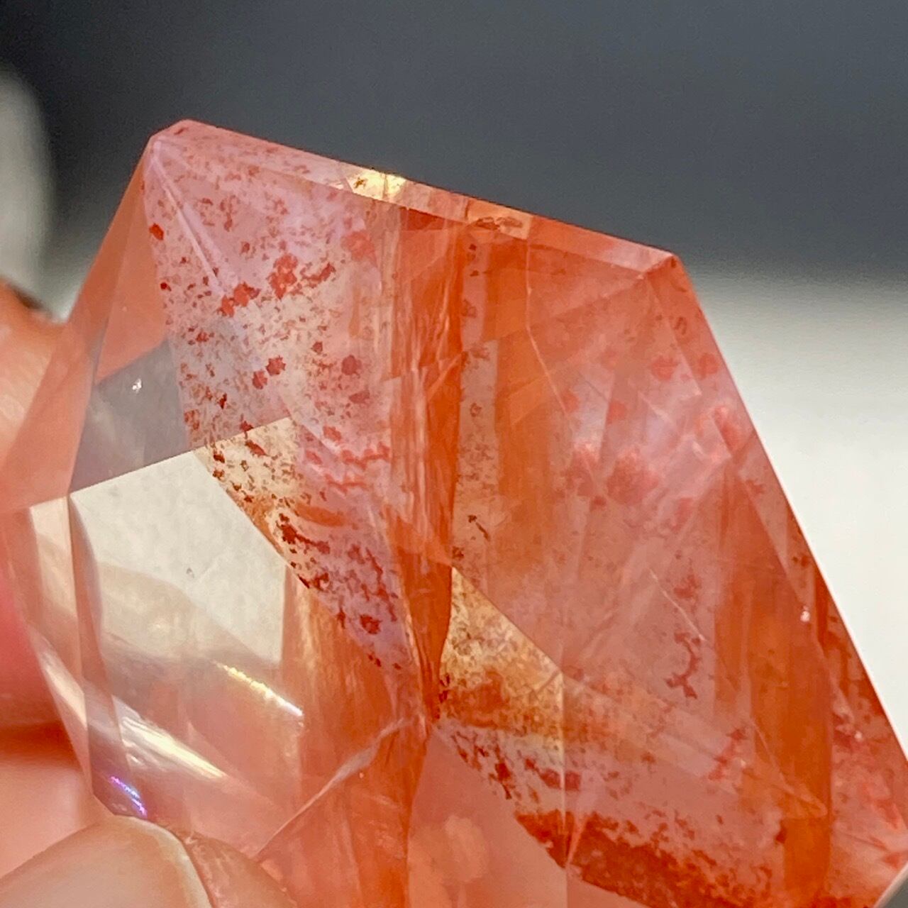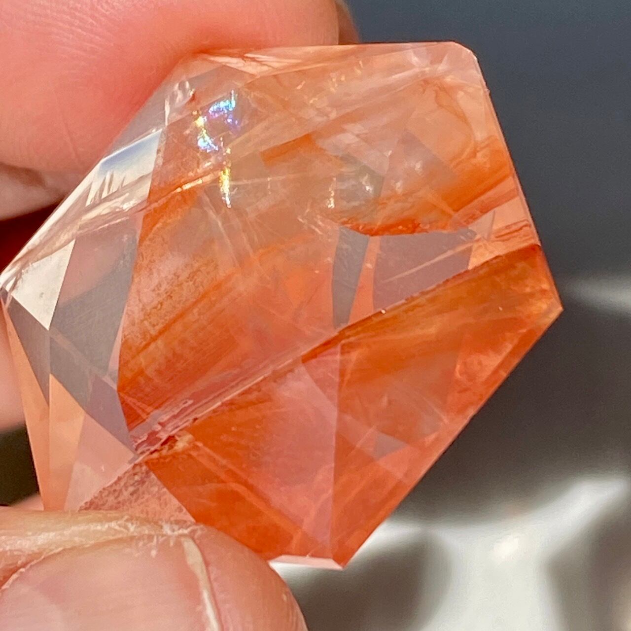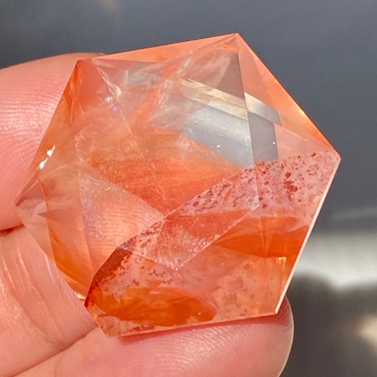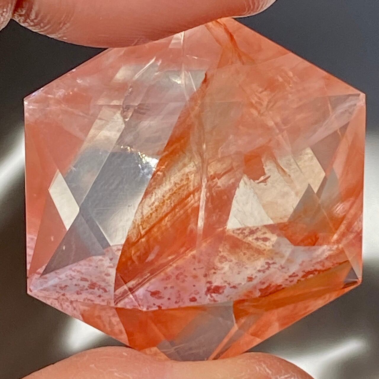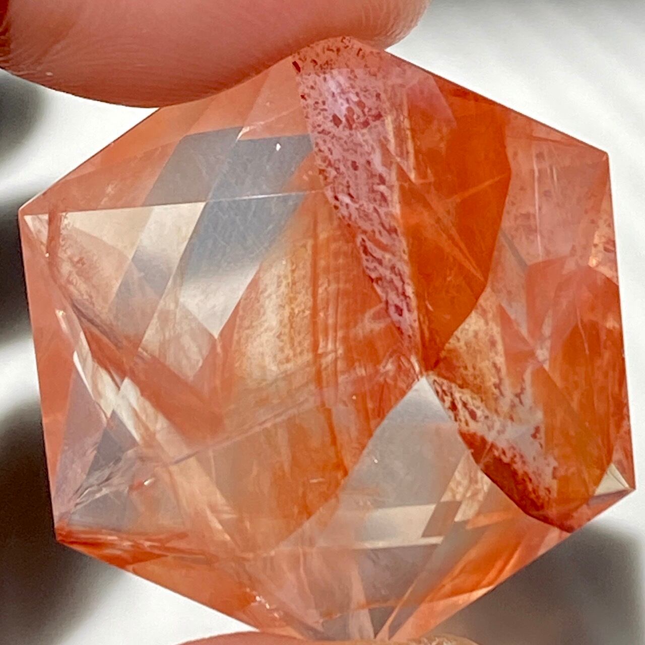 両面に面取りによりヘキサグラム(六芒星)が施された、ファイアークォーツのミニサイズのヘキサゴンになります。小さいながらもレインボー(虹)入りで、淡い朱色系のインクルージョンの間からクォーツの透明感を味わえます。2つの羽のようなインクルージョンが立体的に交差していて、拡大してみるとその表情が素晴らしく(内ひとつはまだら模様になっていて美しく)、是非光にかざして角度を変えて表情をお楽しみ下さい。店主オススメの子です。