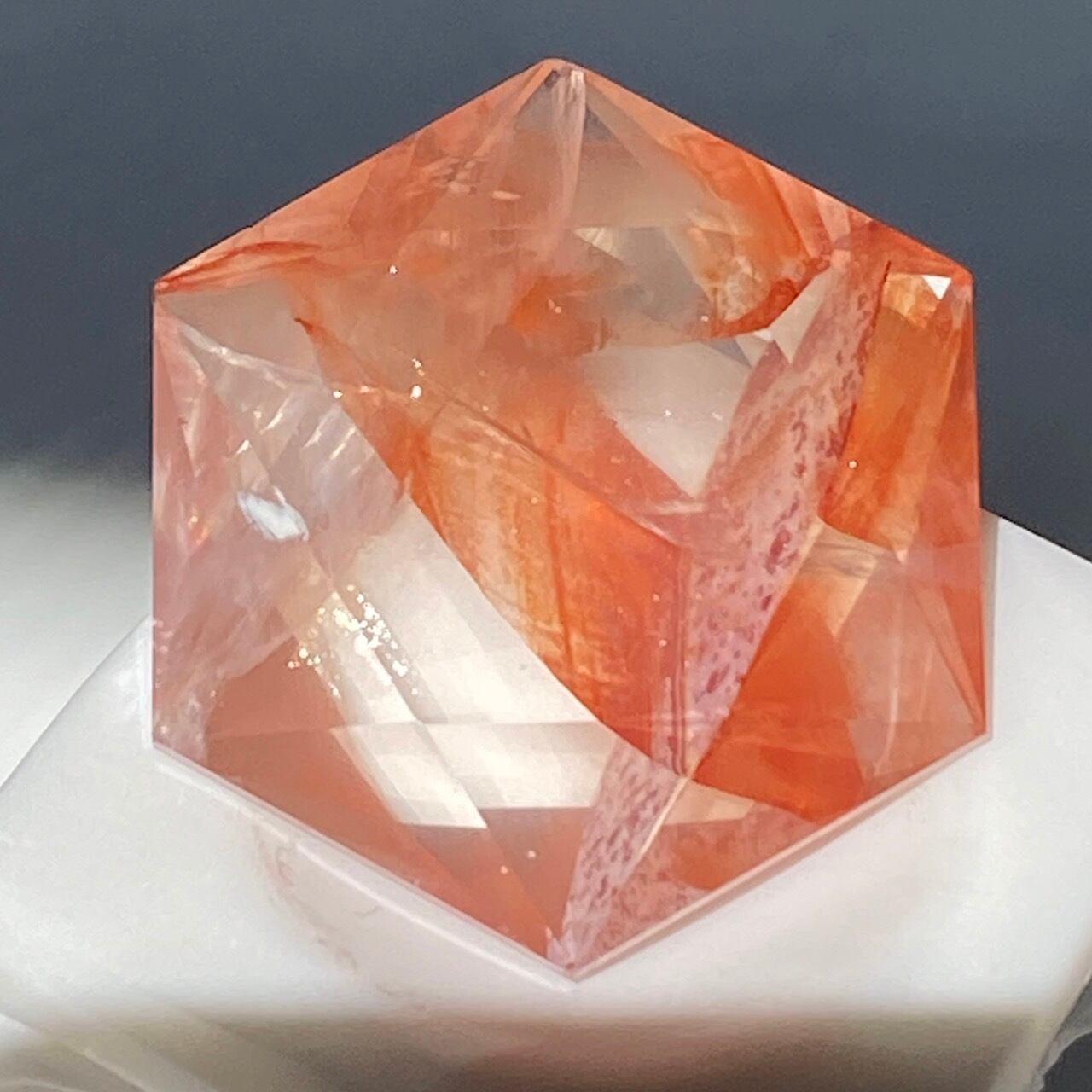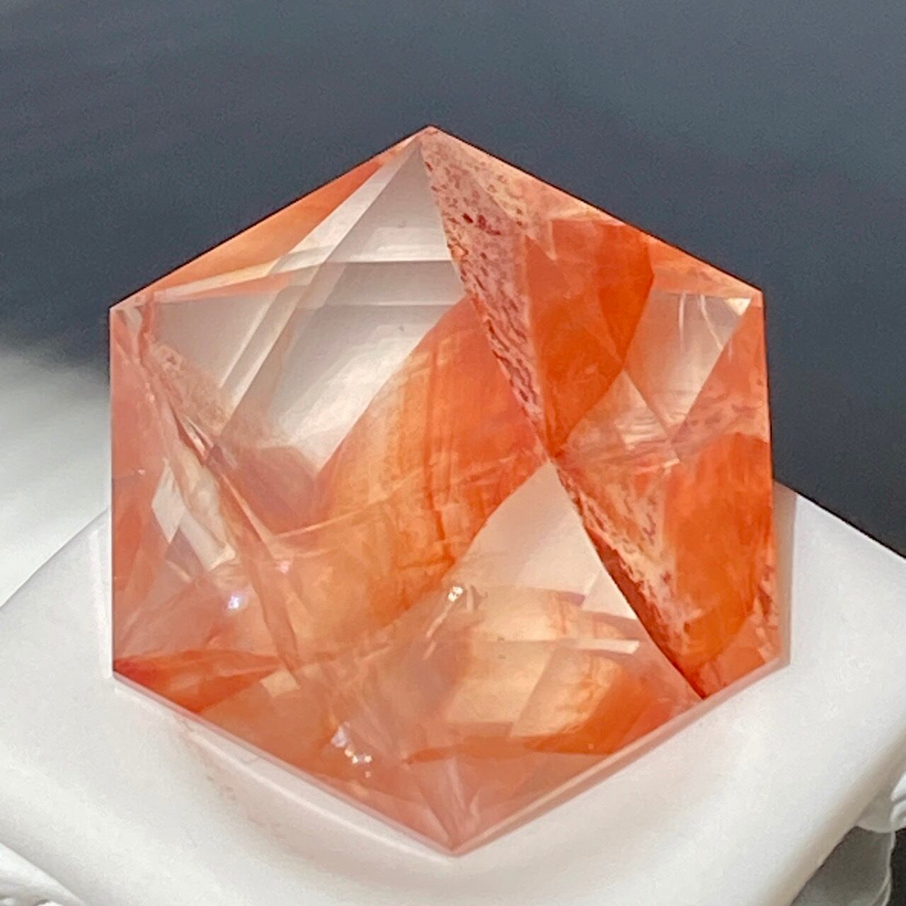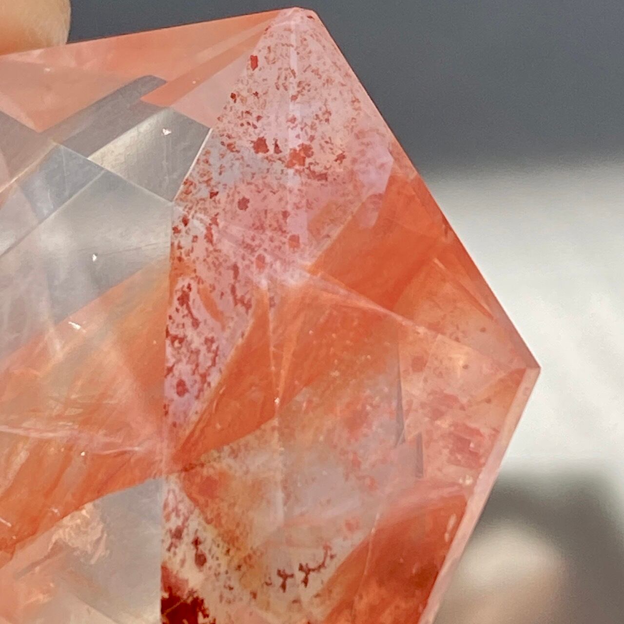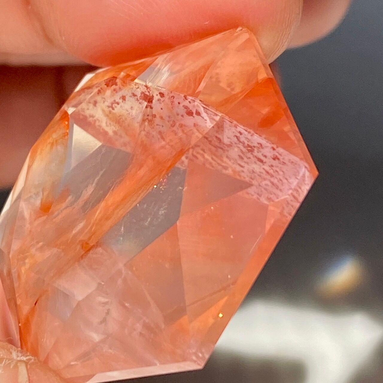 両面に面取りによりヘキサグラム(六芒星)が施された、ファイアークォーツのミニサイズのヘキサゴンになります。小さいながらもレインボー(虹)入りで、淡い朱色系のインクルージョンの間からクォーツの透明感を味わえます。2つの羽のようなインクルージョンが立体的に交差していて、拡大してみるとその表情が素晴らしく(内ひとつはまだら模様になっていて美しく)、是非光にかざして角度を変えて表情をお楽しみ下さい。店主オススメの子です。