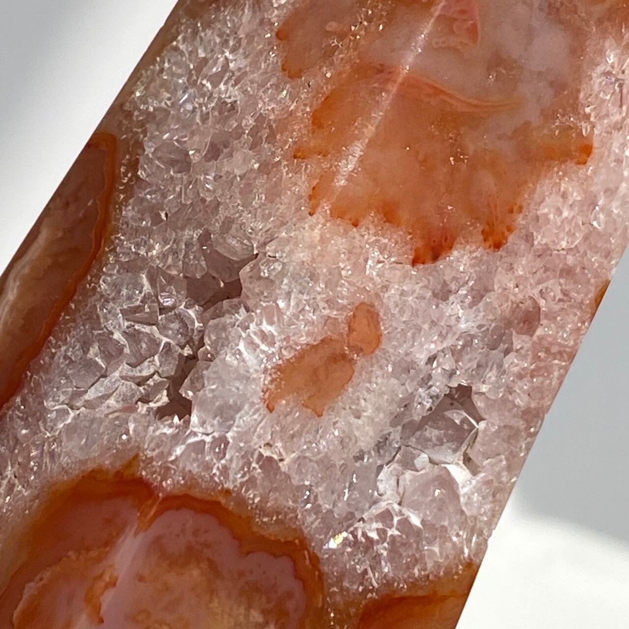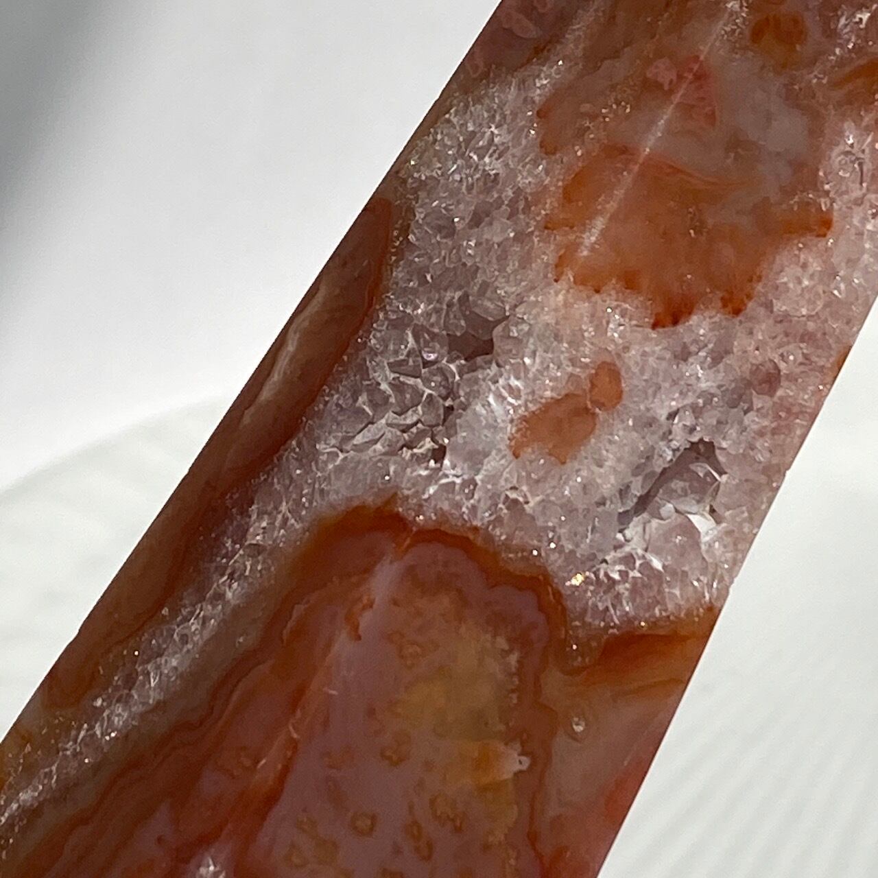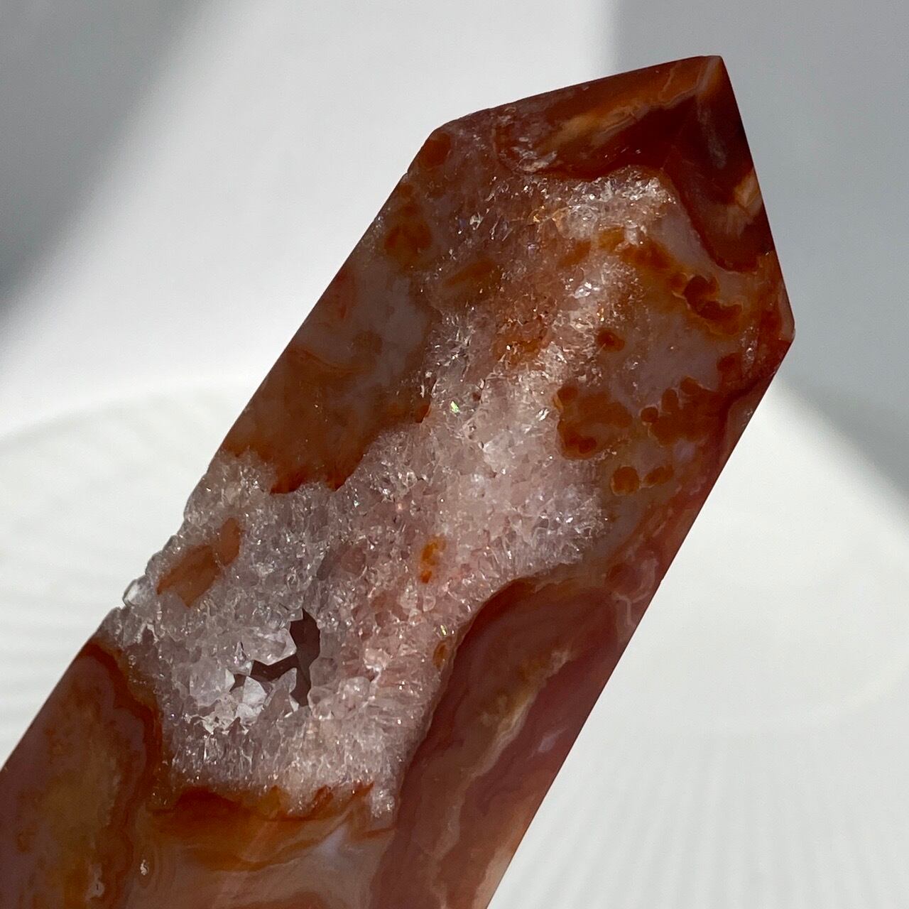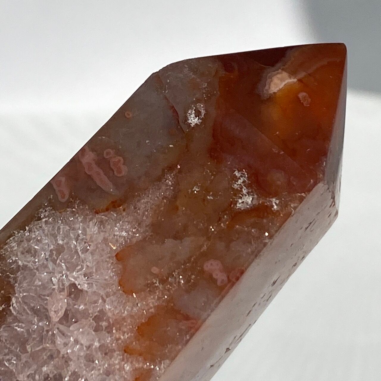 3面に渡りクォーツのドゥルージーが見られるカーネリアンのタワーです。