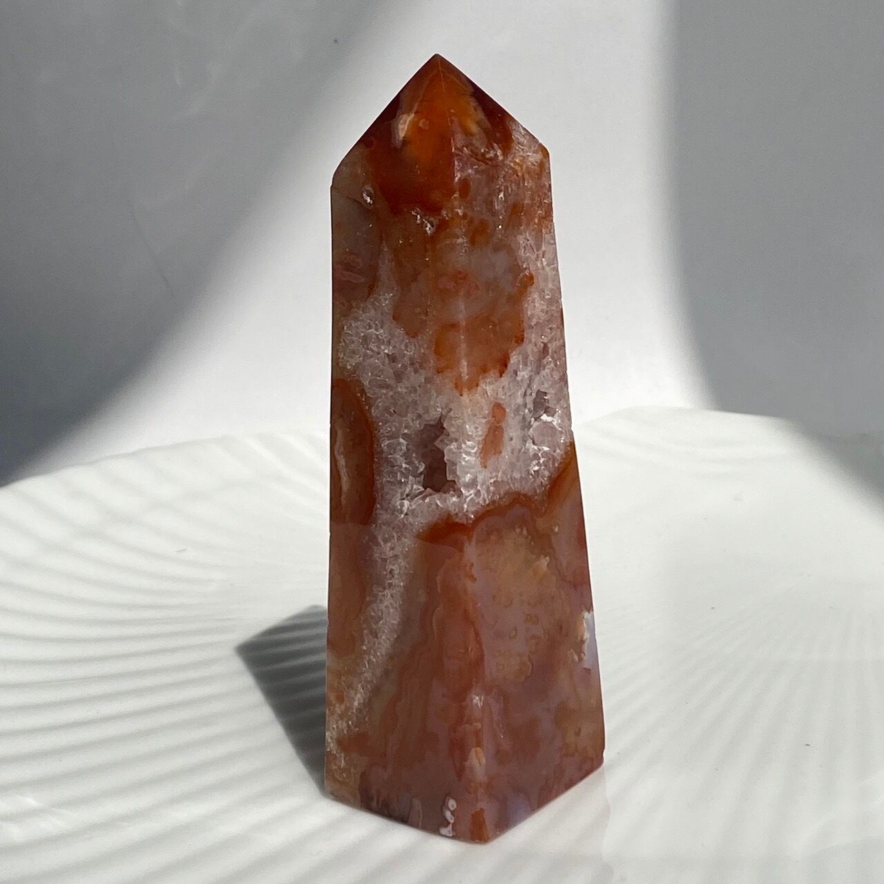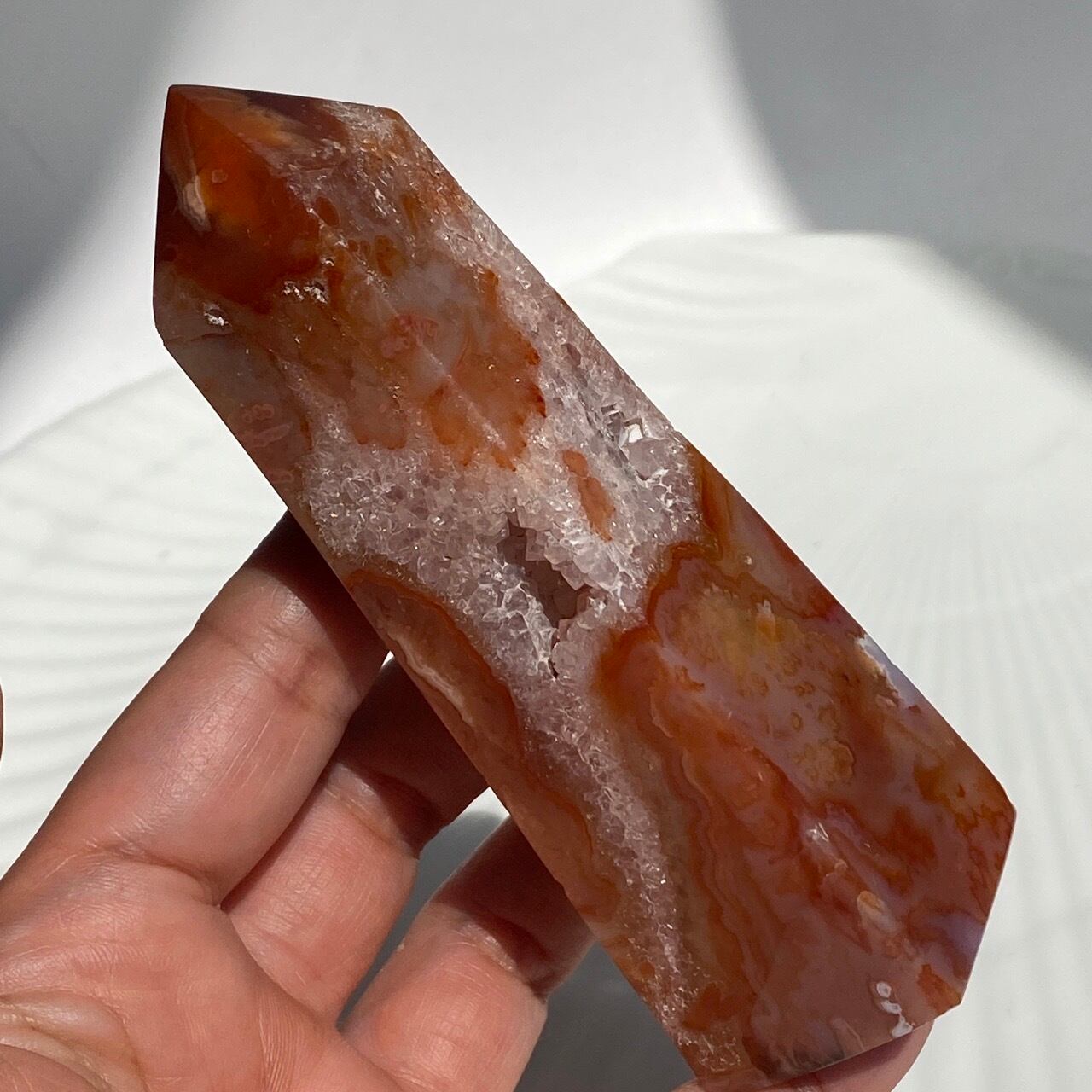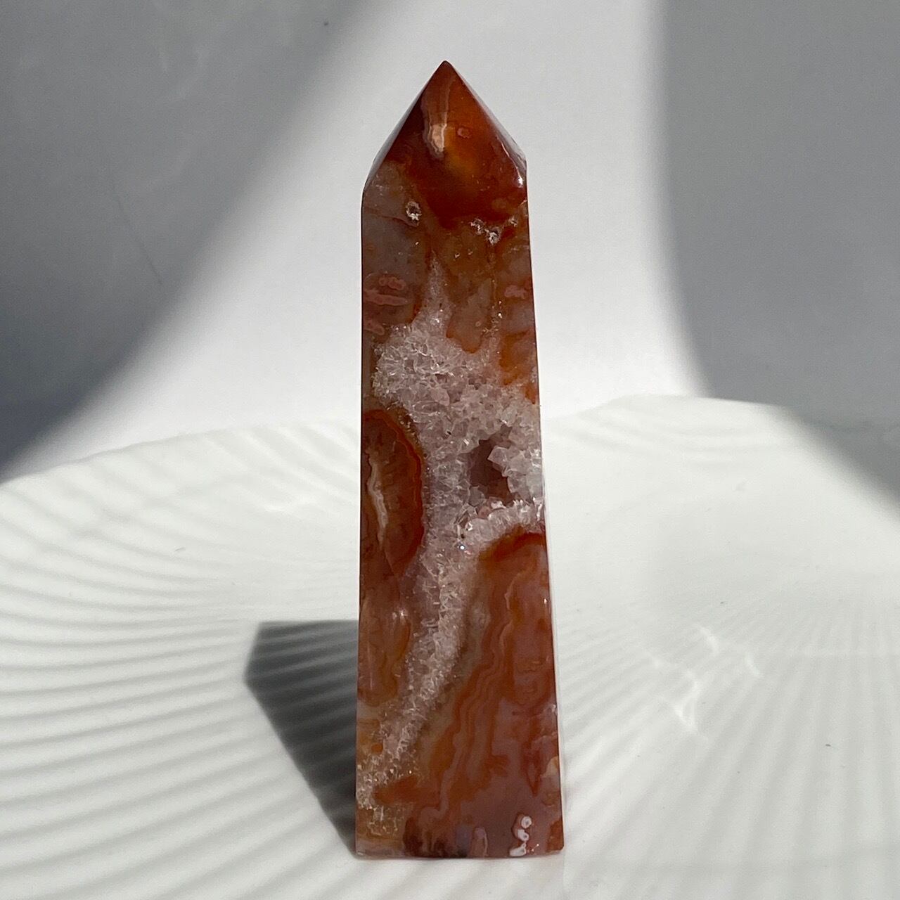 3面に渡りクォーツのドゥルージーが見られるカーネリアンのタワーです。
