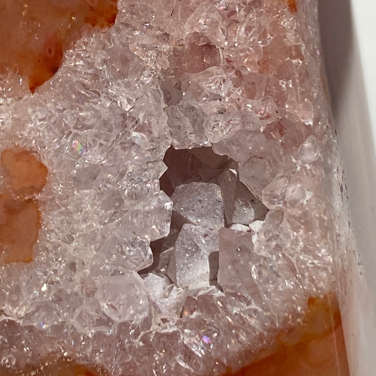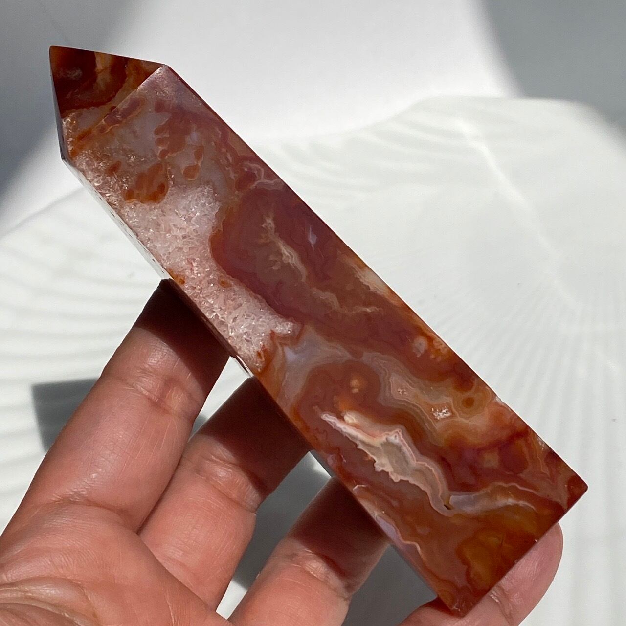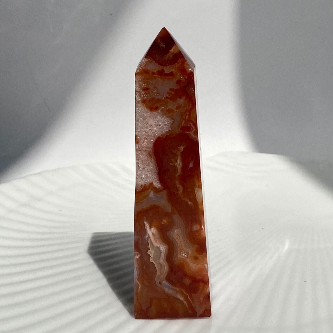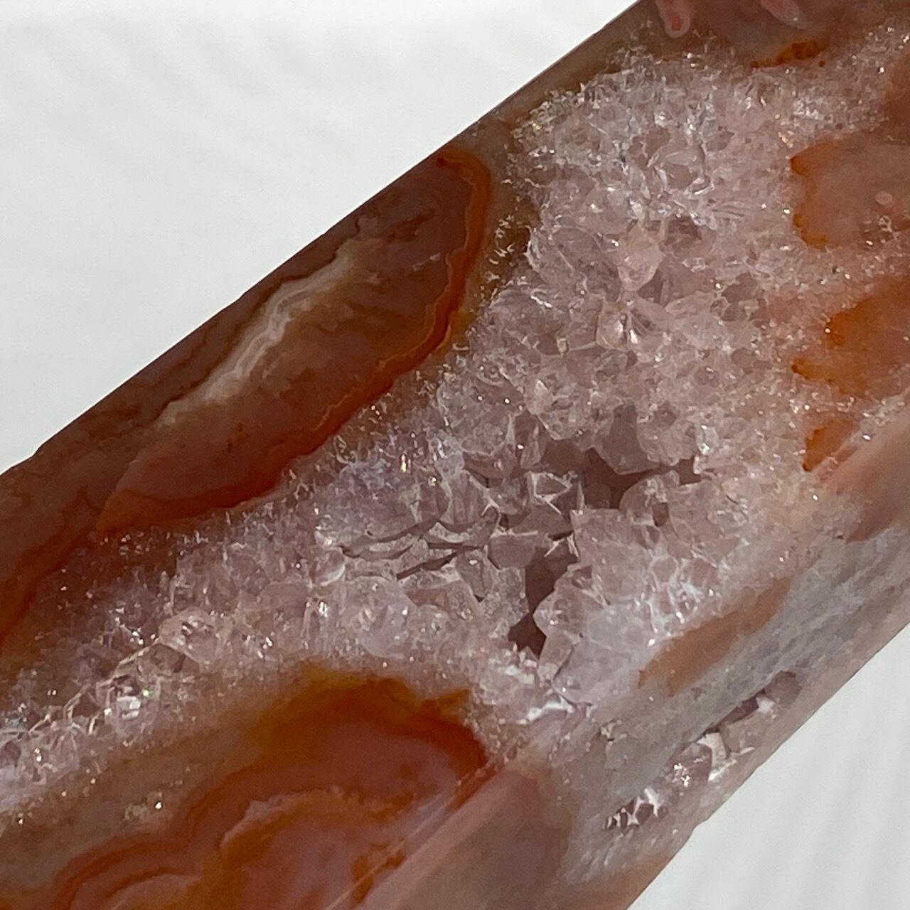 3面に渡りクォーツのドゥルージーが見られるカーネリアンのタワーです。