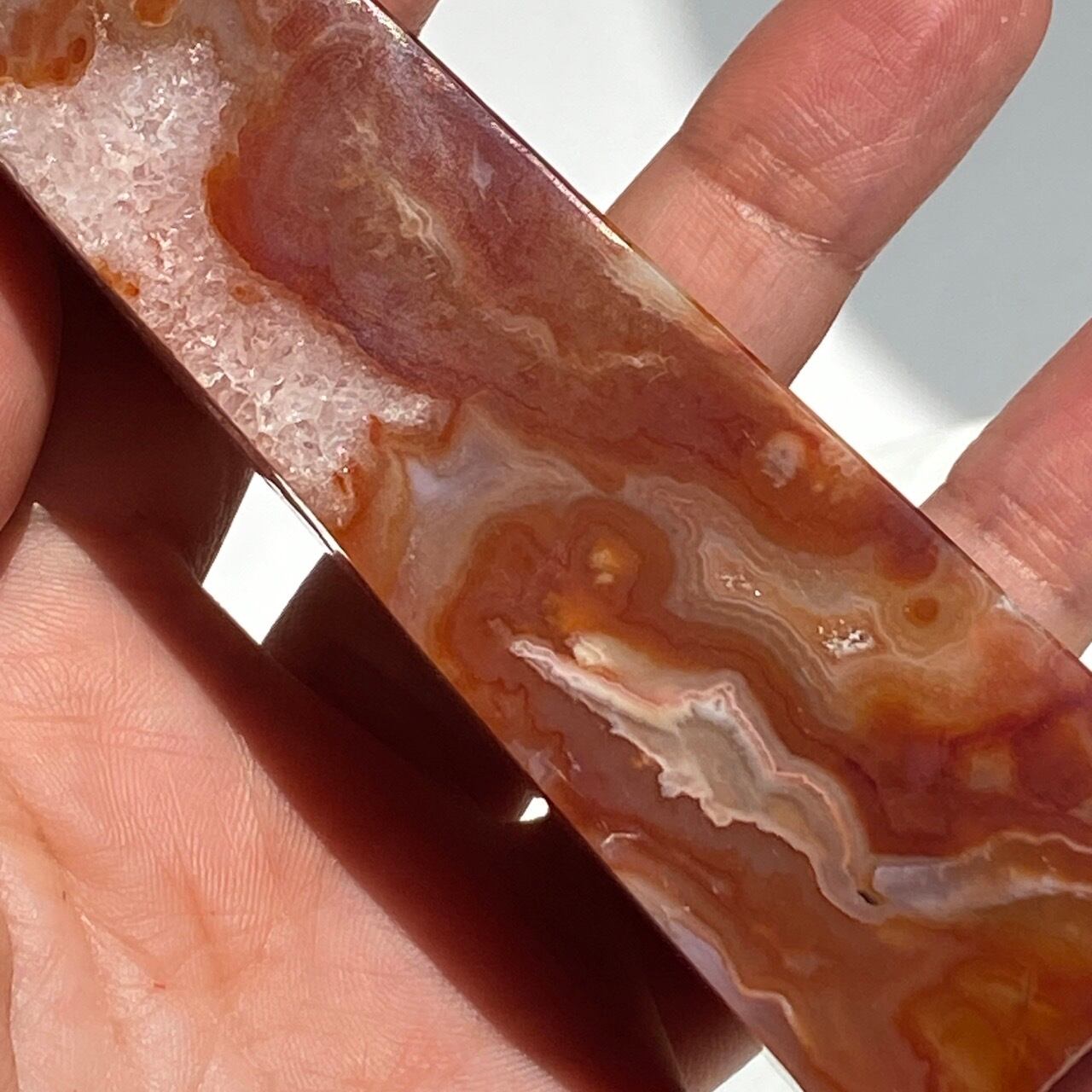 黄色やオレンジ、そして赤のカラーパレットで構成されたカーネリアンですが、模様にうねりが有り力強さを感じますが、それに対してざくざくと惜しみなく入ったクォーツがコントラストを成しているスペシャルな子です。インスタに動画をアップしておりますので、是非ご確認下さいませ。