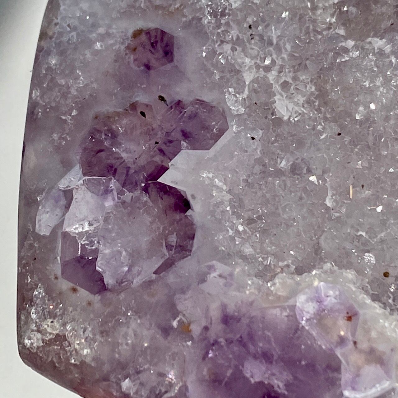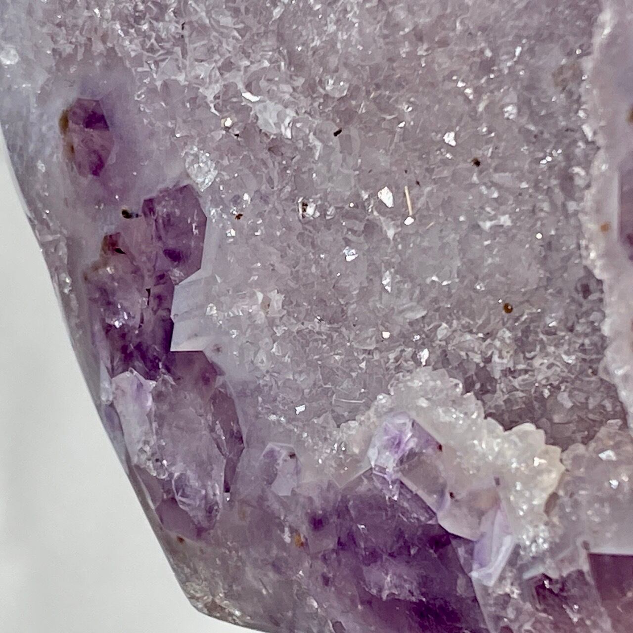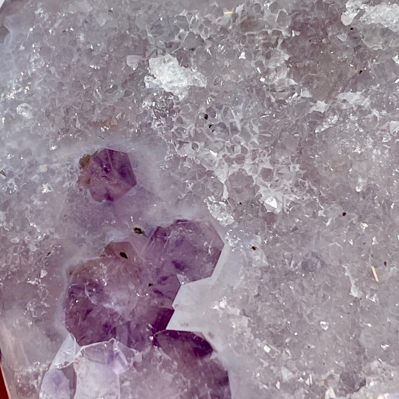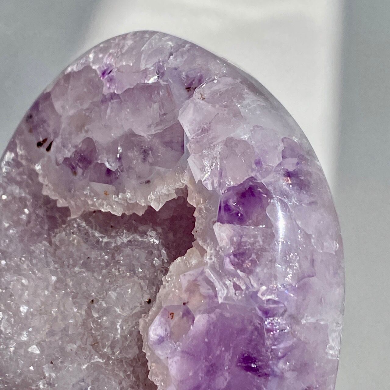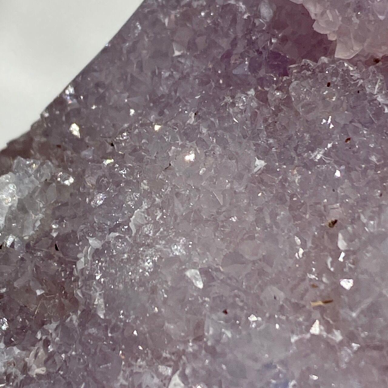 前面の半分をもこもこっとしたキラキラと煌めく砂糖菓子のようなドゥルージーが覆い、その周りをお花のようなすみれ色のアメシストがぐるっと取り囲んでいる、とても可憐な子です。