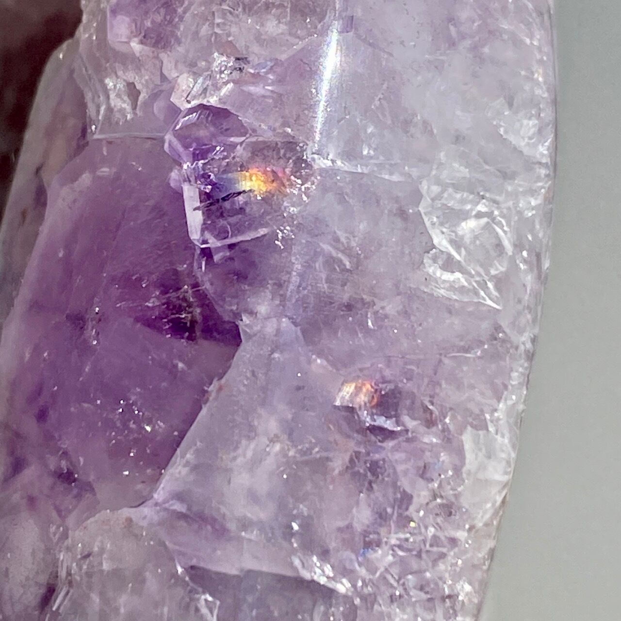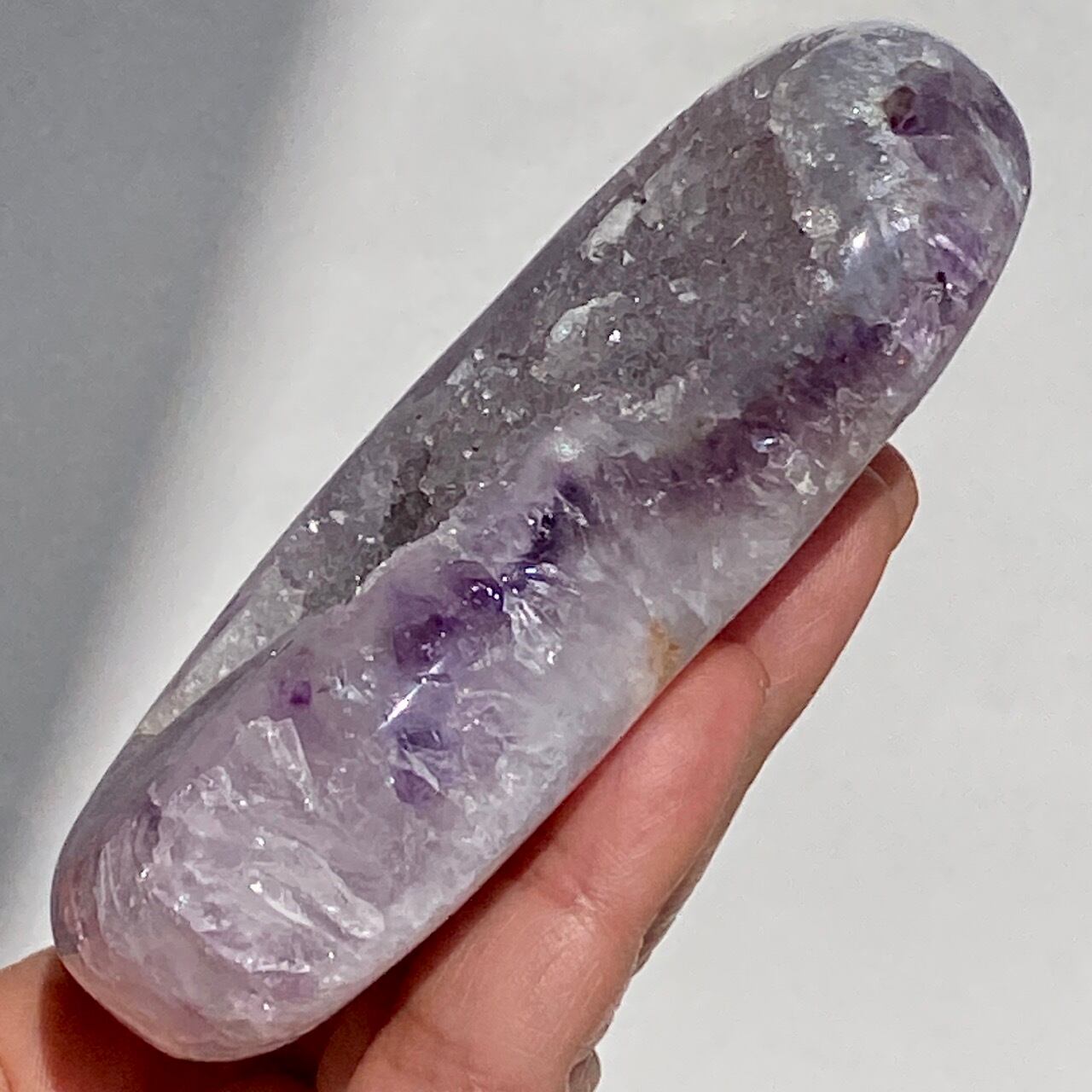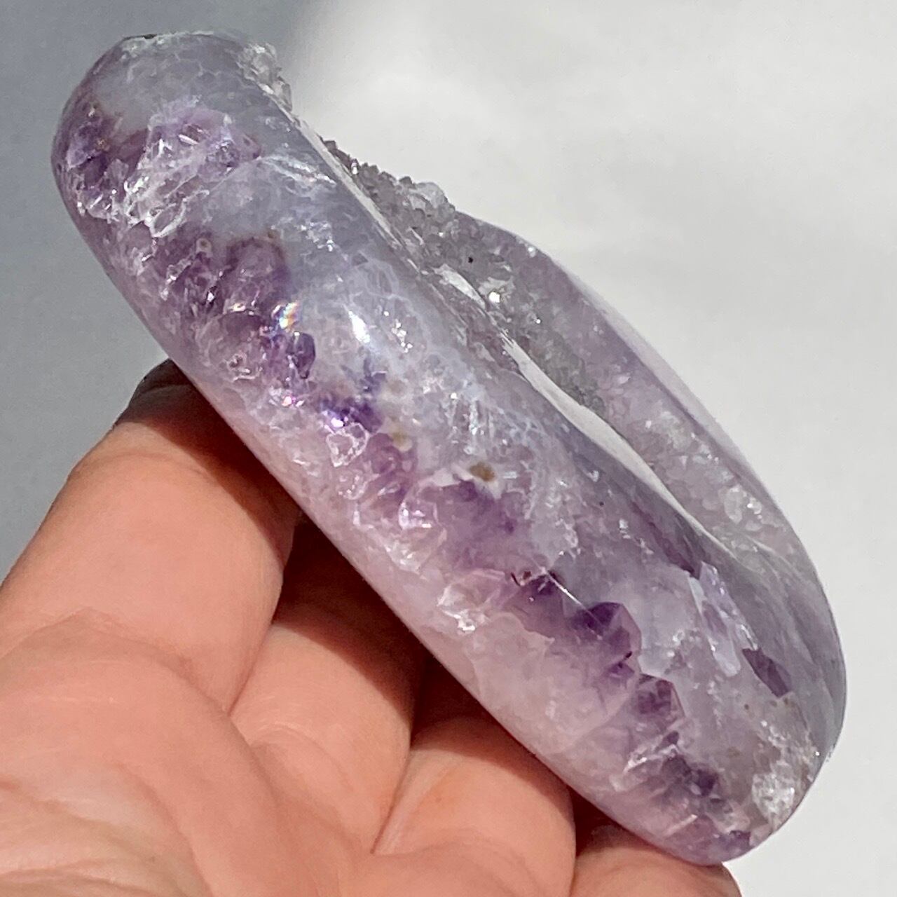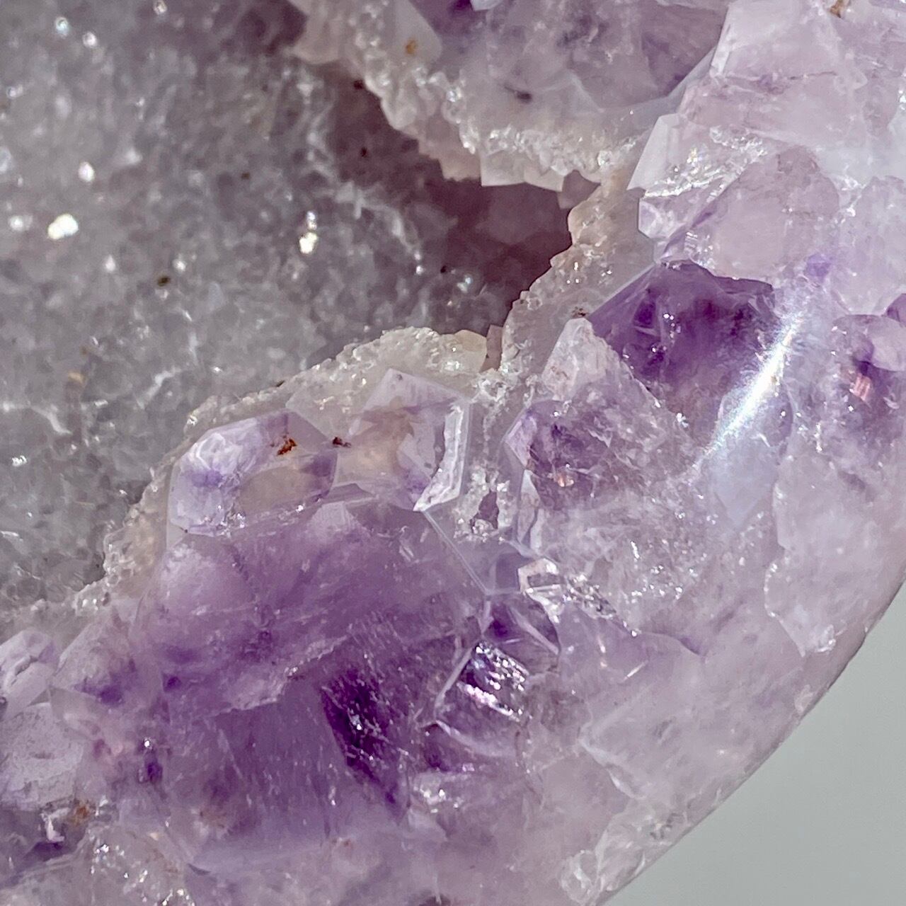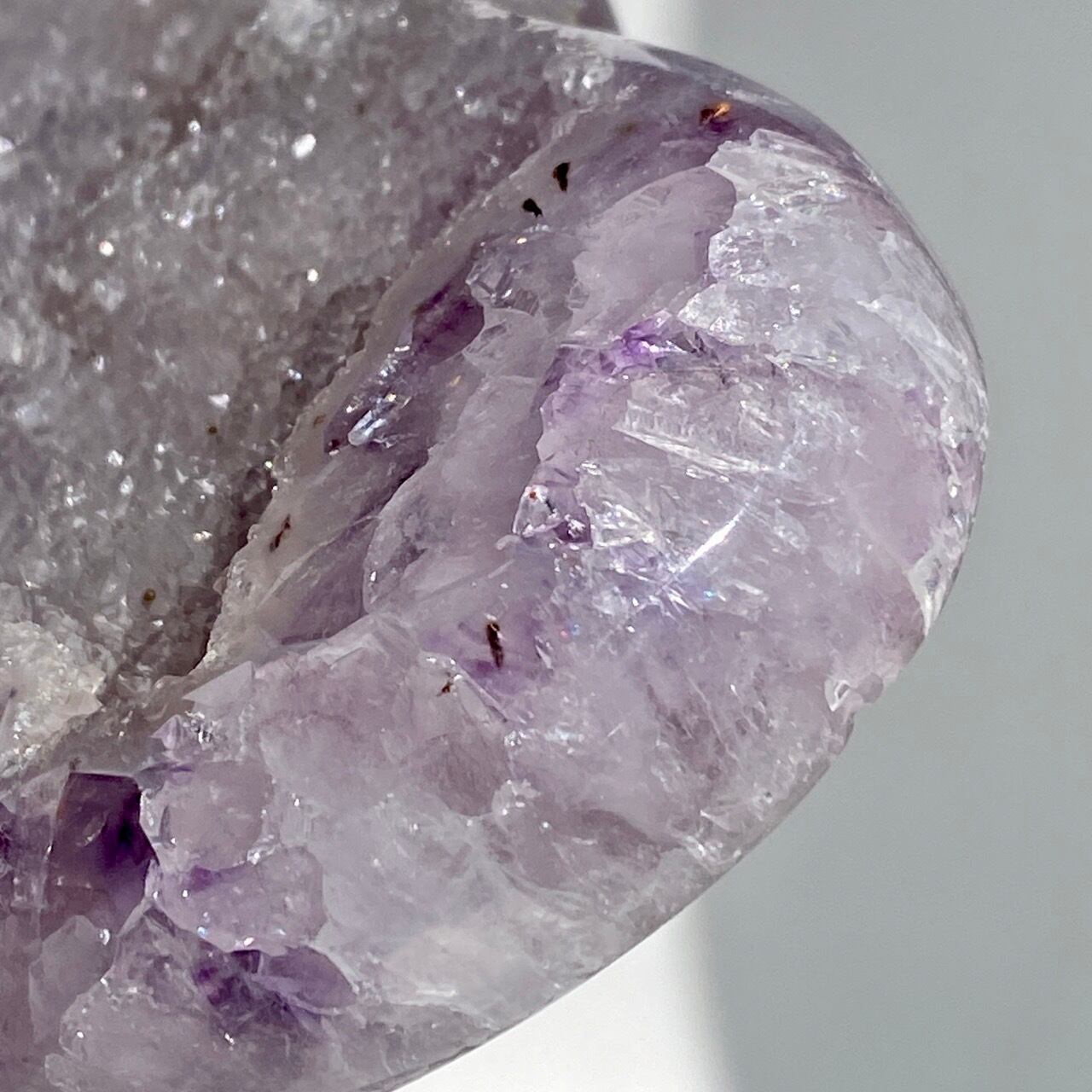 前面の半分をもこもこっとしたキラキラと煌めく砂糖菓子のようなドゥルージーが覆い、その周りをお花のようなすみれ色のアメシストがぐるっと取り囲んでいる、とても可憐な子です。