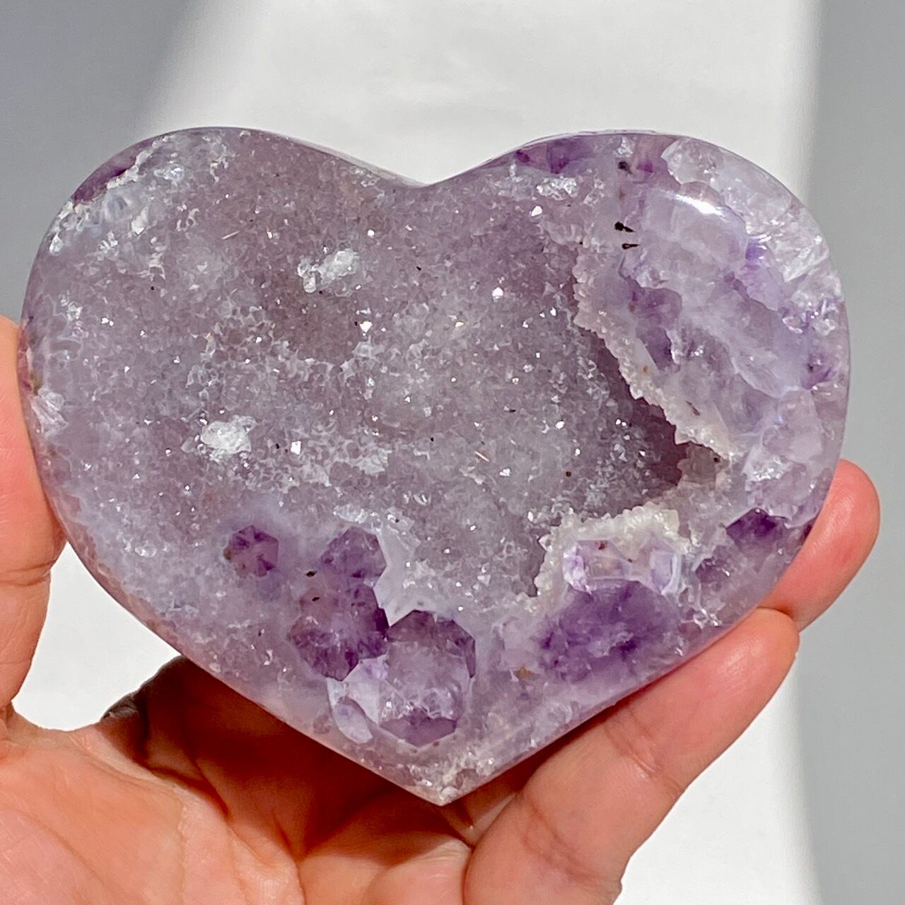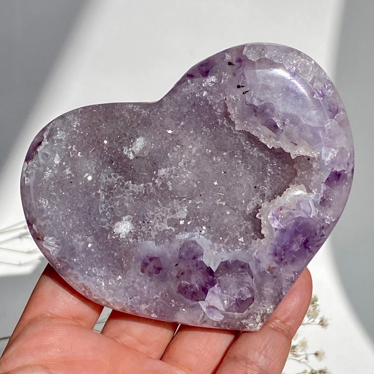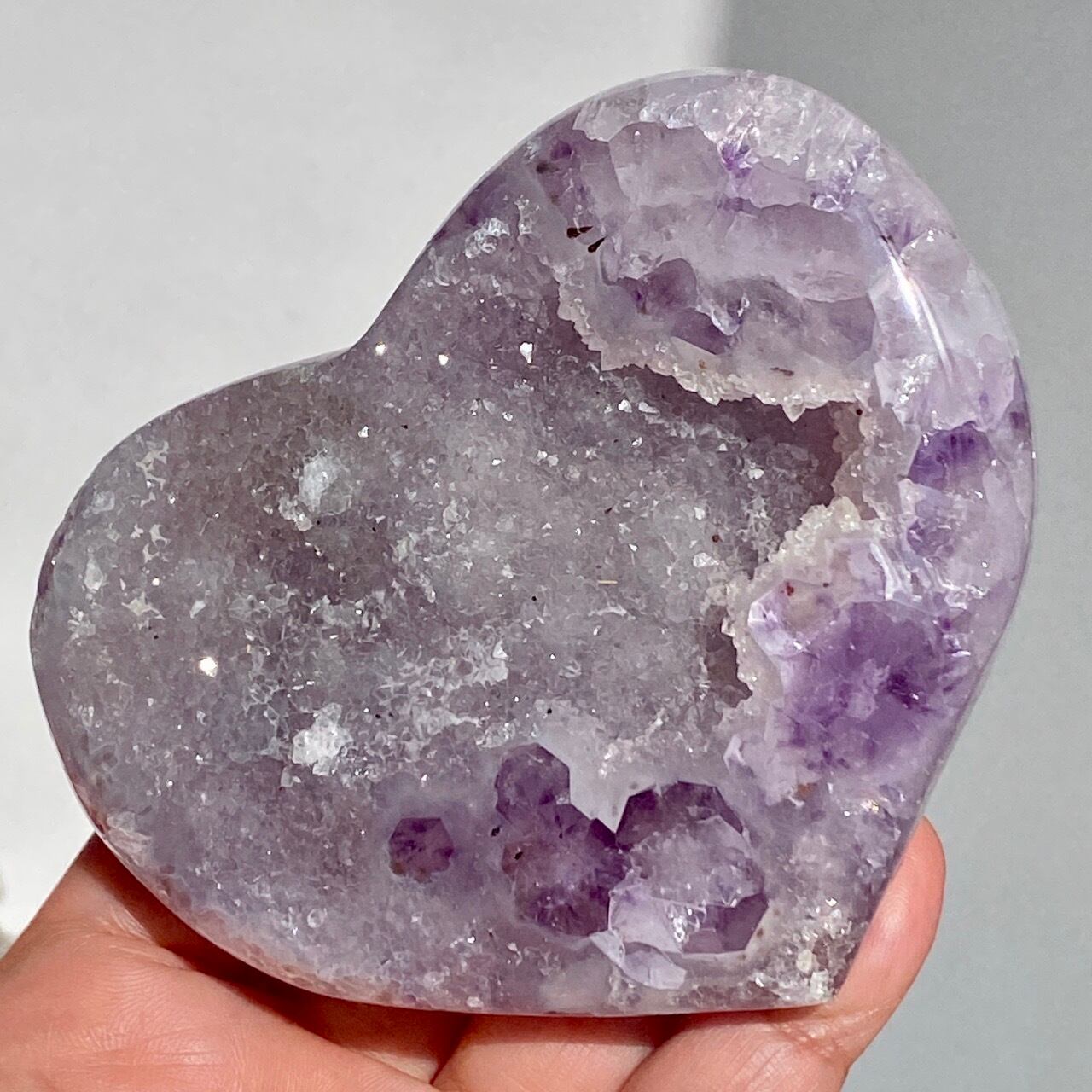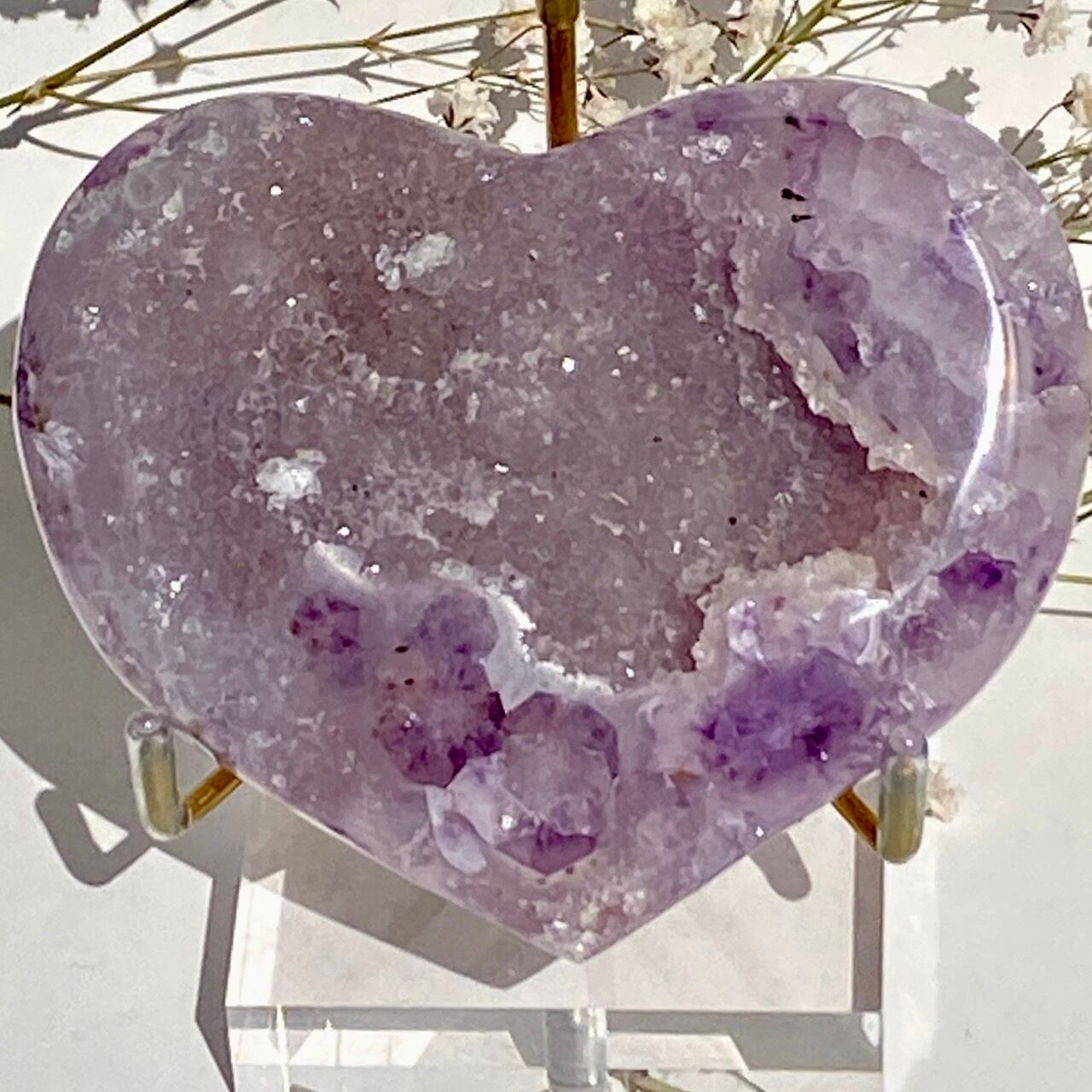 アメシストの産地であるリオグランデ・ド・スールのアメシストの名が付いた鉱山から採掘されたアメシスト x ドゥルージーアゲートのハートになります。