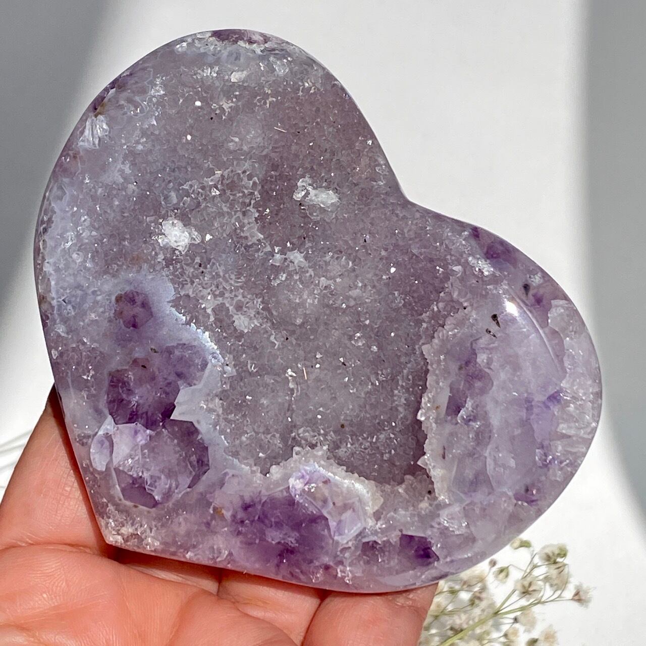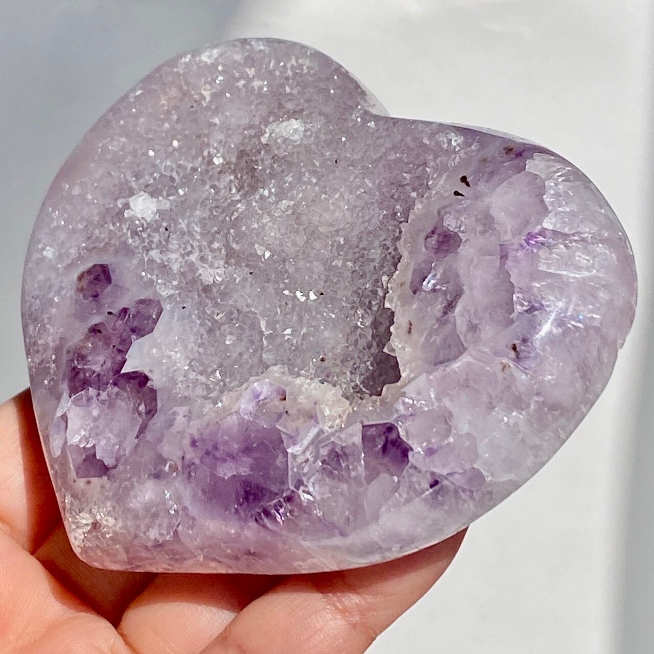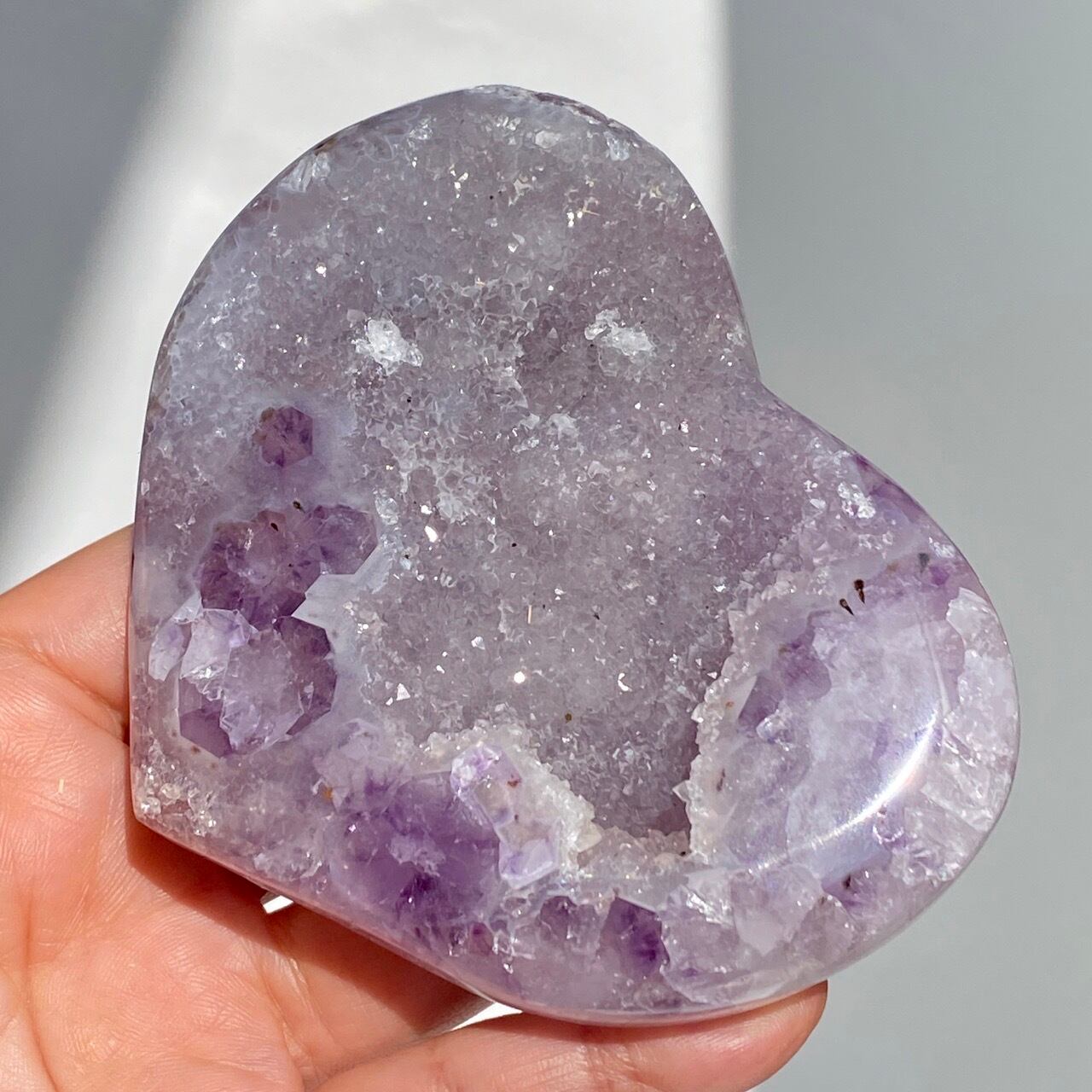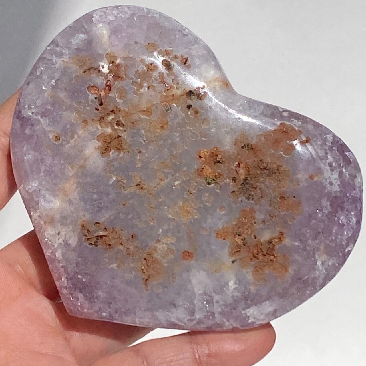 アメシストの産地であるリオグランデ・ド・スールのアメシストの名が付いた鉱山から採掘されたアメシスト x ドゥルージーアゲートのハートになります。