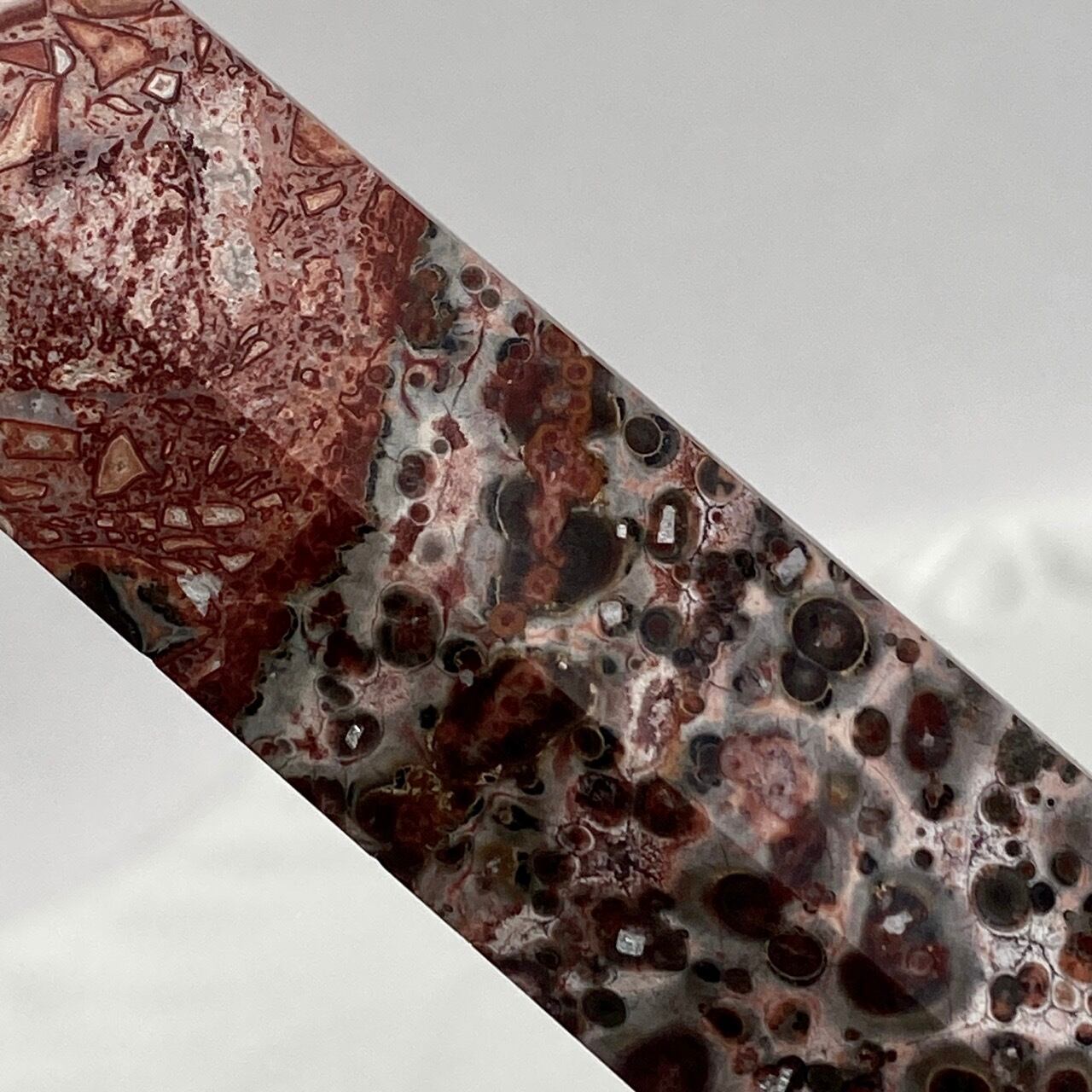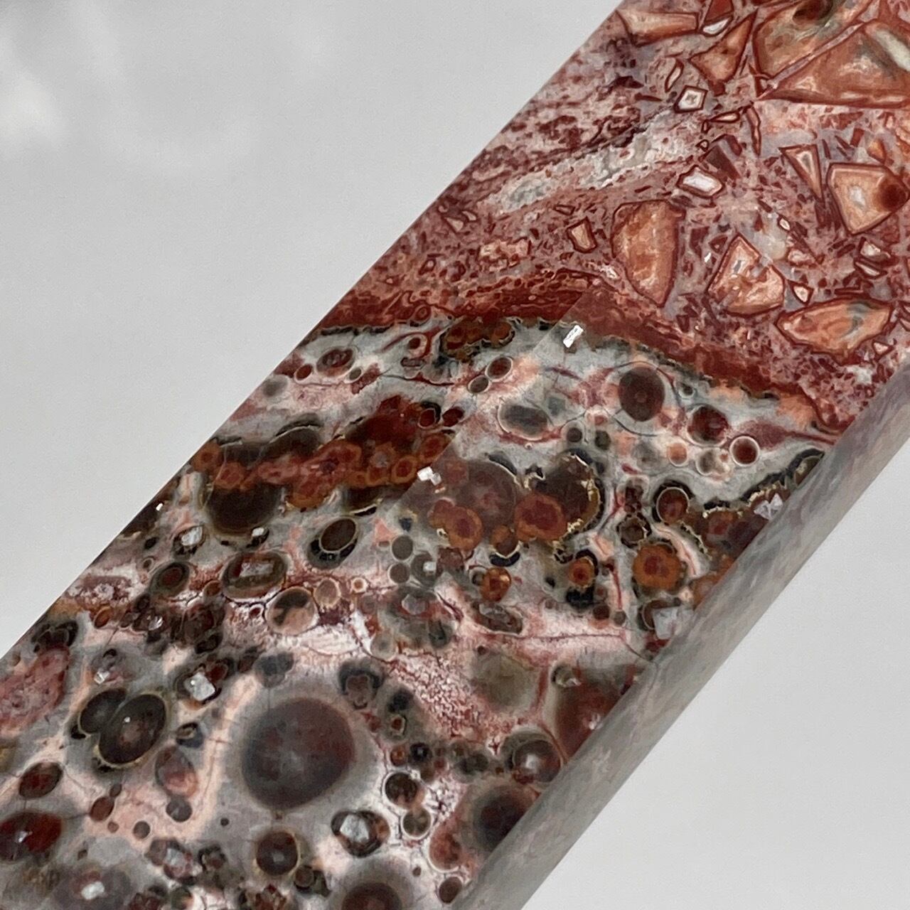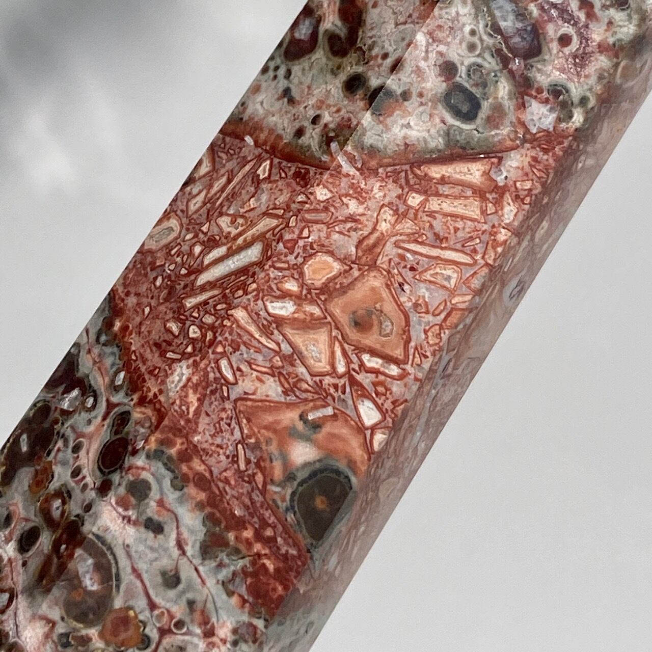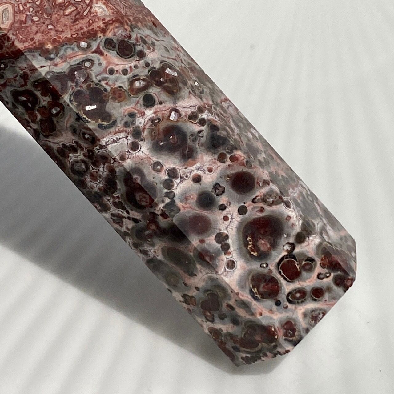 模様が豹柄のようである事からレオパードスキンジャスパーと呼ばれる石のポイントです。特徴は、一面に見られる、オビキュラー(円形)模様や線の数々です。この模様が思い起こさせるのは、