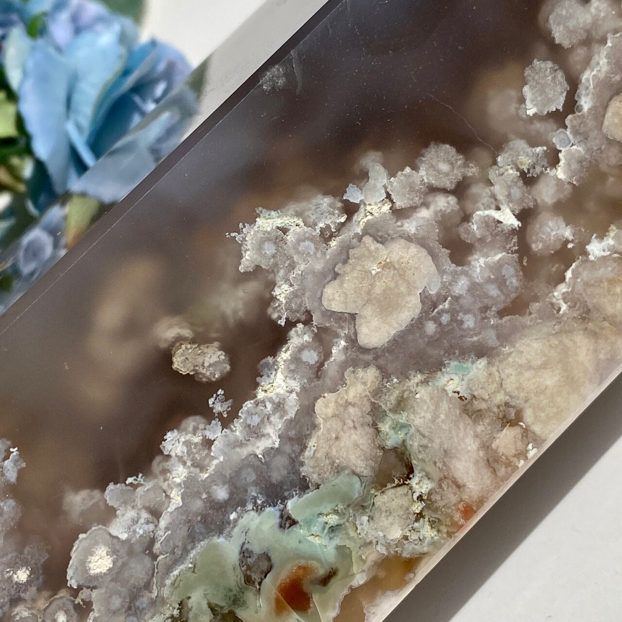 前面と後ろ面に入った縦の模様に入ったあぶくのようなペールブルーグレーの小さい花々とペールピンクの可憐な花々、ペールグリーンの葉のような模様、そしてアクセントとしてカーネリアンが入った、美しい乙女なタワーです。サイズと重量により、非常に存在感があり、インテリアを素敵に装飾してくれる華やかな子です。