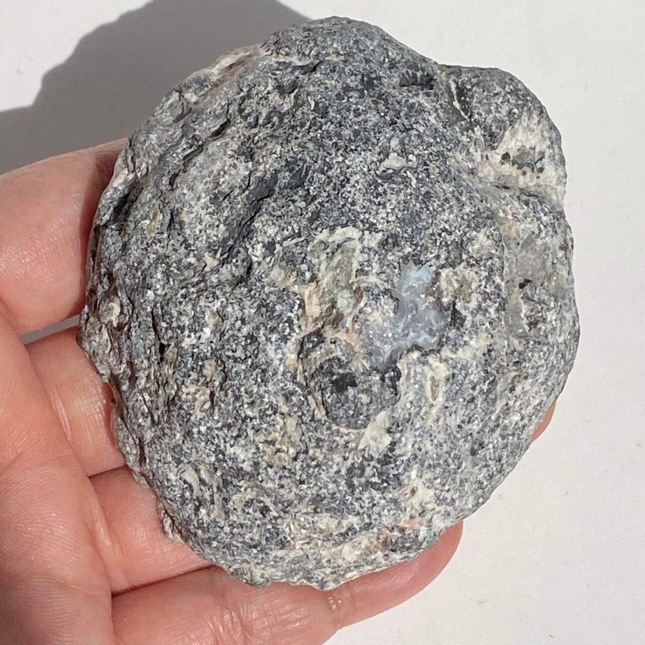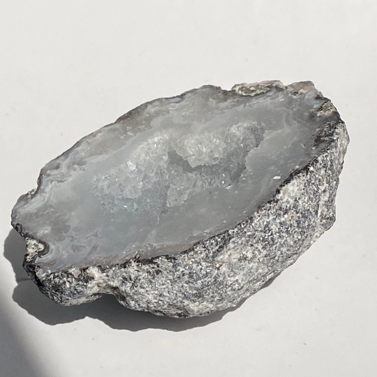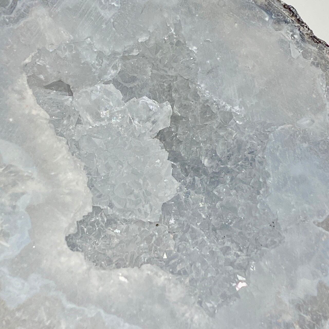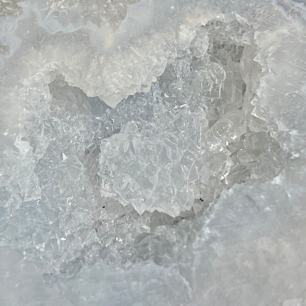 開口部には砂糖菓子のようなクォーツのドゥルージーが顔を覗かせており、氷を思わせるような細かい結晶のクラスターが金平糖のようなころっとした結晶の塊を抱いていて、その周りを同じく氷を思わせる半透明のアゲートが非常に涼しげな見た目を創り出しています。