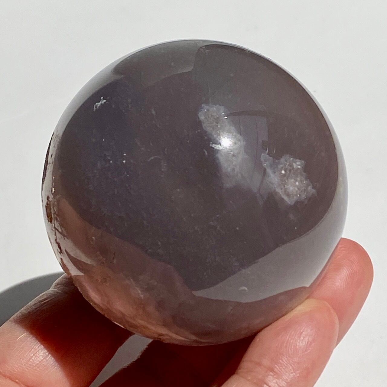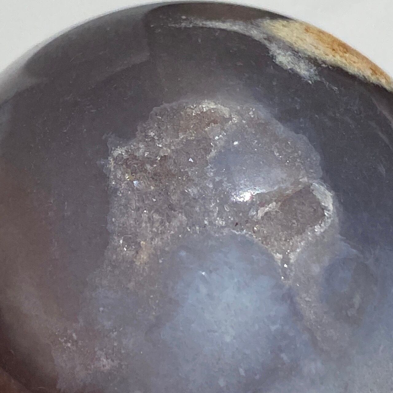 ブルー(パープル)がかったグレーのベースには一部母岩(最終画像掲載)やミルキーなもやのような箇所(最後から2枚目の画像掲載)、そして大小のドゥルージーのポケットが2箇所あります。大きな方のポケットには、砂糖菓子のようなきらきらと輝くころっとしたドゥルージー(グレイッシュな非常に淡いパープル色)が顔を覗かせていて、そこからエクリュ色のオーブ(円形)模様が流れ星の軌跡のように並列していて、まるで小宇宙や銀河を思わせるような子です。一方、小さい方のポケットからもクォーツのきらめきが見られます。