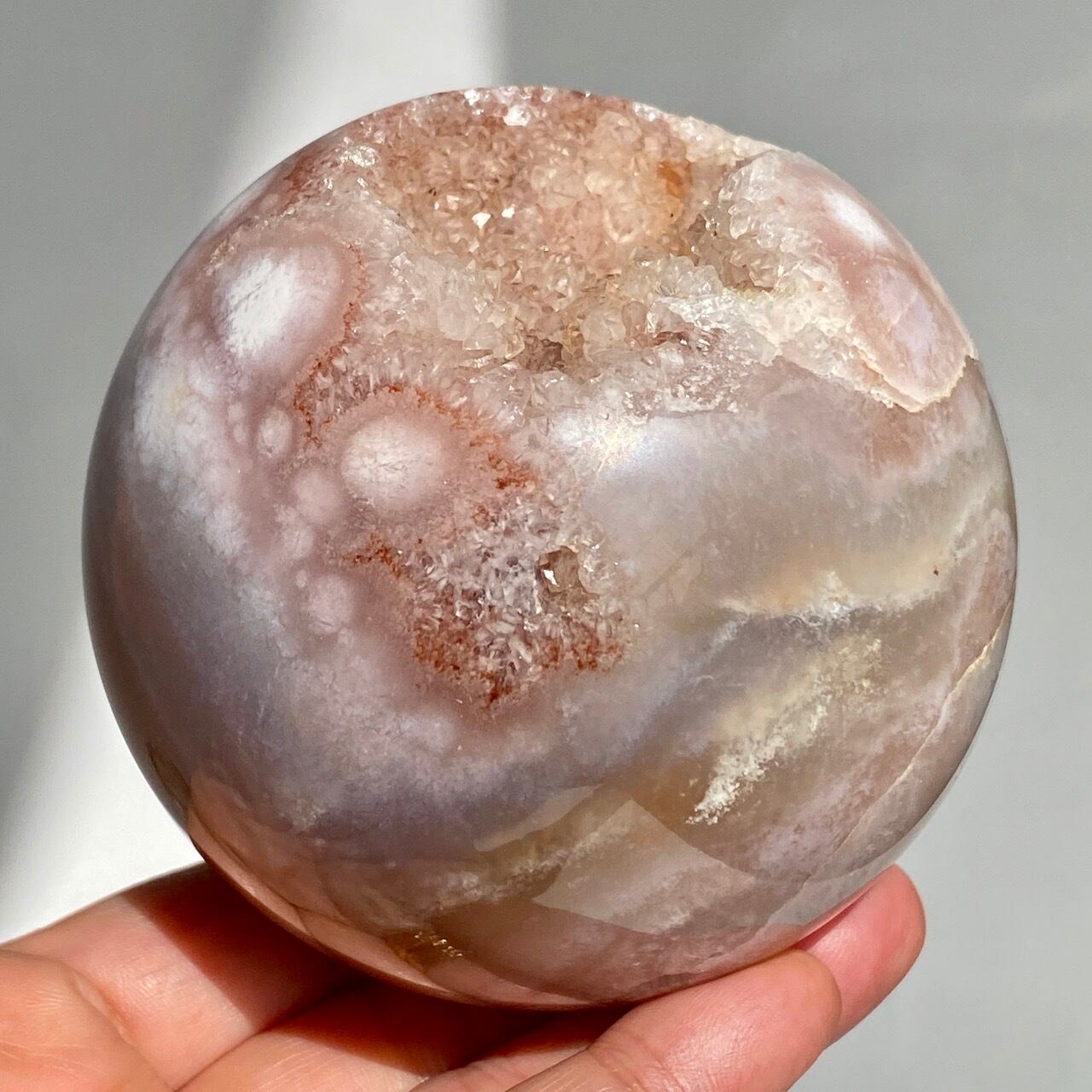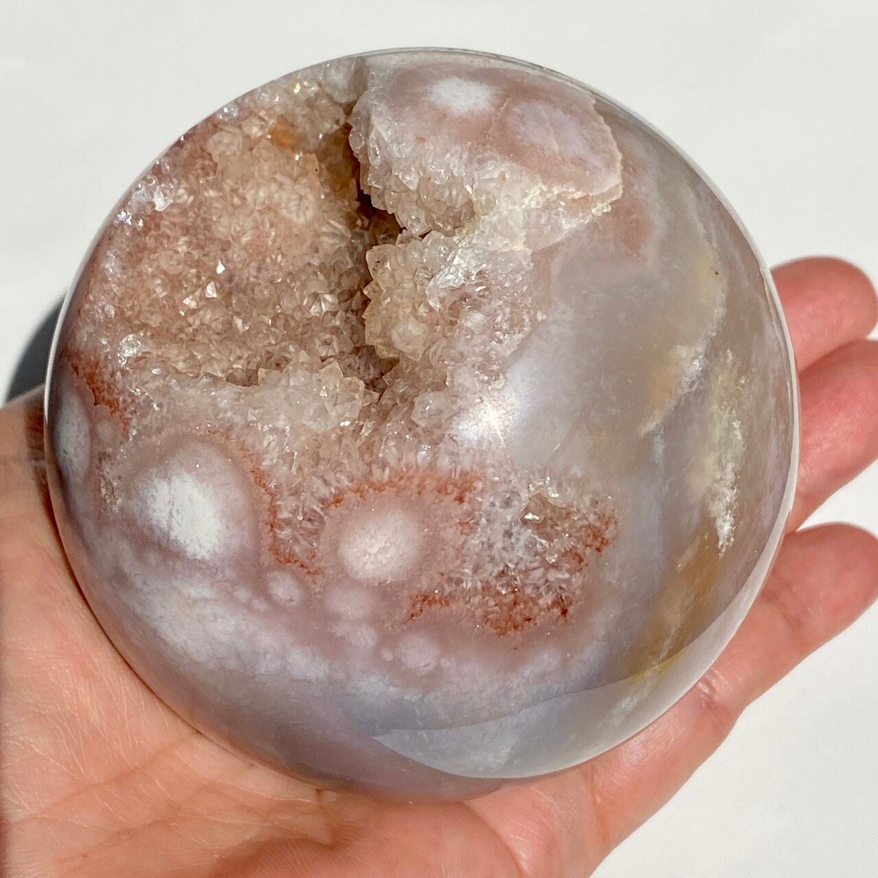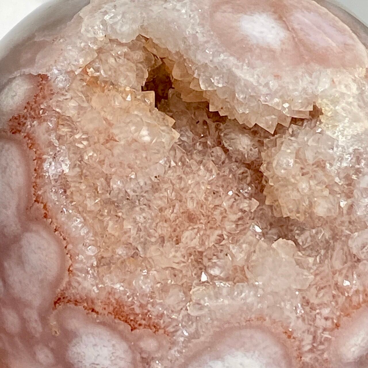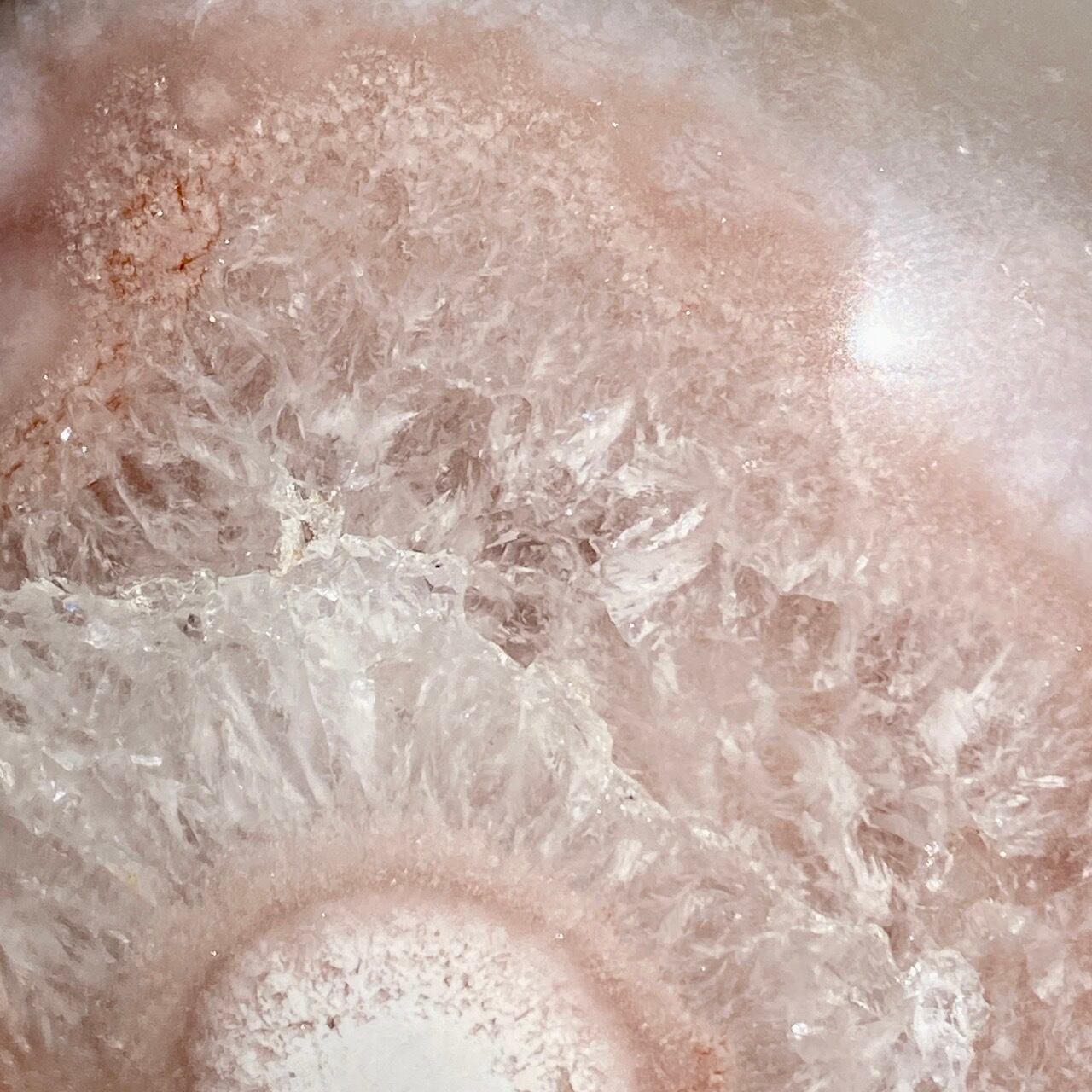 ブルーグレー(部分的に蜂蜜色の箇所有り)のアゲートとピンクアメシストのコンビネーションが素敵なスフィアです。大きなドゥルージーポケットから覗く、金平糖なのようなころっとした淡くてスモーキーなピンクのドゥルージーが煌めき、そのポケットの周りには、ミルキーな色のオーブ(円形模様)がスカラップレースのように取り囲んでいて魅力的です。またこのドゥルージー部分以外にも、クォーツ化している箇所があります。鮮やかなピンクでは無く、すこしくすんだスモーキーで柔らかいピンクをお好みの方におすすめです。