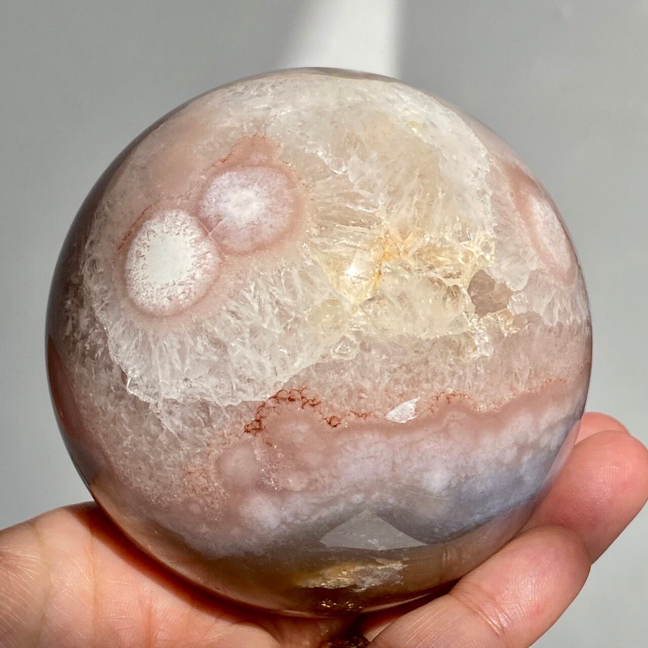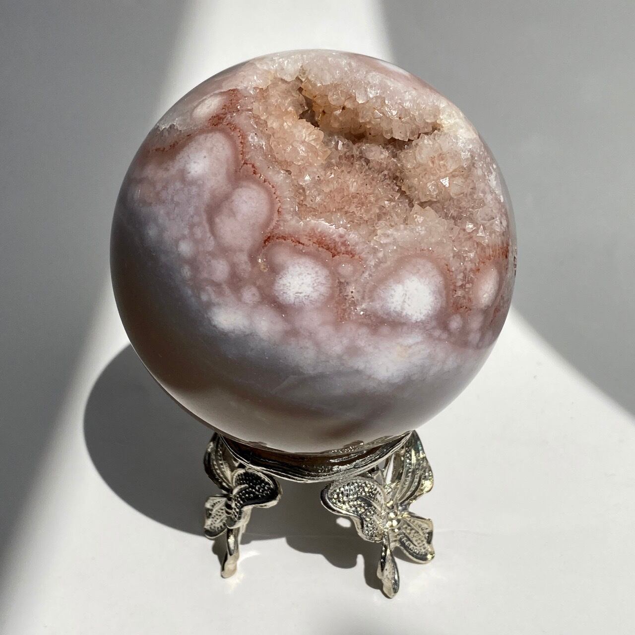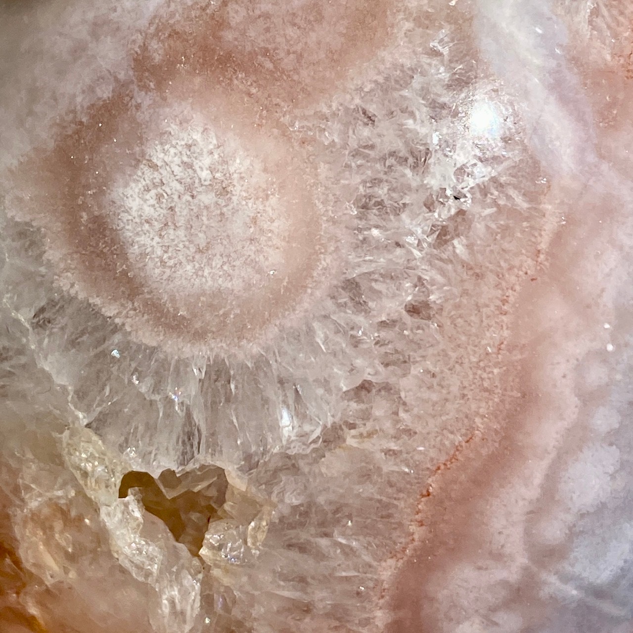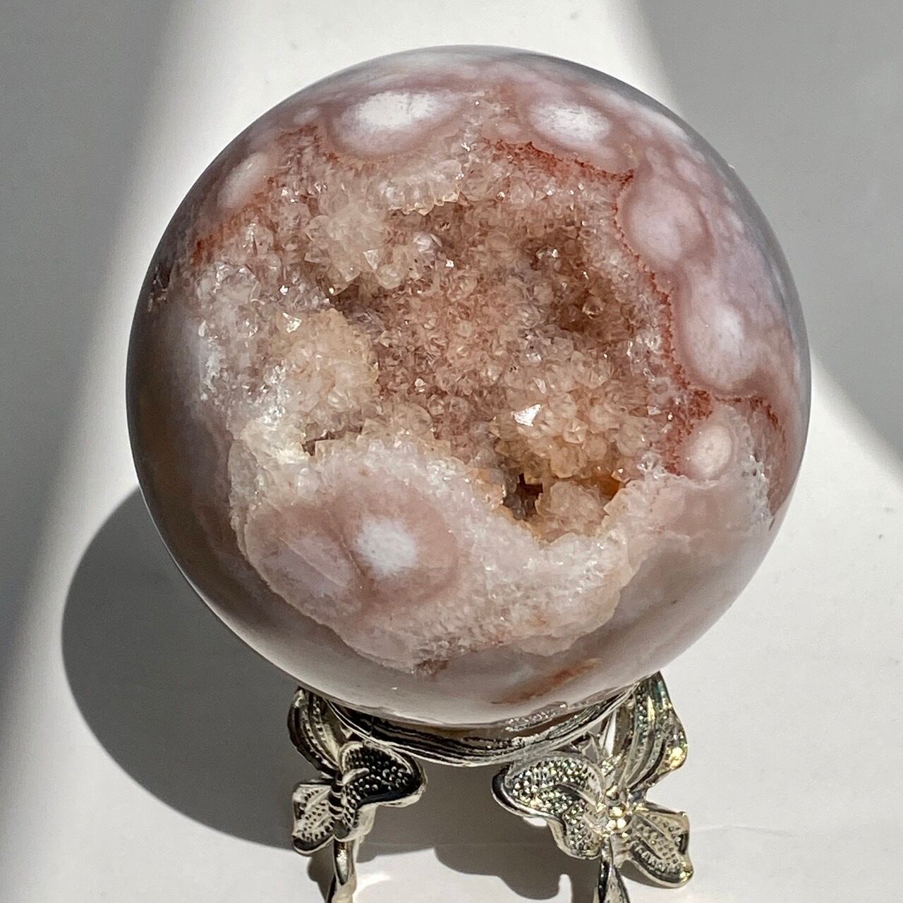 ブルーグレー(部分的に蜂蜜色の箇所有り)のアゲートとピンクアメシストのコンビネーションが素敵なスフィアです。大きなドゥルージーポケットから覗く、金平糖なのようなころっとした淡くてスモーキーなピンクのドゥルージーが煌めき、そのポケットの周りには、ミルキーな色のオーブ(円形模様)がスカラップレースのように取り囲んでいて魅力的です。またこのドゥルージー部分以外にも、クォーツ化している箇所があります。鮮やかなピンクでは無く、すこしくすんだスモーキーで柔らかいピンクをお好みの方におすすめです。