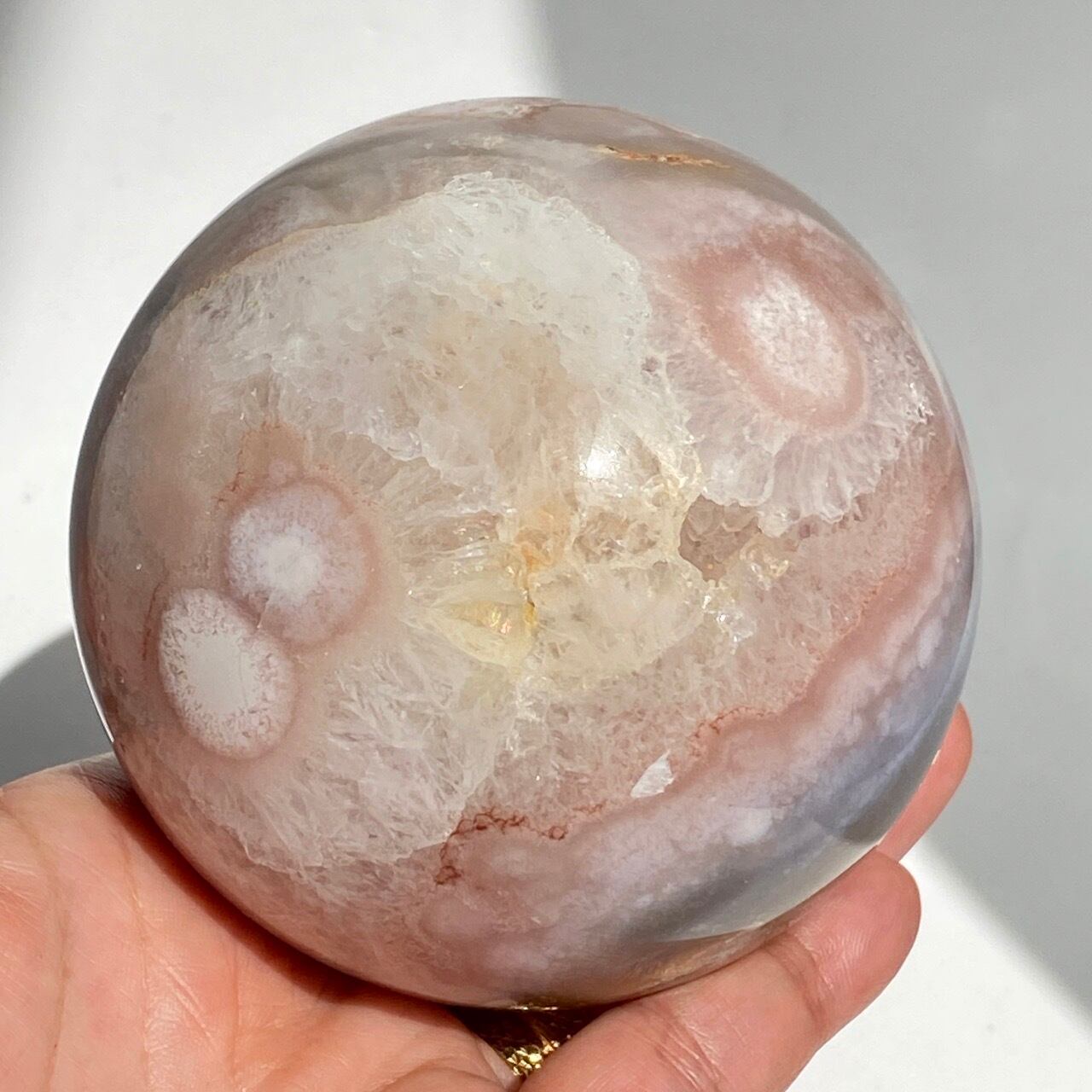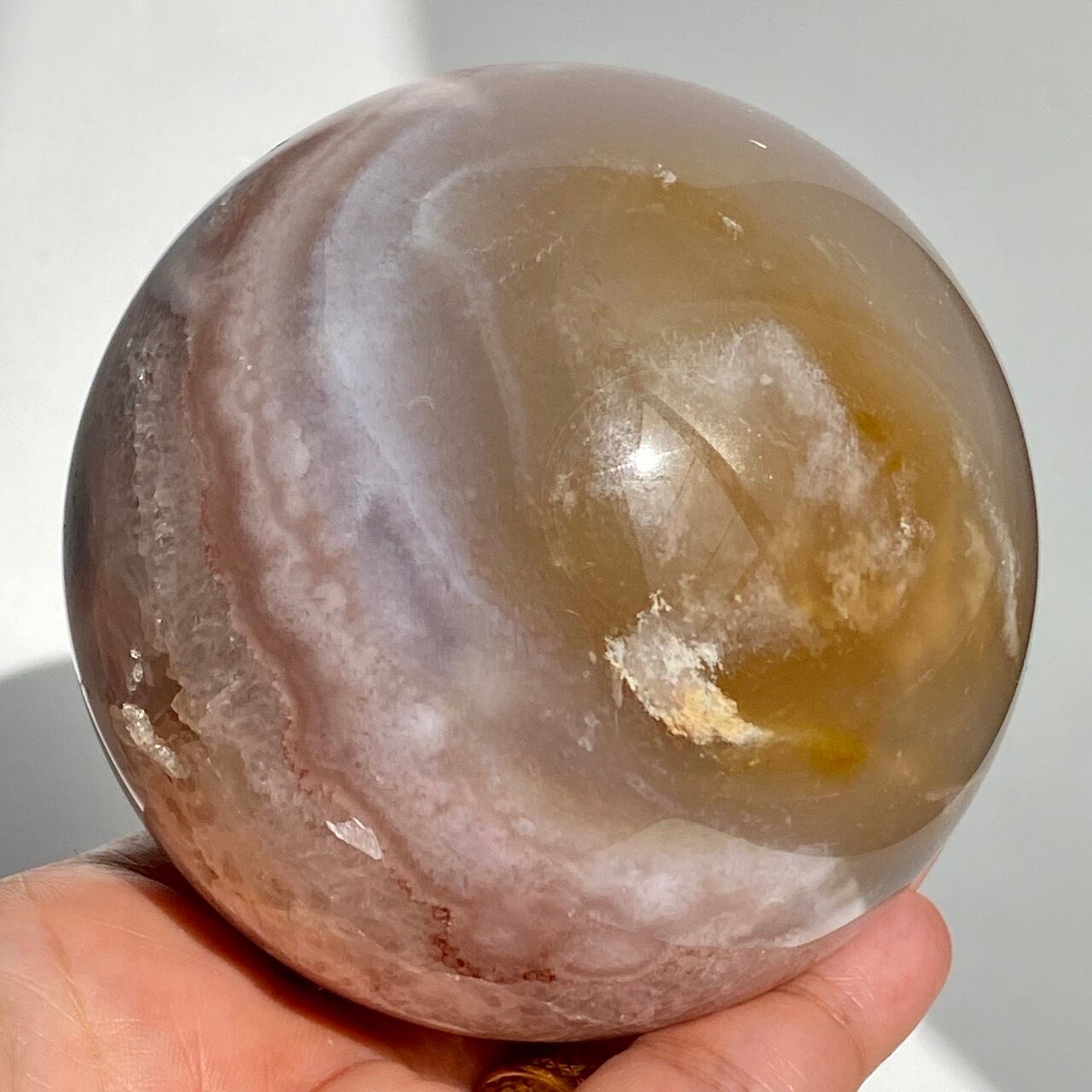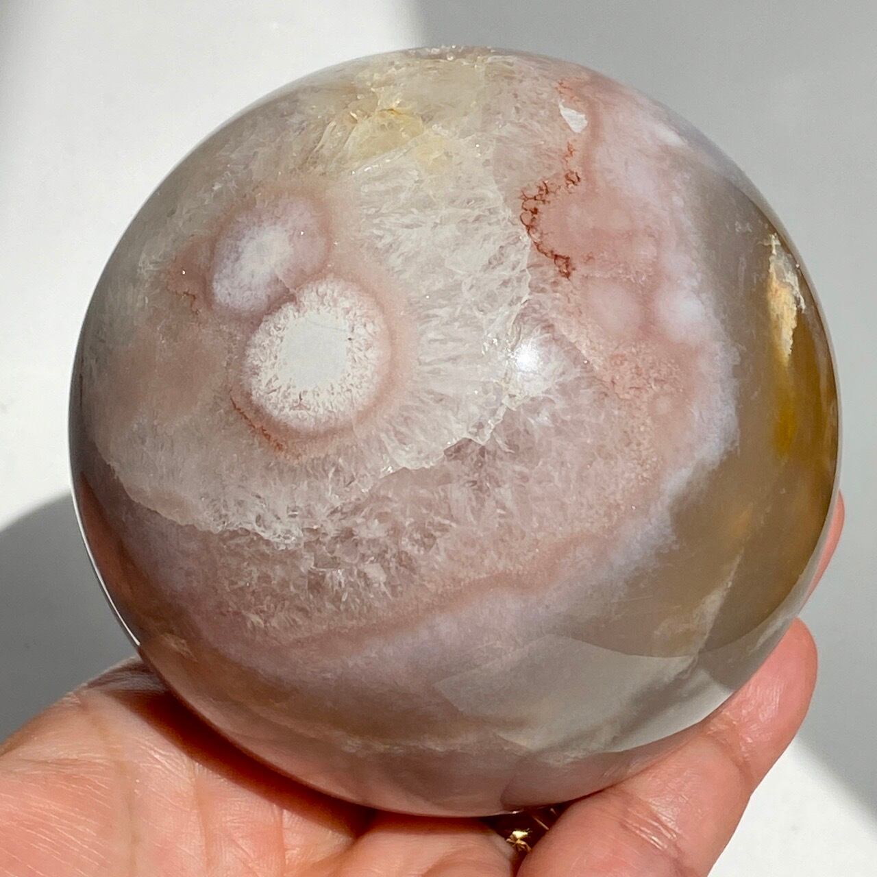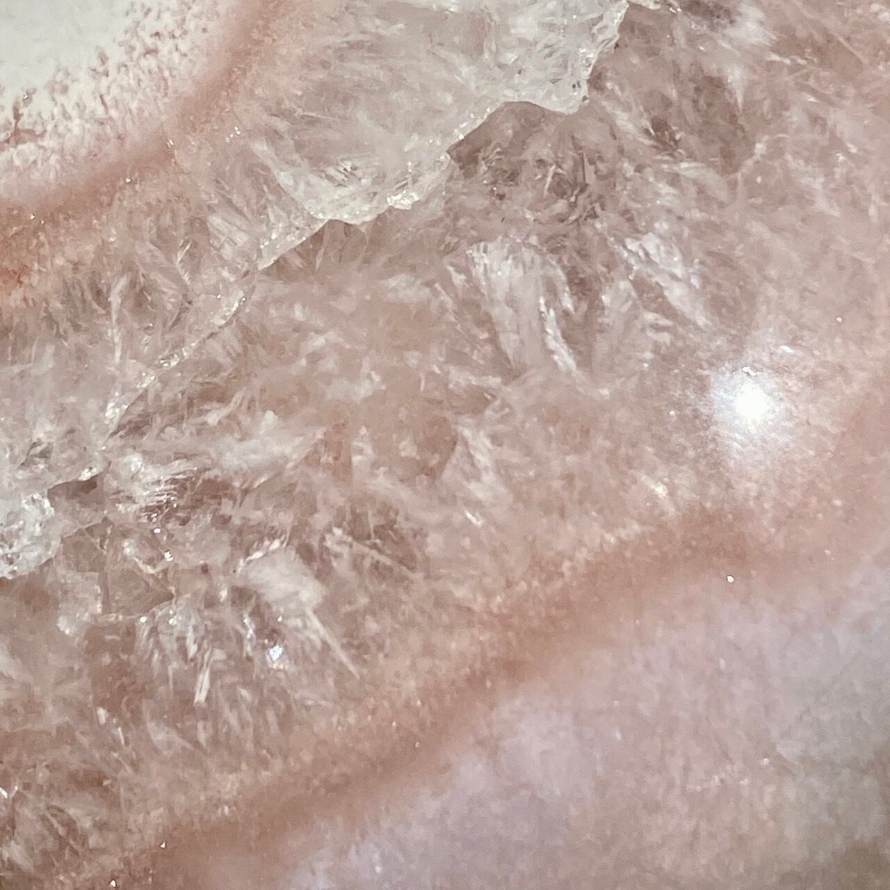 ブルーグレー(部分的に蜂蜜色の箇所有り)のアゲートとピンクアメシストのコンビネーションが素敵なスフィアです。大きなドゥルージーポケットから覗く、金平糖なのようなころっとした淡くてスモーキーなピンクのドゥルージーが煌めき、そのポケットの周りには、ミルキーな色のオーブ(円形模様)がスカラップレースのように取り囲んでいて魅力的です。またこのドゥルージー部分以外にも、クォーツ化している箇所があります。鮮やかなピンクでは無く、すこしくすんだスモーキーで柔らかいピンクをお好みの方におすすめです。