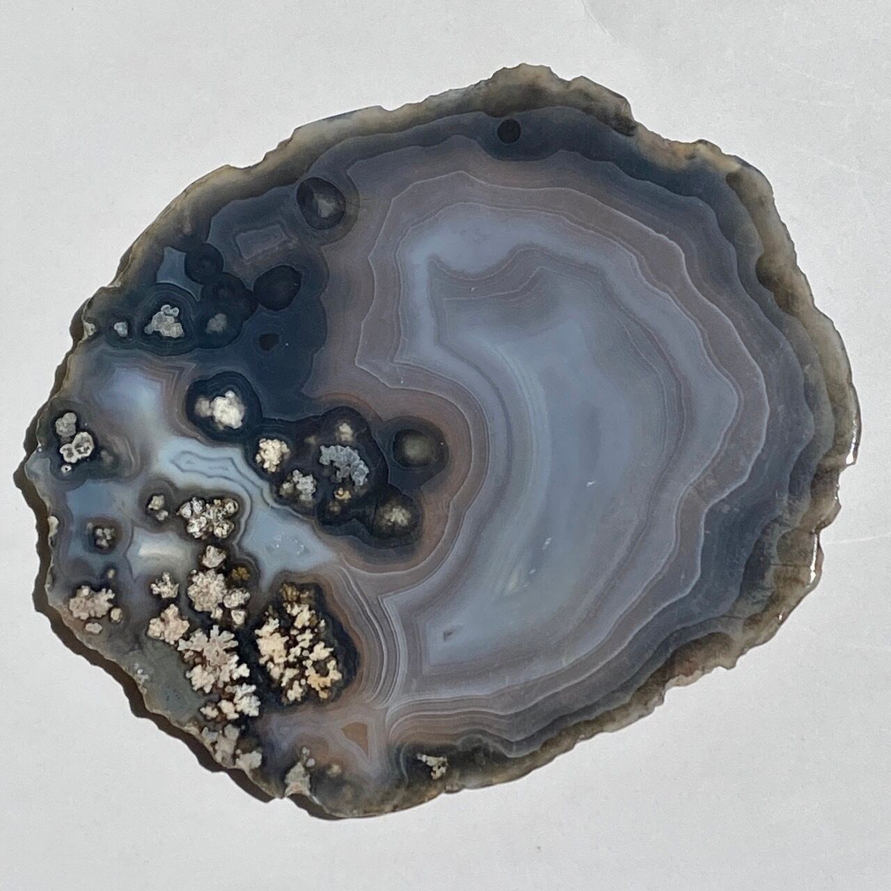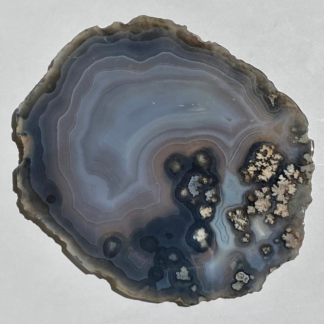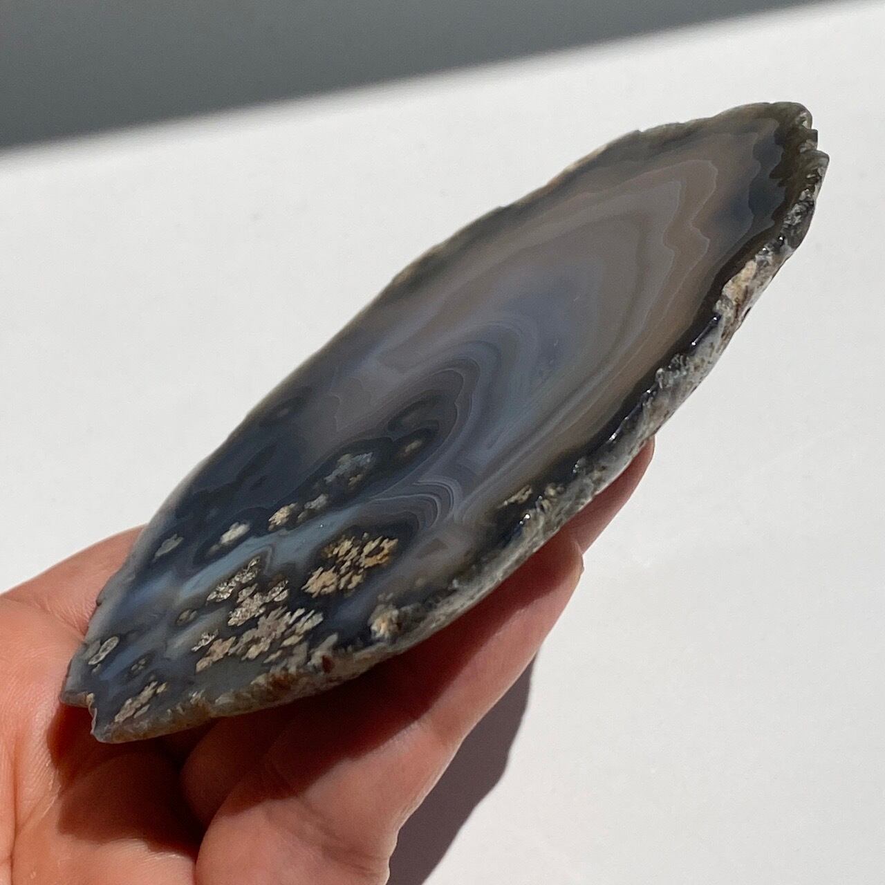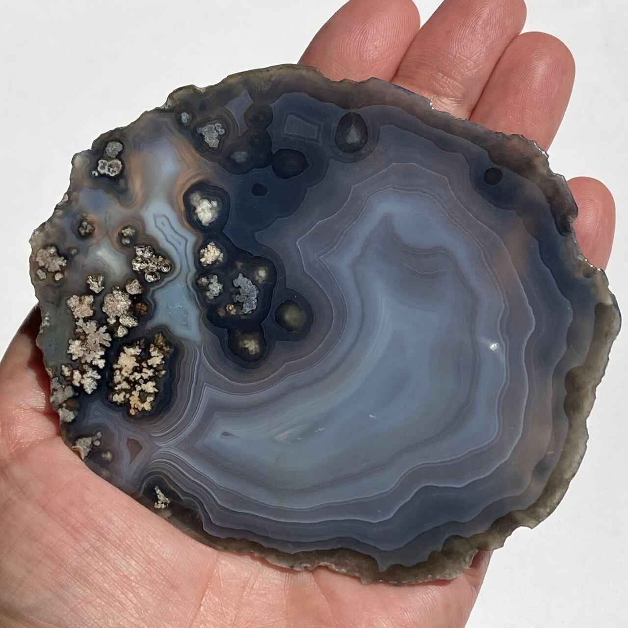 ブルーグレーのグラデーションが形成するバンディング(帯状の模様)と極小の花が群生しているお花畑のような模様がはいったスラブになります。光に透かすと半透明部分が褪せたピンク色(もしくは黄色っぽい色味)に見えます(4枚目画像参照)。クォーツのポイントやクラスター、ミニ石や天使、動物などのカービング、そしてペンデュラムなどを置いても可愛いですし、アイデアが膨らみます。可愛いオススメの子です。最後の3枚の画像は裏面になります。また、エッジの部分は少しだけ研磨されていますが、ナチュラルな質感になっています。