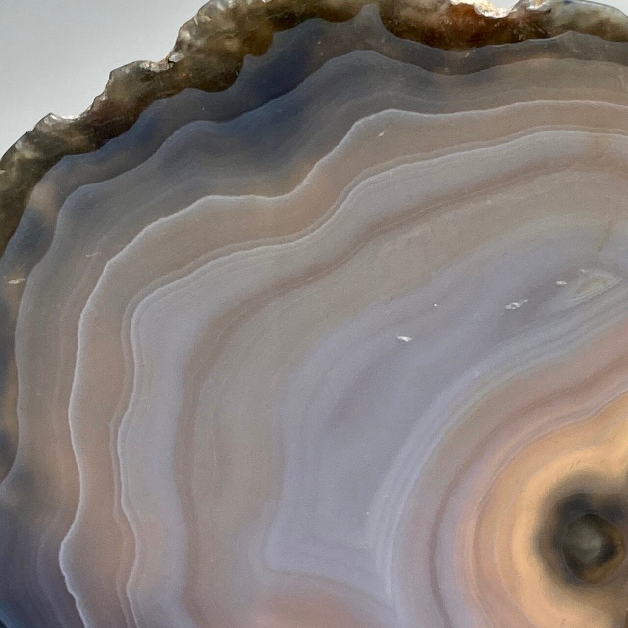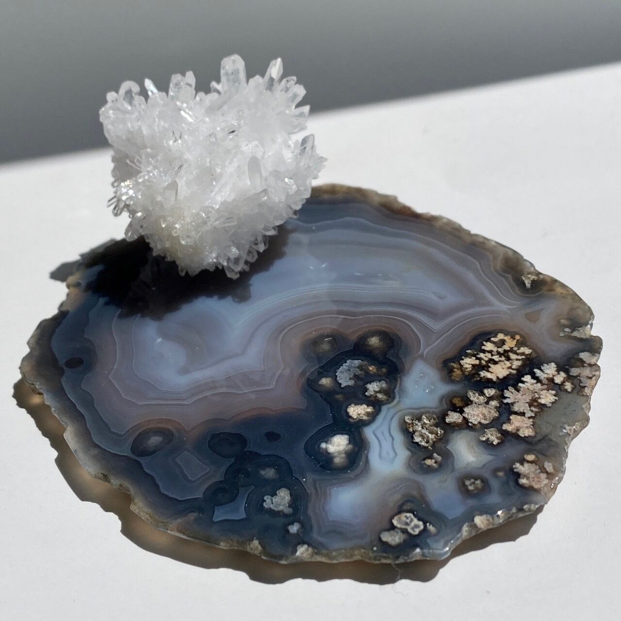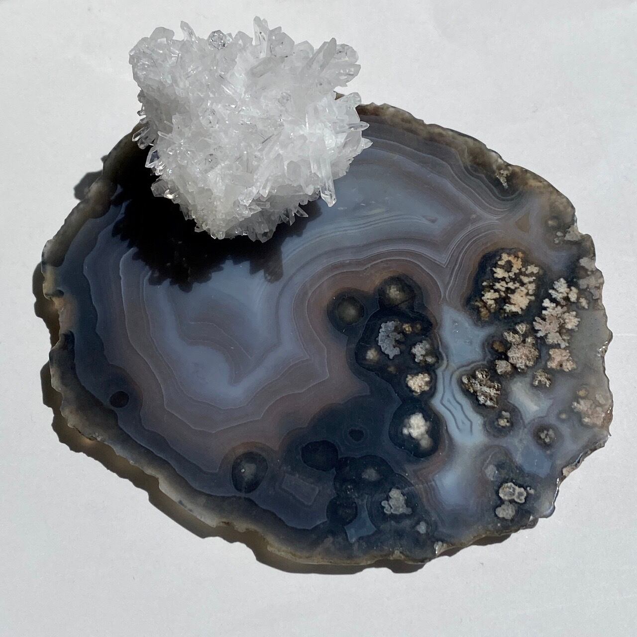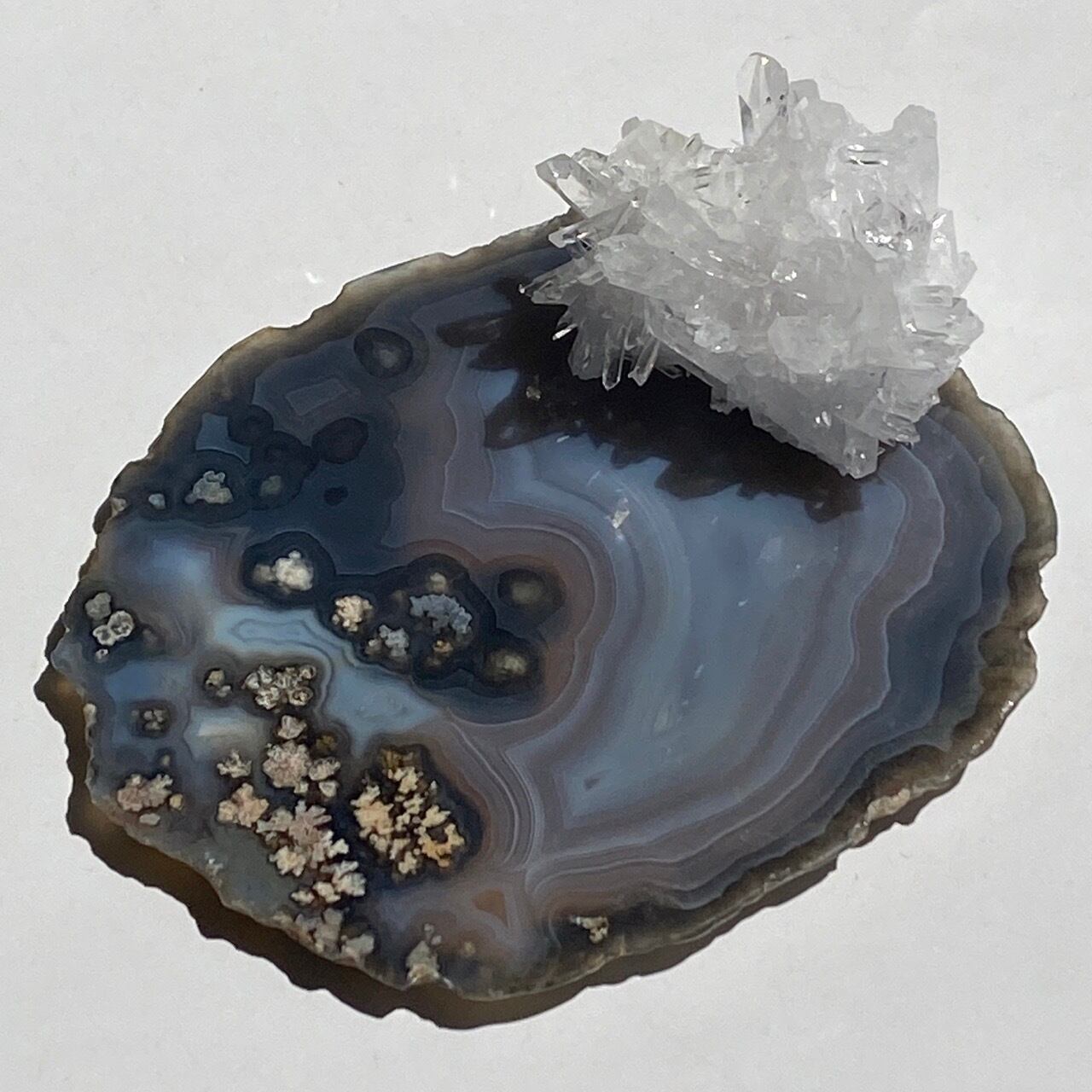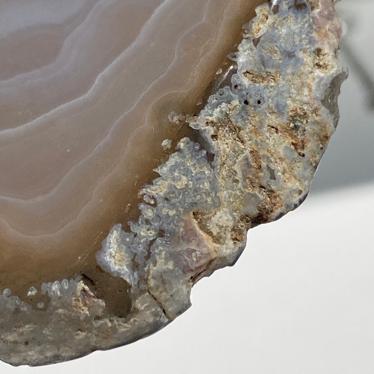 ブルーグレーのグラデーションが形成するバンディング(帯状の模様)と極小の花が群生しているお花畑のような模様がはいったスラブになります。光に透かすと半透明部分が褪せたピンク色(もしくは黄色っぽい色味)に見えます(4枚目画像参照)。クォーツのポイントやクラスター、ミニ石や天使、動物などのカービング、そしてペンデュラムなどを置いても可愛いですし、アイデアが膨らみます。可愛いオススメの子です。最後の3枚の画像は裏面になります。また、エッジの部分は少しだけ研磨されていますが、ナチュラルな質感になっています。