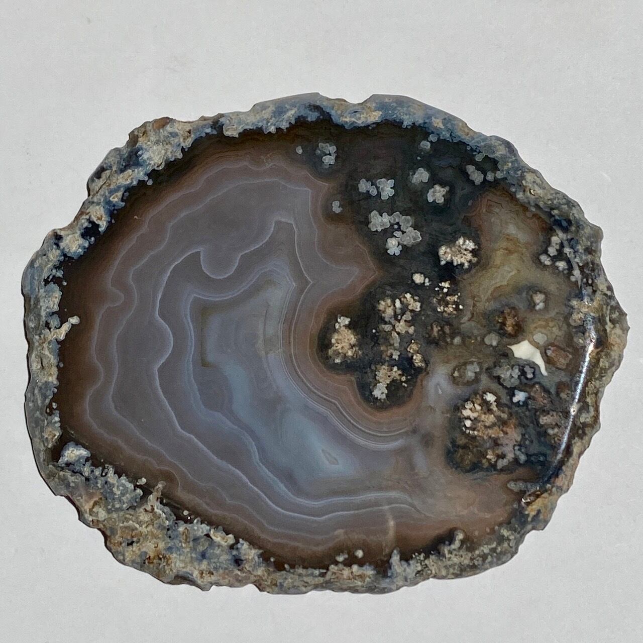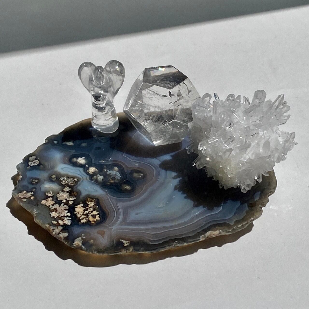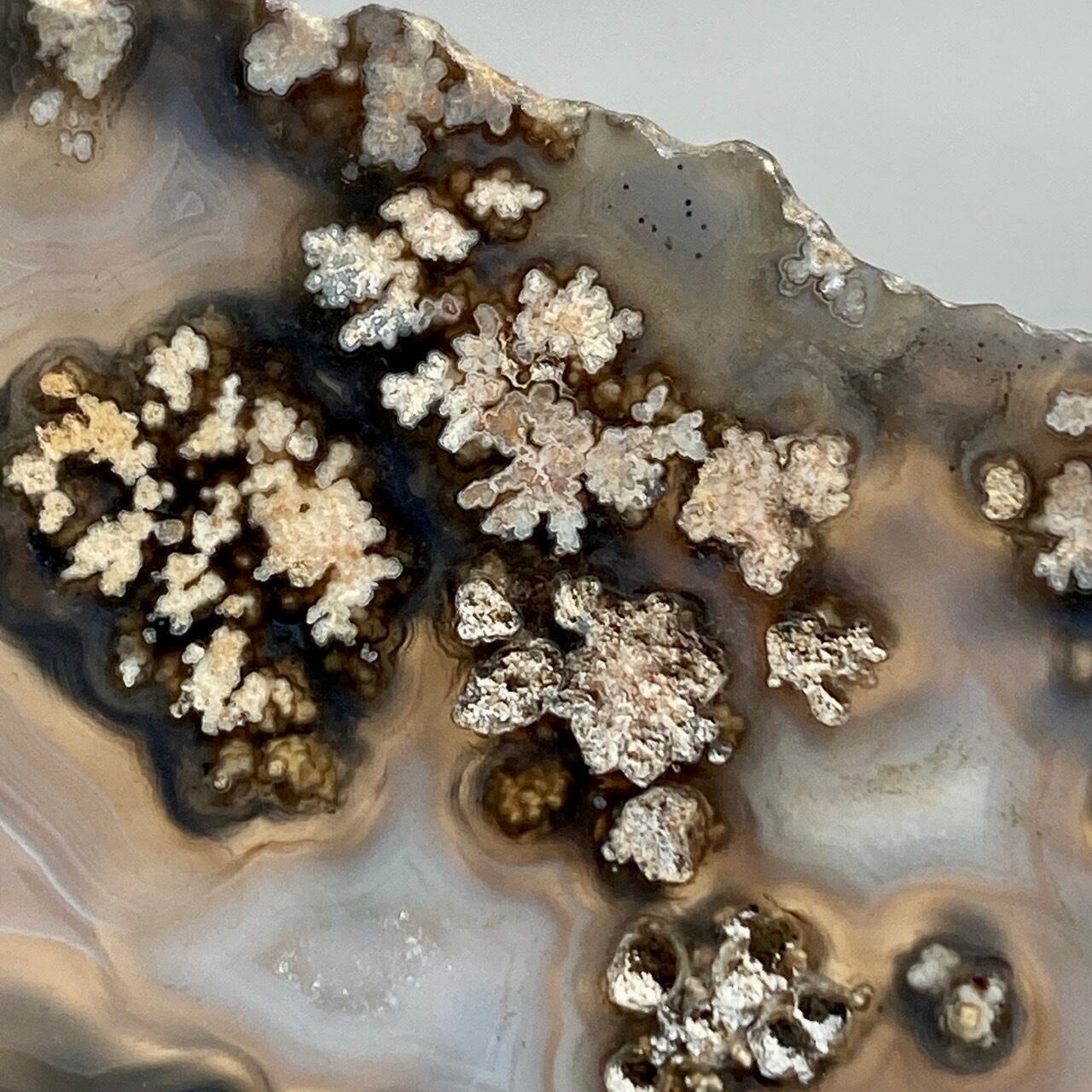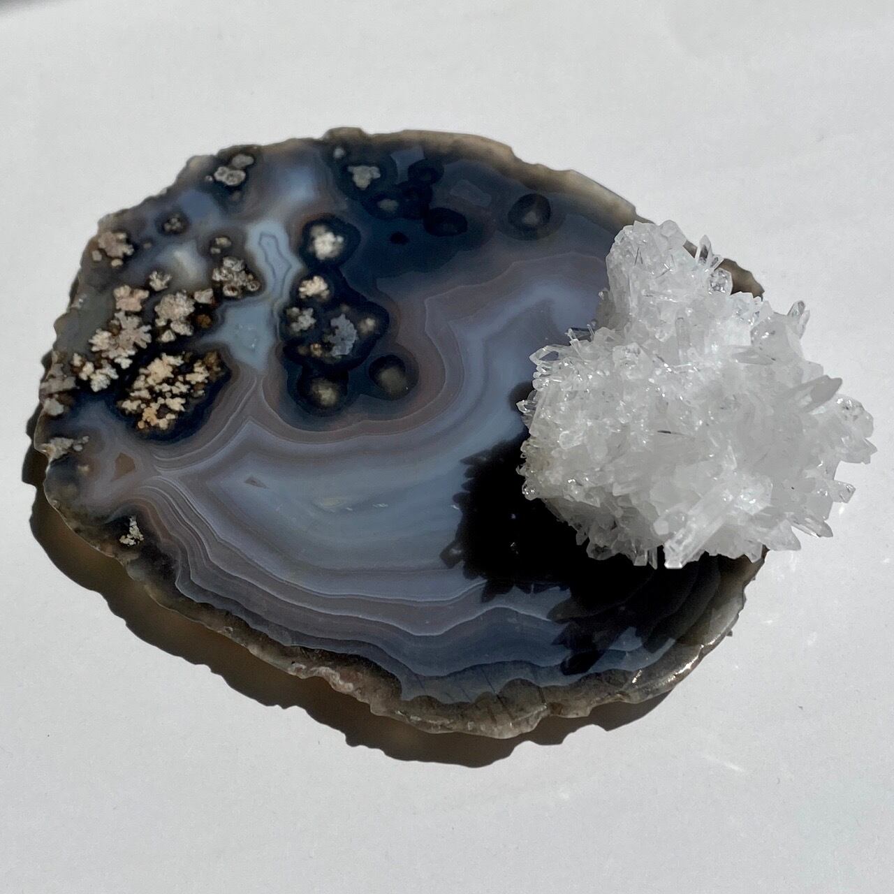 ブルーグレーのグラデーションが形成するバンディング(帯状の模様)と極小の花が群生しているお花畑のような模様がはいったスラブになります。光に透かすと半透明部分が褪せたピンク色(もしくは黄色っぽい色味)に見えます(4枚目画像参照)。クォーツのポイントやクラスター、ミニ石や天使、動物などのカービング、そしてペンデュラムなどを置いても可愛いですし、アイデアが膨らみます。可愛いオススメの子です。最後の3枚の画像は裏面になります。また、エッジの部分は少しだけ研磨されていますが、ナチュラルな質感になっています。