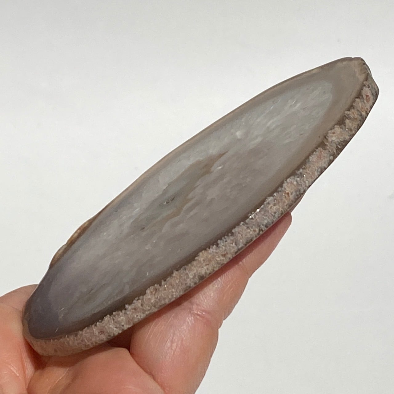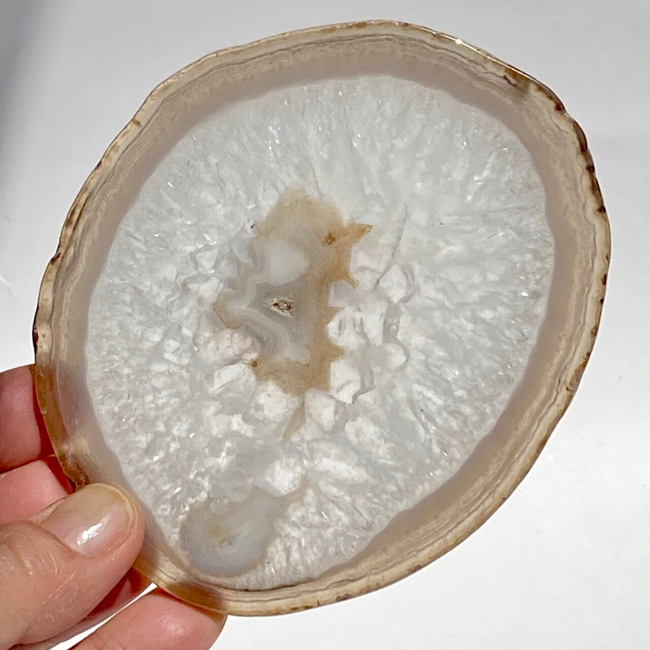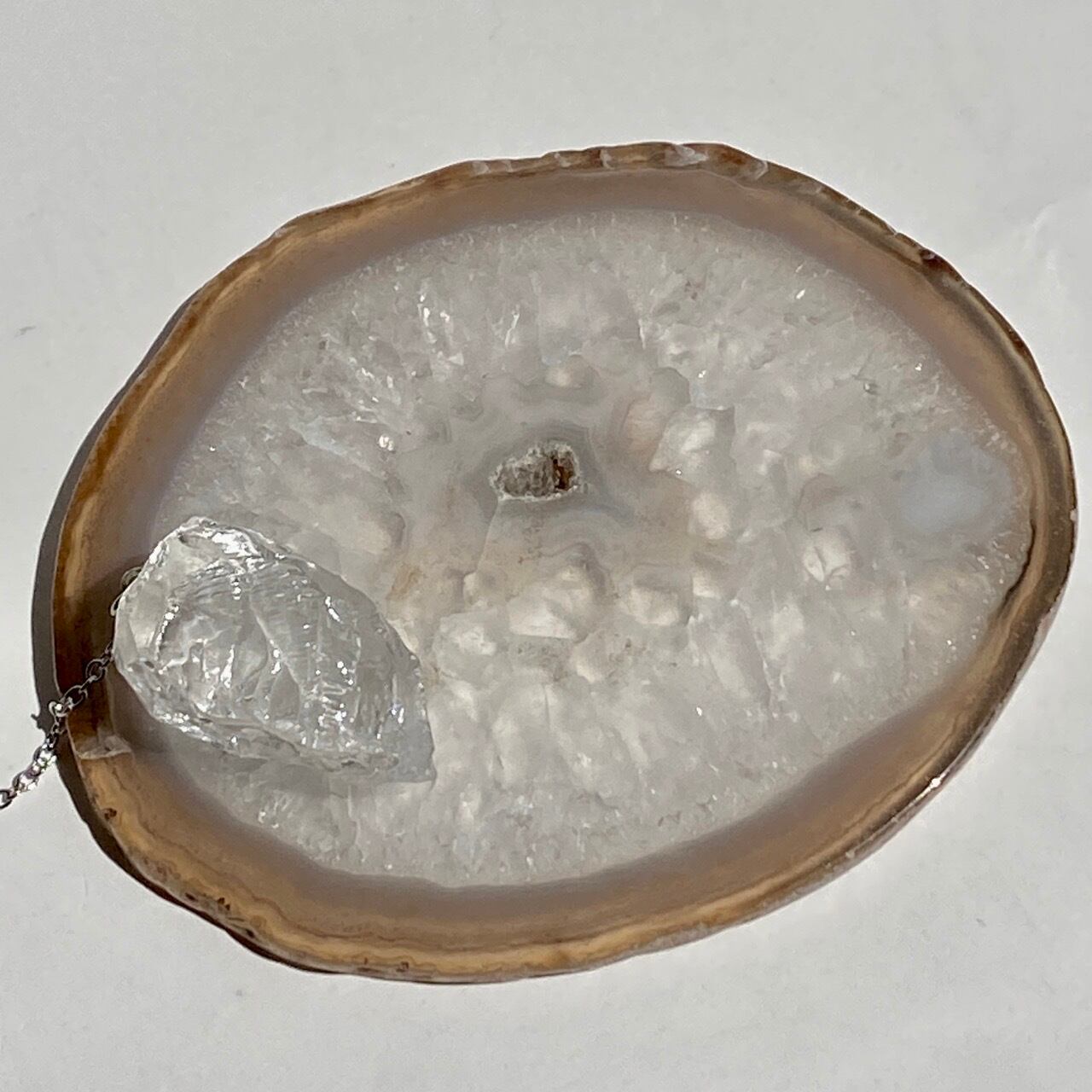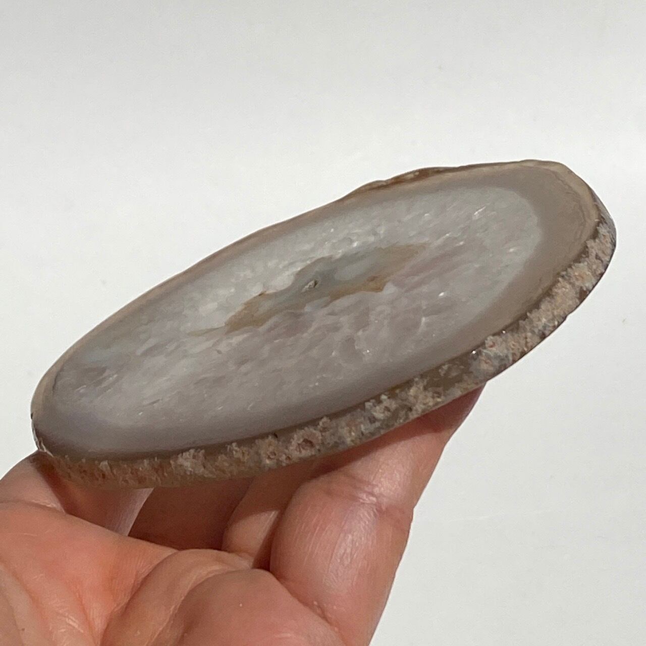クォーツの結晶が大部分を占め、光に透かすと結晶の模様が美しく、それを半透明なで控えめなベージュの縁(淡いブルーグレーも見られます)が取り囲んでいるシックな子です。クォーツのポイントやクラスター、ミニ石や天使、動物などのカービング、そしてペンデュラムなどを置いても可愛いですし、アイデアが膨らみます。エッジの部分は少しだけ研磨されていますが、ナチュラルな質感になっています。