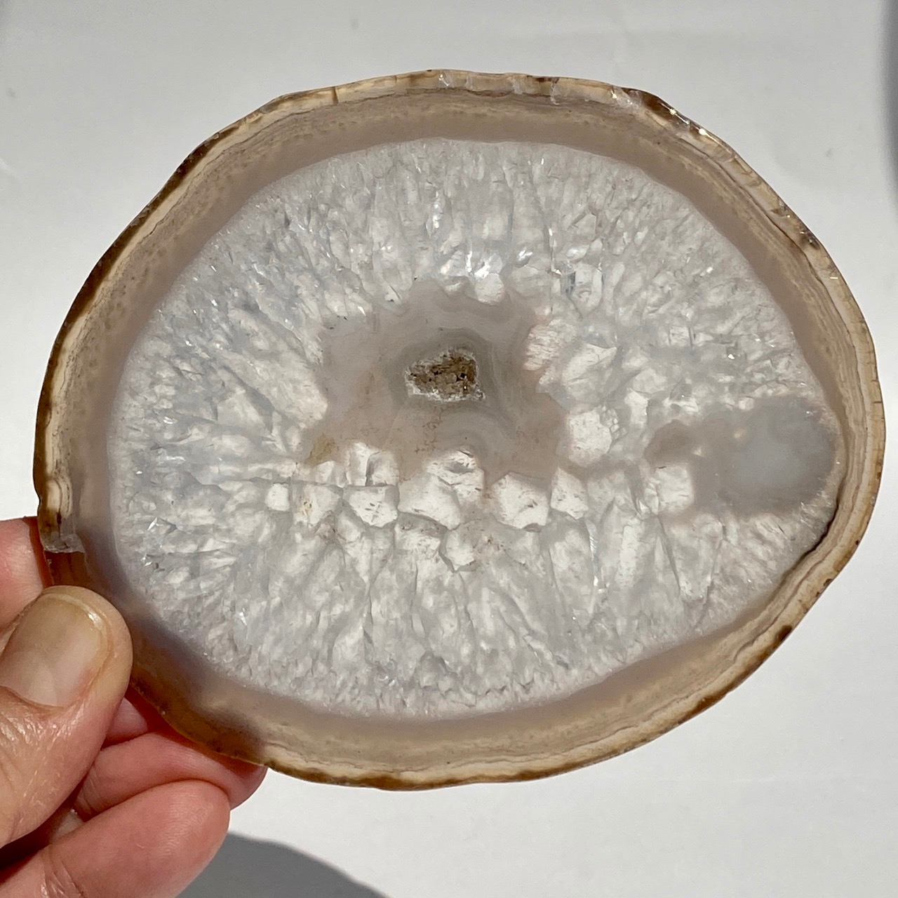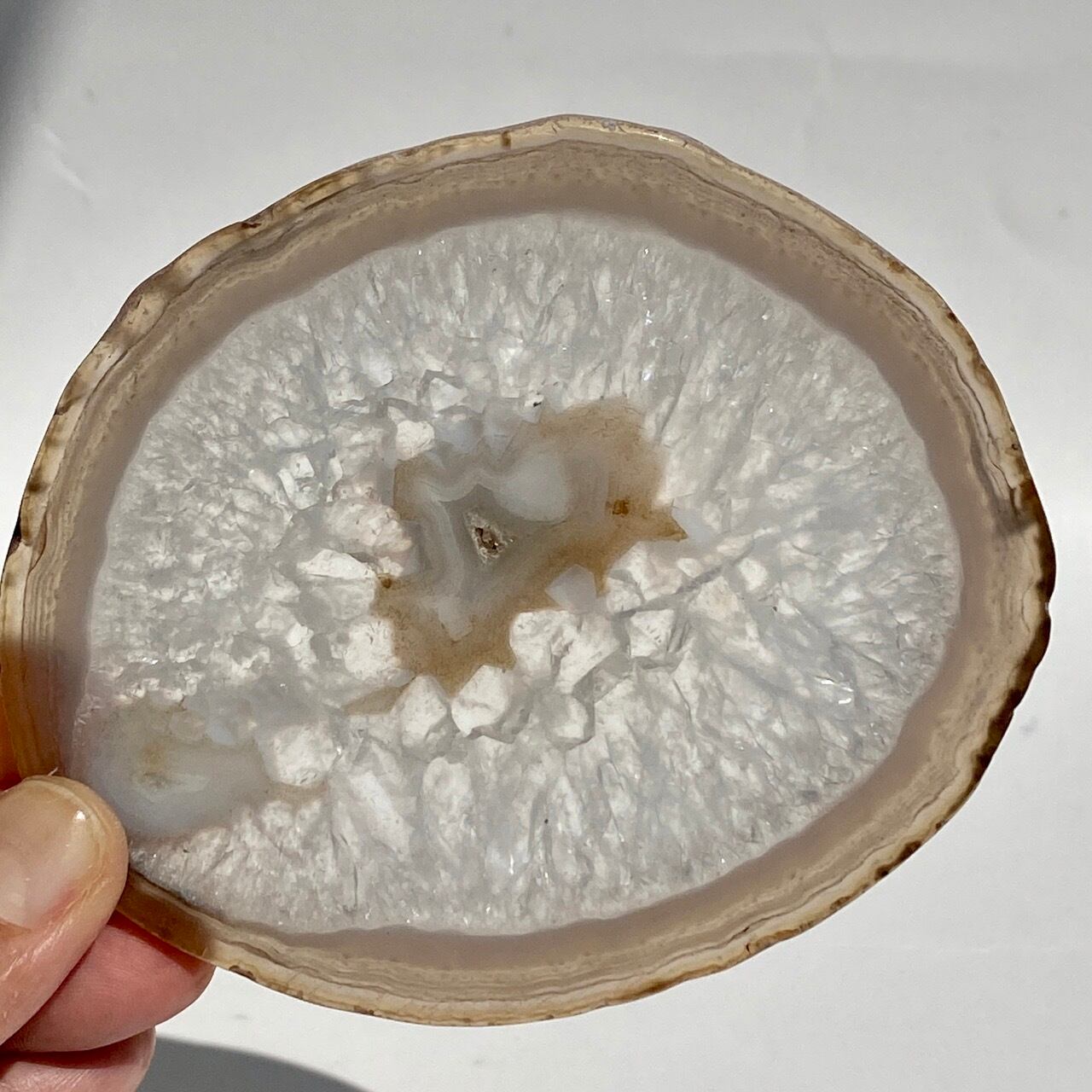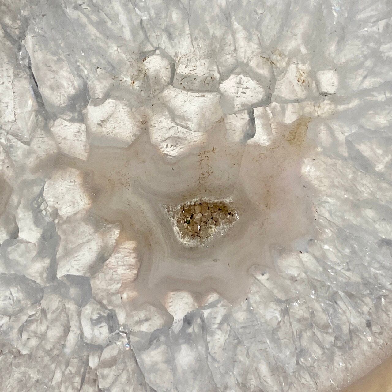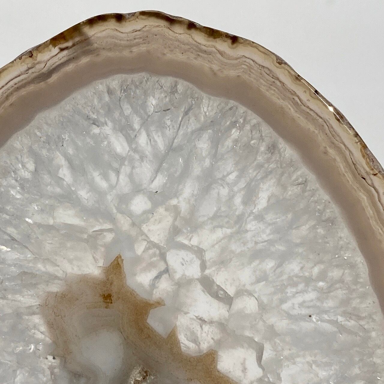 クォーツの結晶が大部分を占め、光に透かすと結晶の模様が美しく、それを半透明なで控えめなベージュの縁(淡いブルーグレーも見られます)が取り囲んでいるシックな子です。クォーツのポイントやクラスター、ミニ石や天使、動物などのカービング、そしてペンデュラムなどを置いても可愛いですし、アイデアが膨らみます。エッジの部分は少しだけ研磨されていますが、ナチュラルな質感になっています。