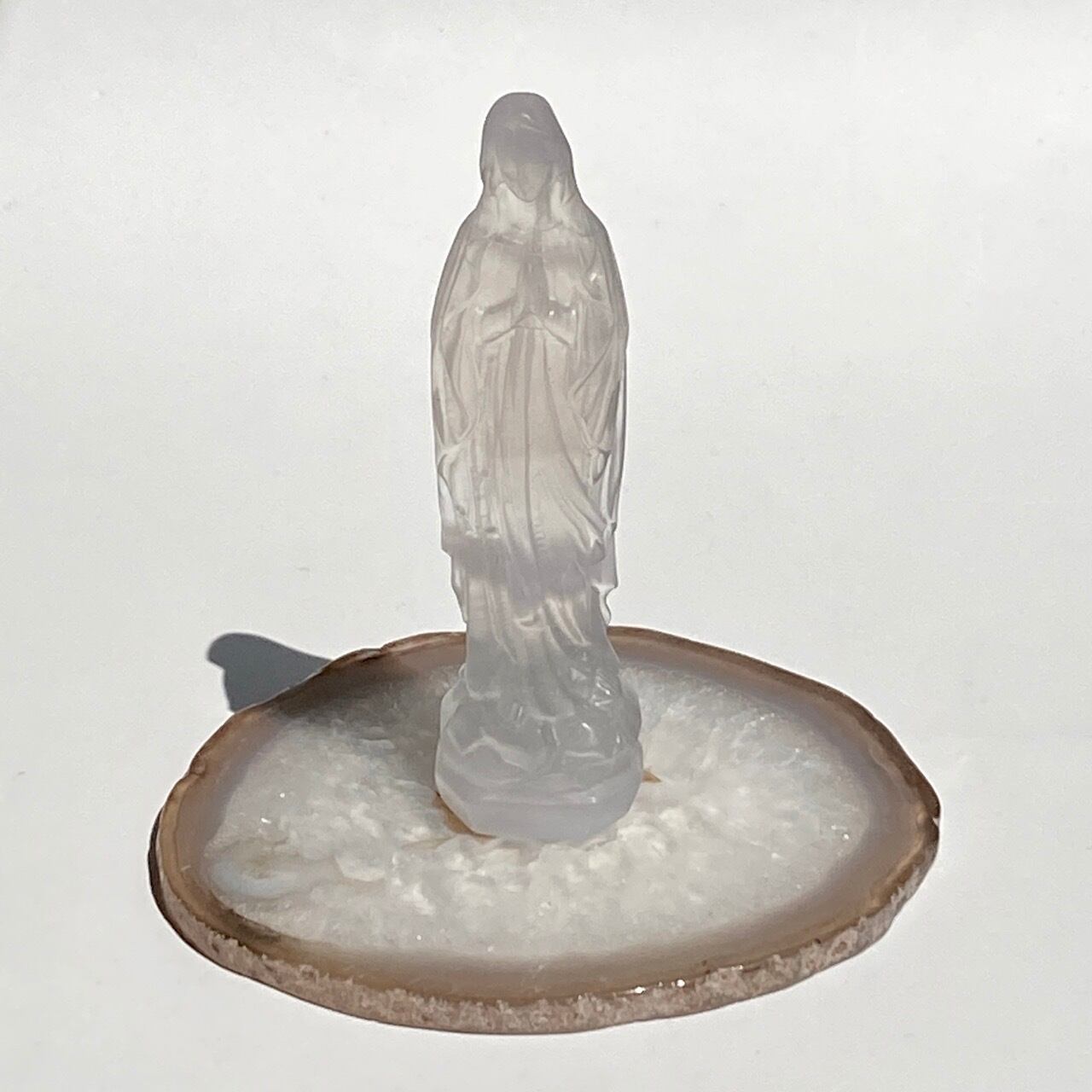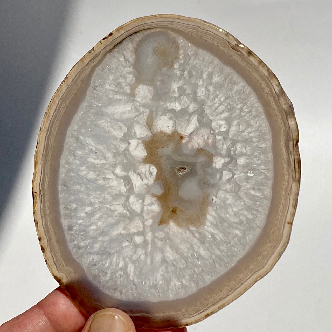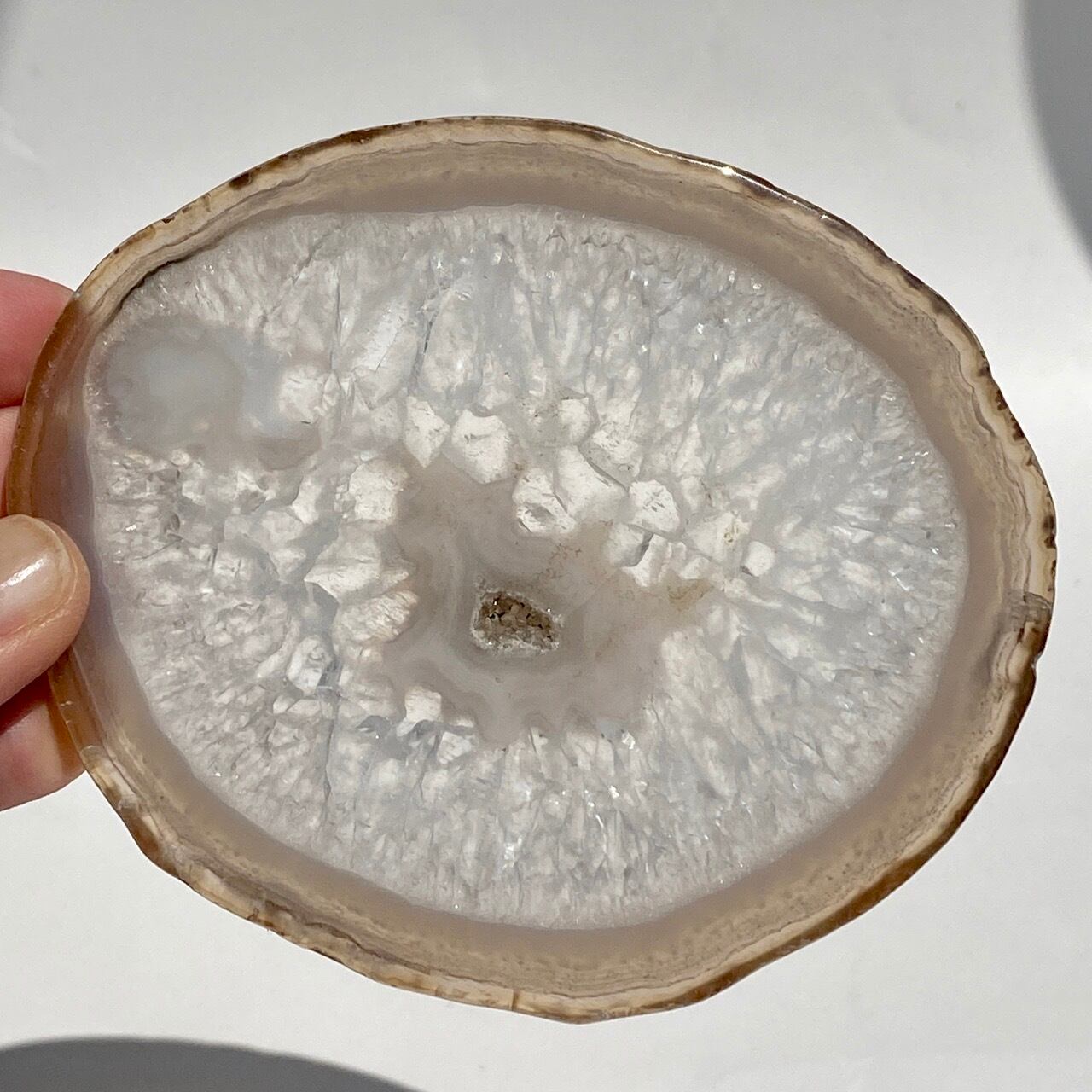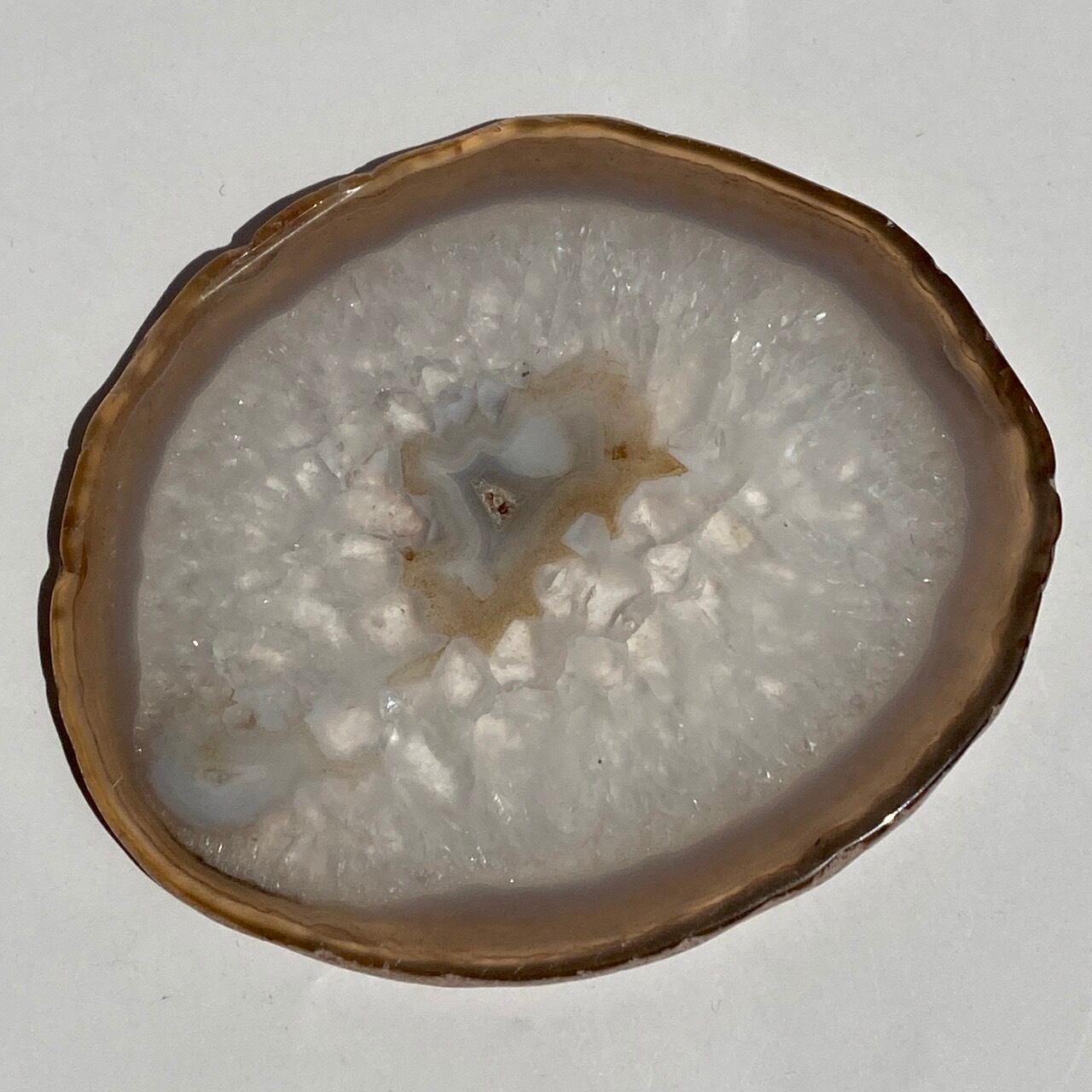 クォーツの結晶が大部分を占め、光に透かすと結晶の模様が美しく、それを半透明なで控えめなベージュの縁(淡いブルーグレーも見られます)が取り囲んでいるシックな子です。クォーツのポイントやクラスター、ミニ石や天使、動物などのカービング、そしてペンデュラムなどを置いても可愛いですし、アイデアが膨らみます。エッジの部分は少しだけ研磨されていますが、ナチュラルな質感になっています。