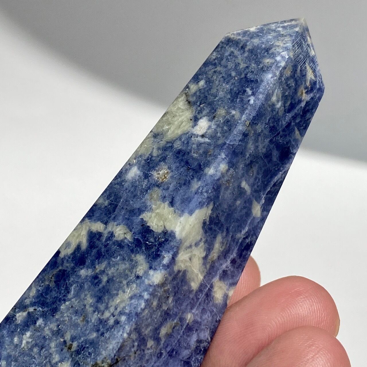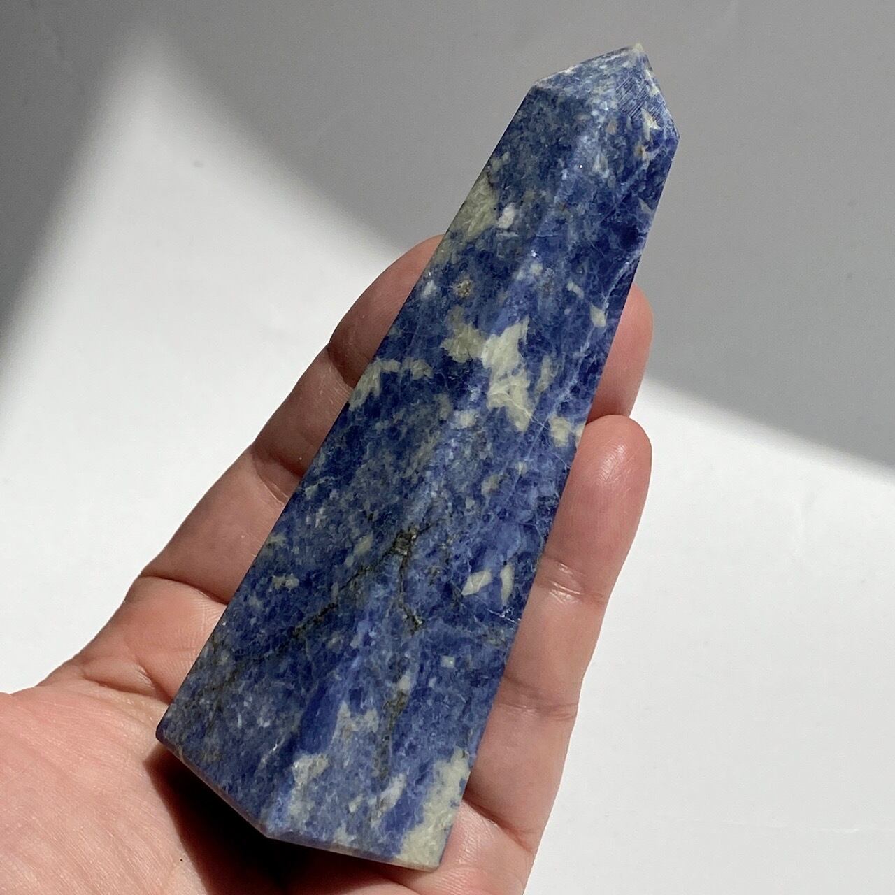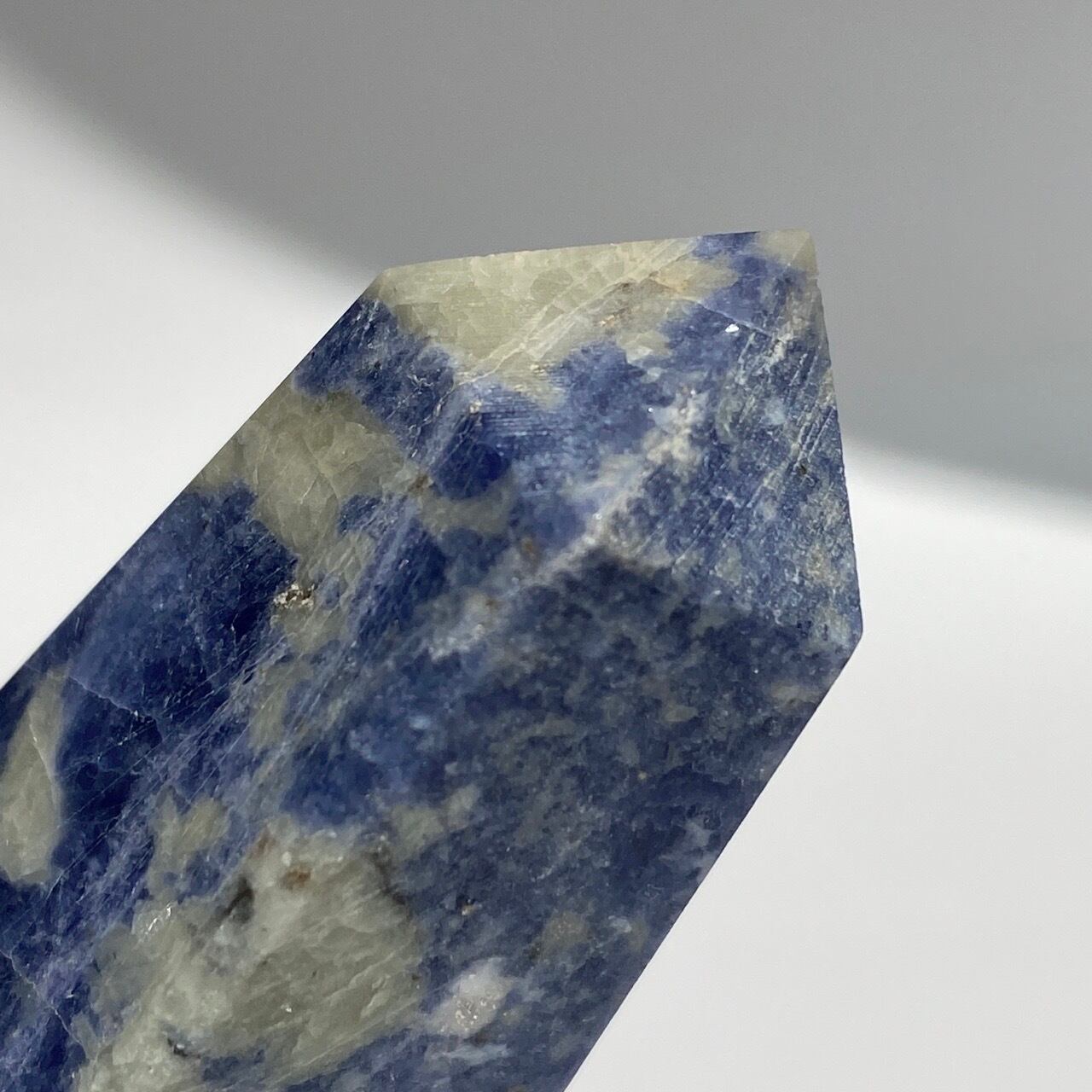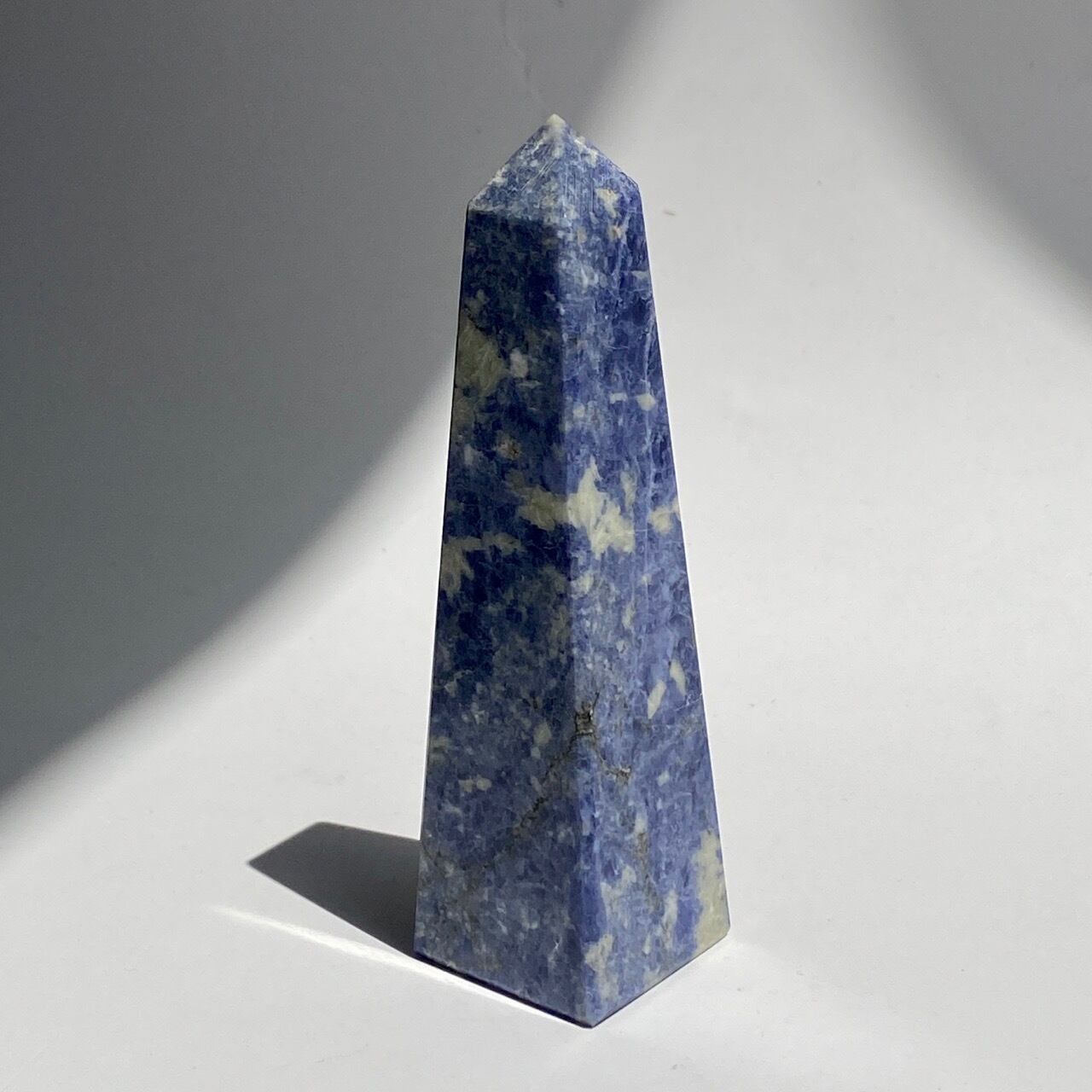 藍色の濃淡とグレーや白が霜降りのように混ざった陶器のような見た目のソーダライトのタワーになります。濃い色味のソーダライトも素敵ですが、このタイプも可愛いです。