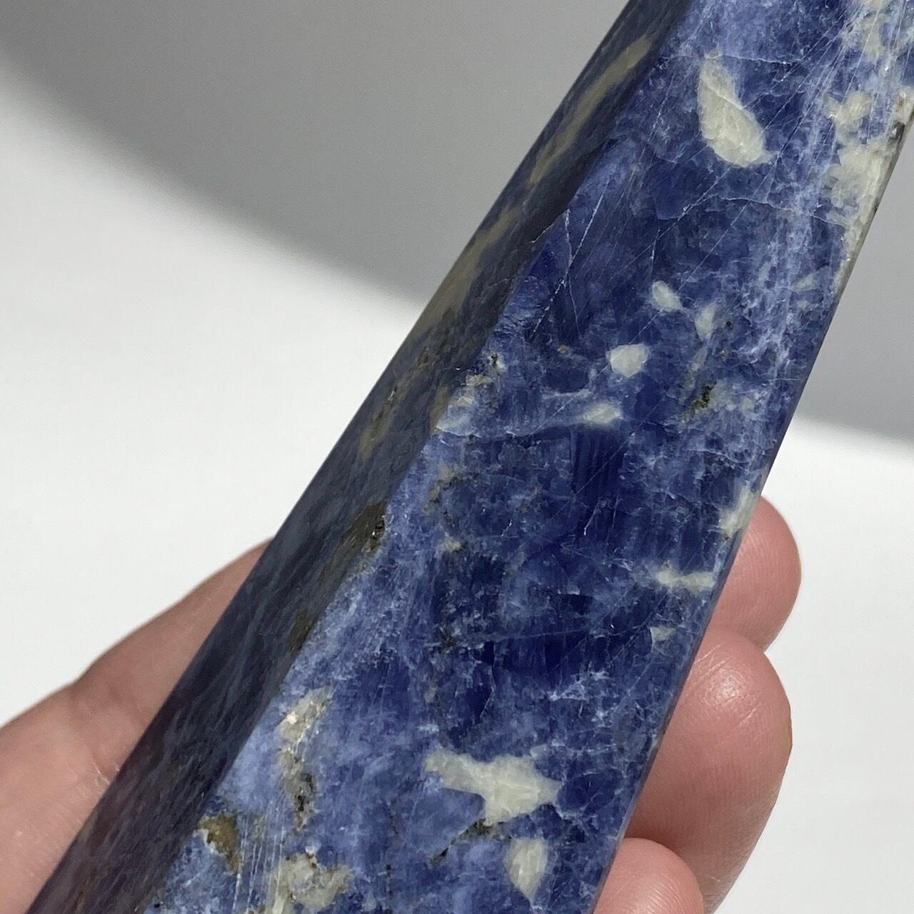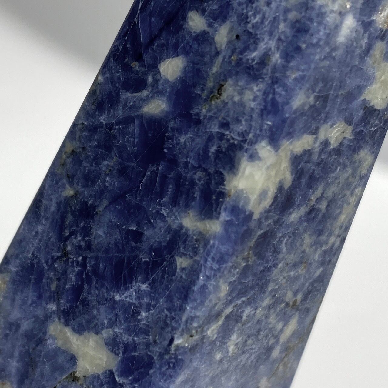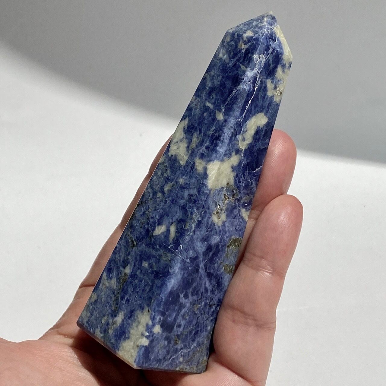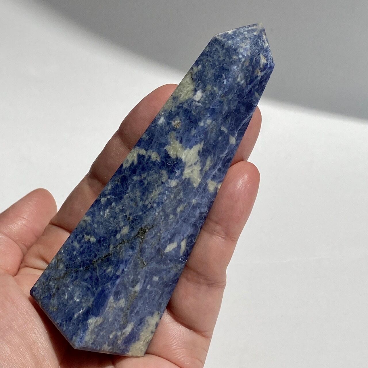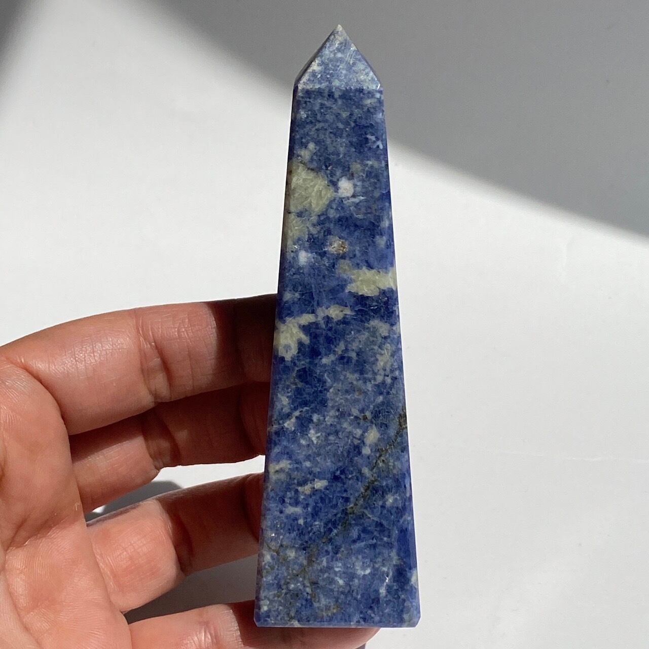 藍色の濃淡とグレーや白が霜降りのように混ざった陶器のような見た目のソーダライトのタワーになります。濃い色味のソーダライトも素敵ですが、このタイプも可愛いです。