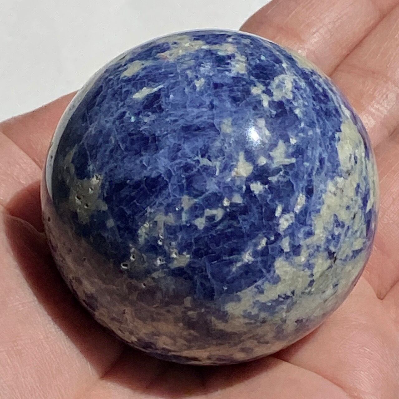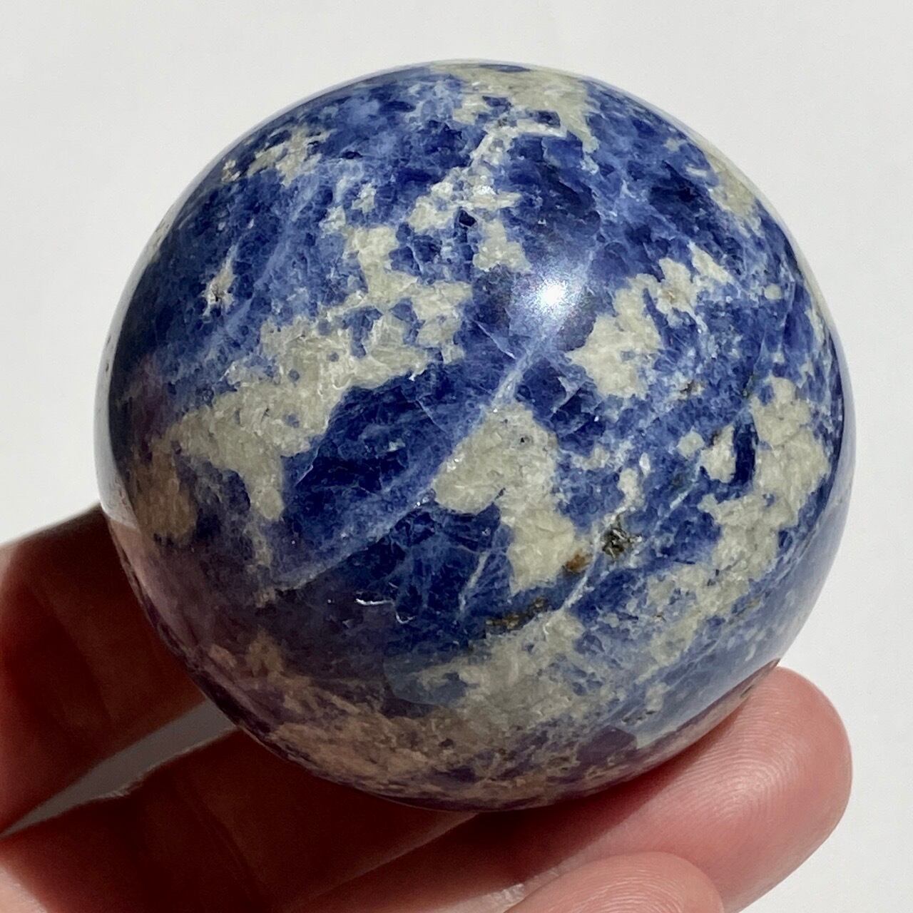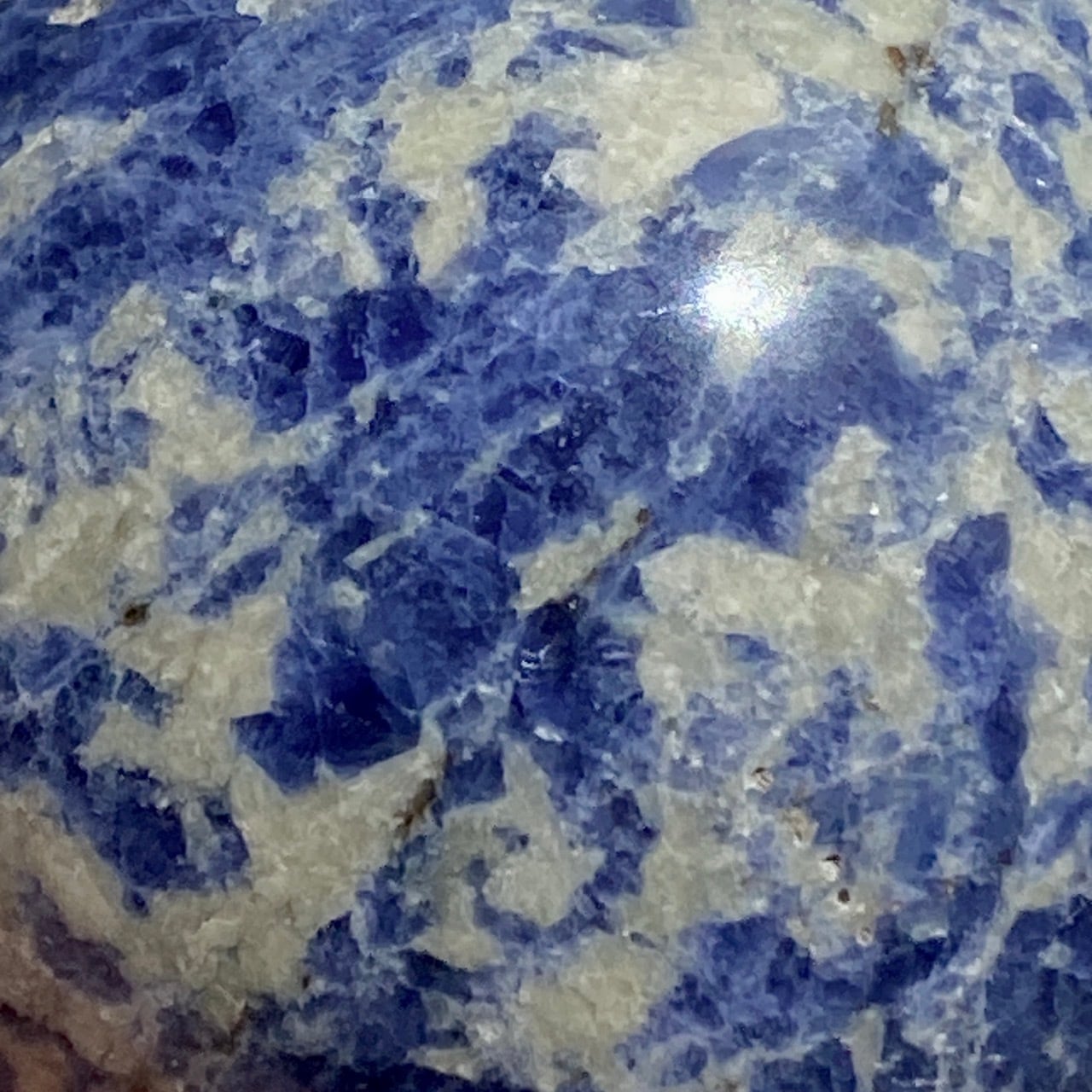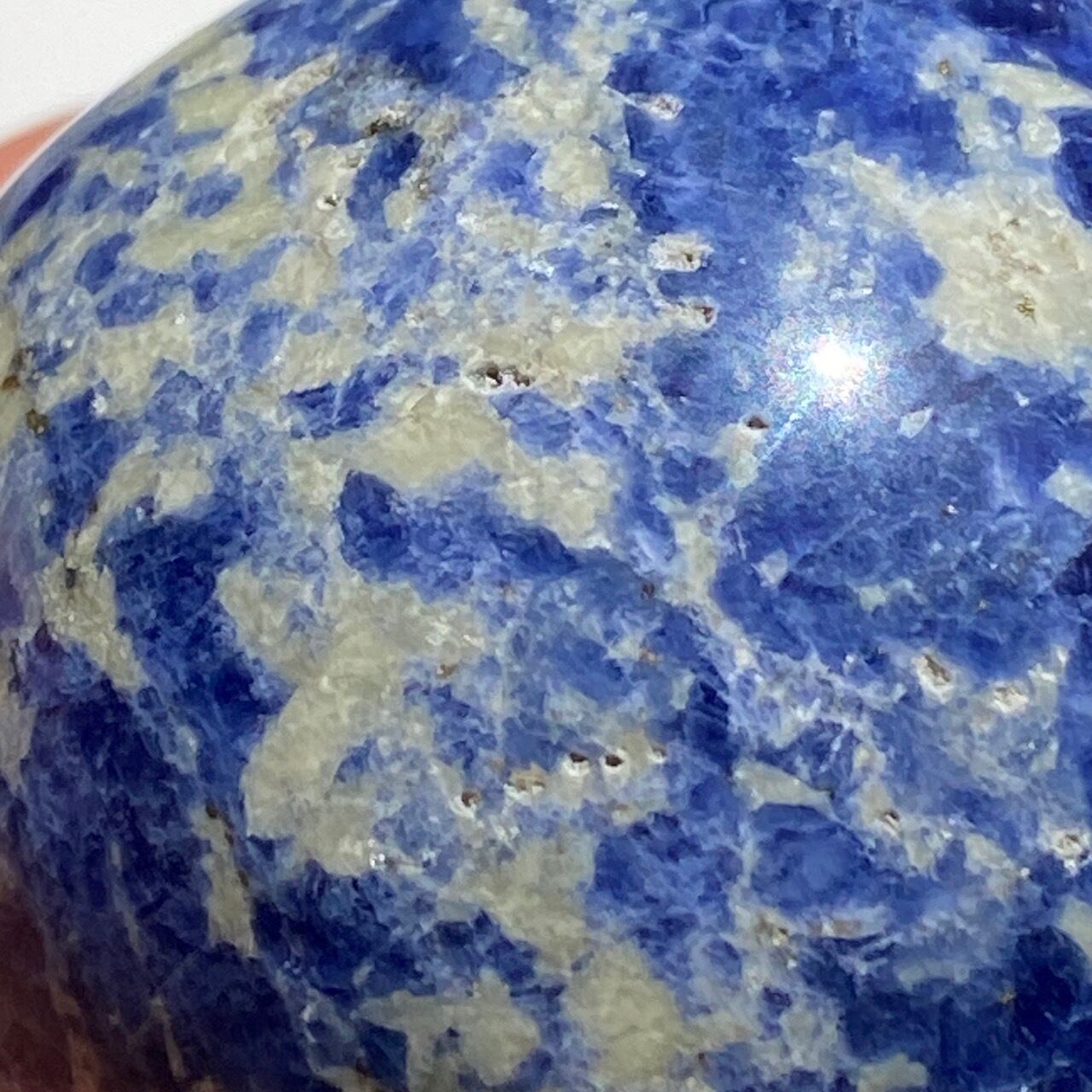 藍色の濃淡とグレーや白が霜降りのように混ざった陶器のような見た目のソーダライトのスフィアになります。濃い色味のソーダライトも素敵ですが、このタイプも可愛いです。