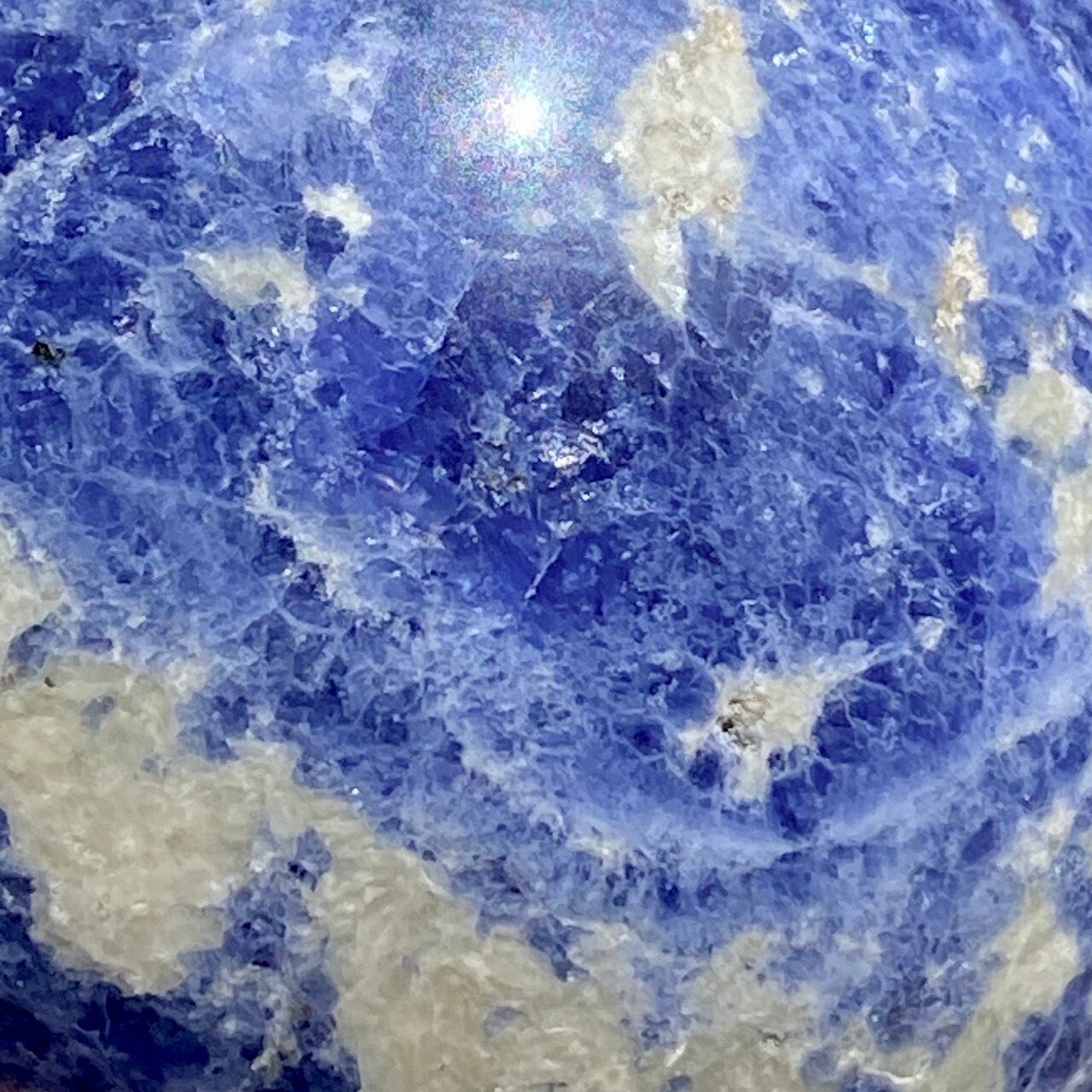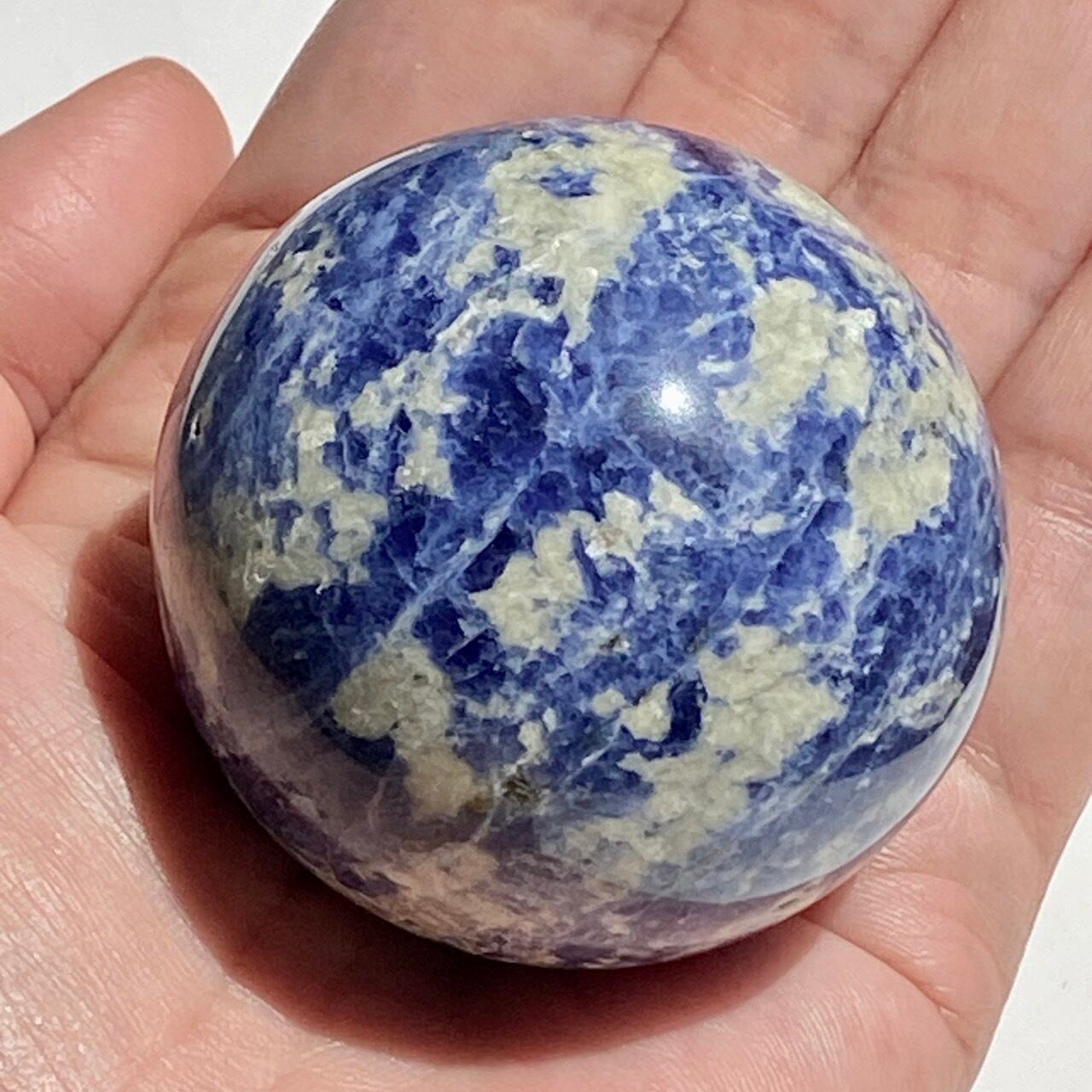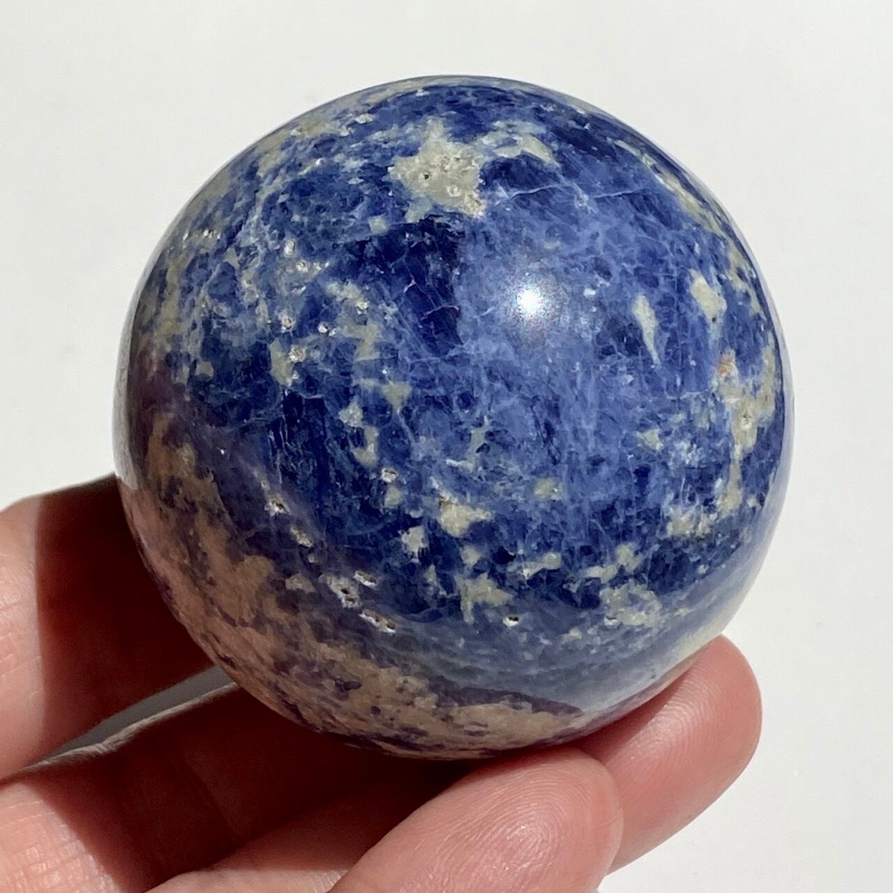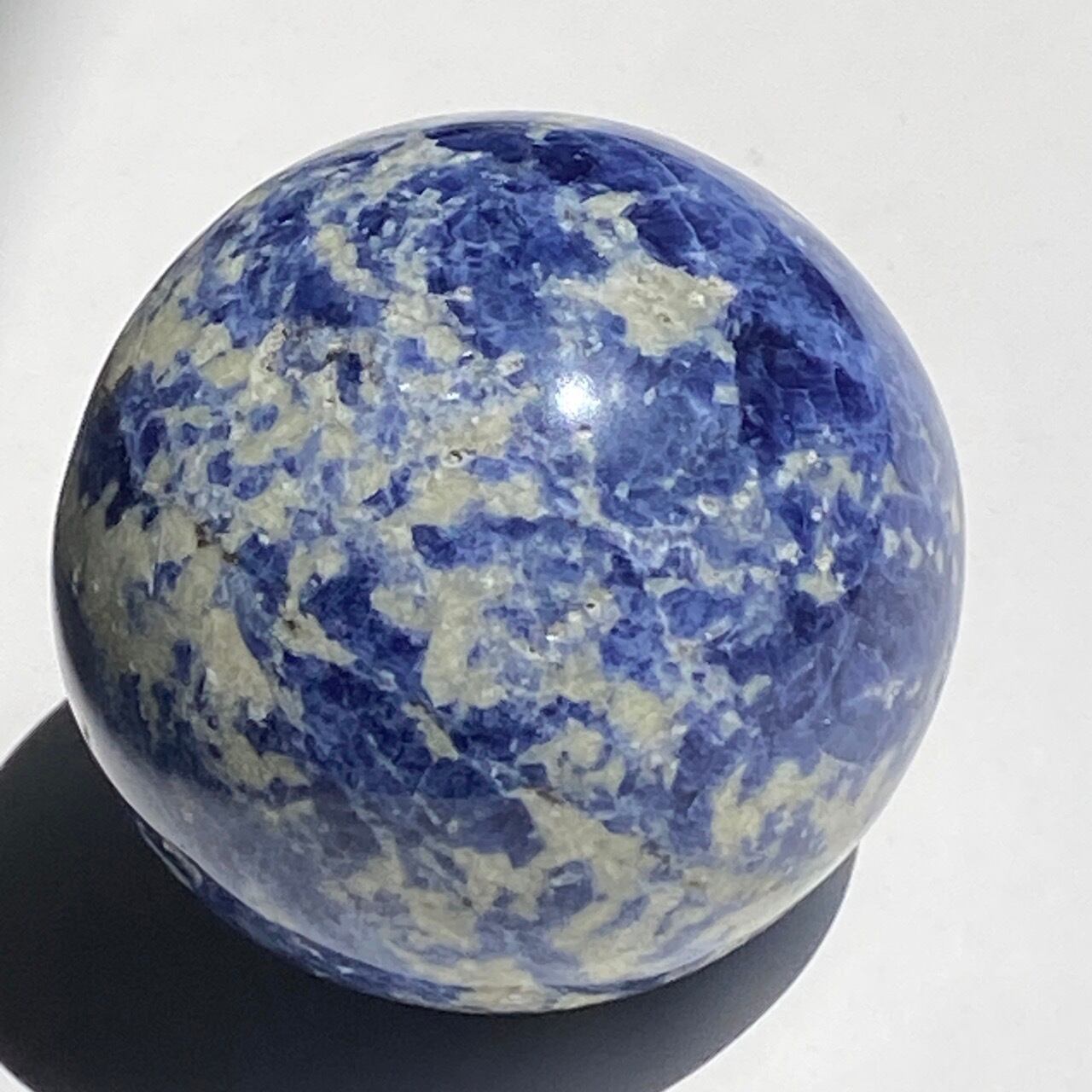 藍色の濃淡とグレーや白が霜降りのように混ざった陶器のような見た目のソーダライトのスフィアになります。濃い色味のソーダライトも素敵ですが、このタイプも可愛いです。