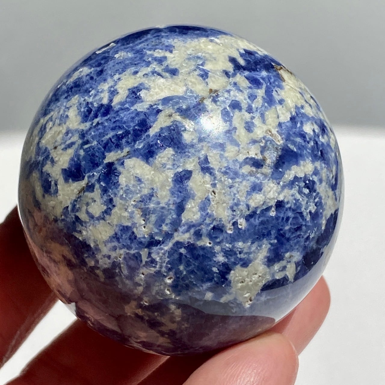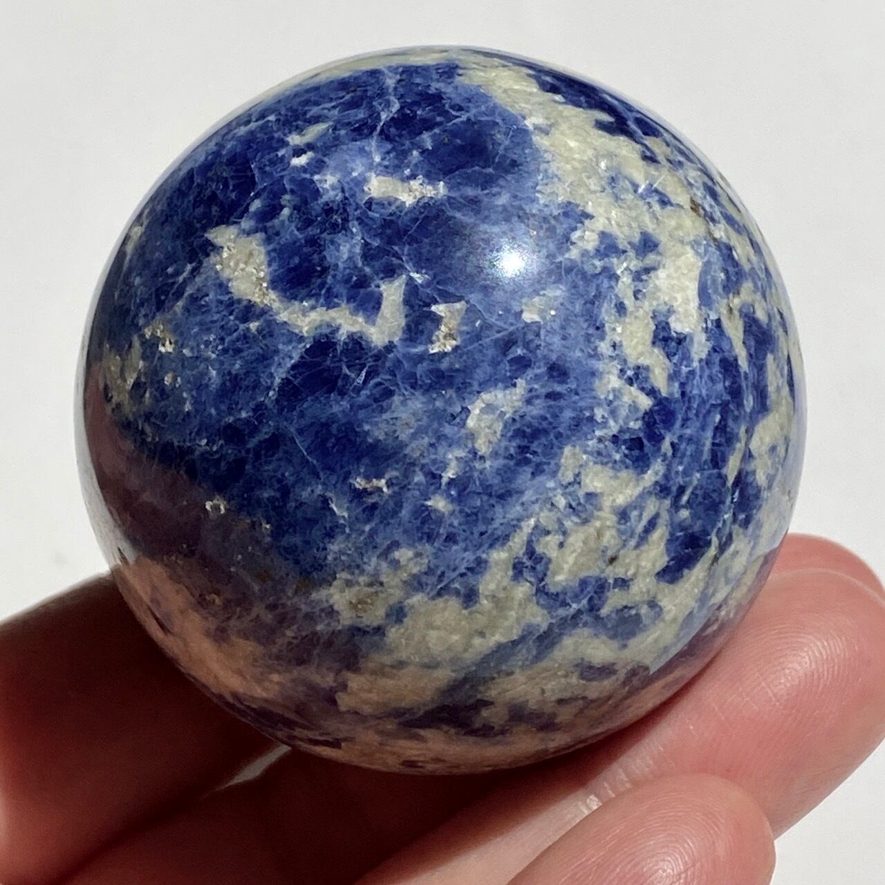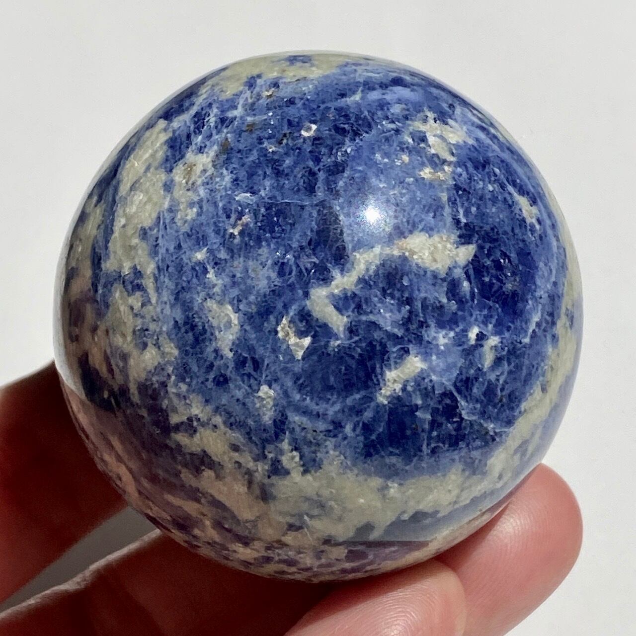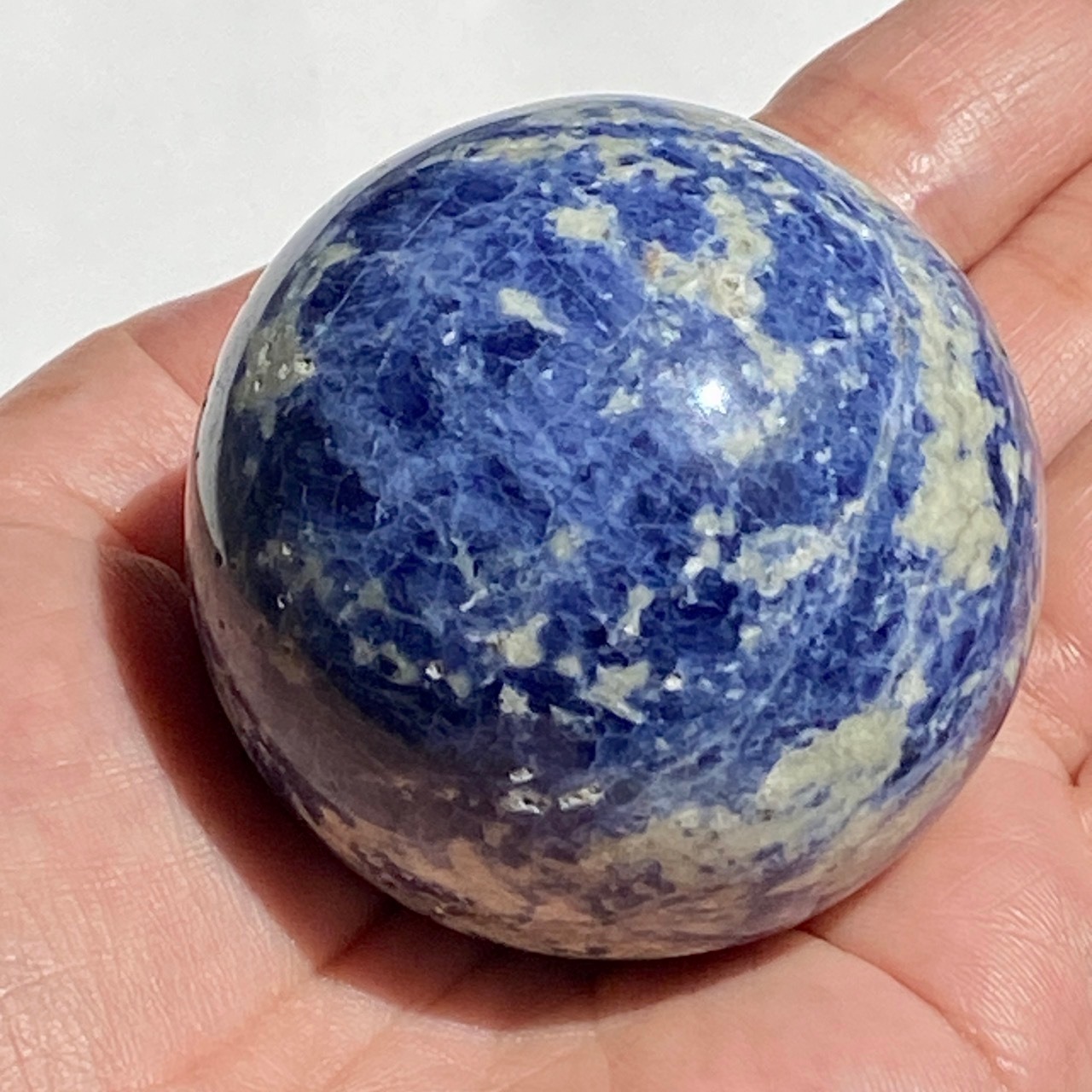 藍色の濃淡とグレーや白が霜降りのように混ざった陶器のような見た目のソーダライトのスフィアになります。濃い色味のソーダライトも素敵ですが、このタイプも可愛いです。
