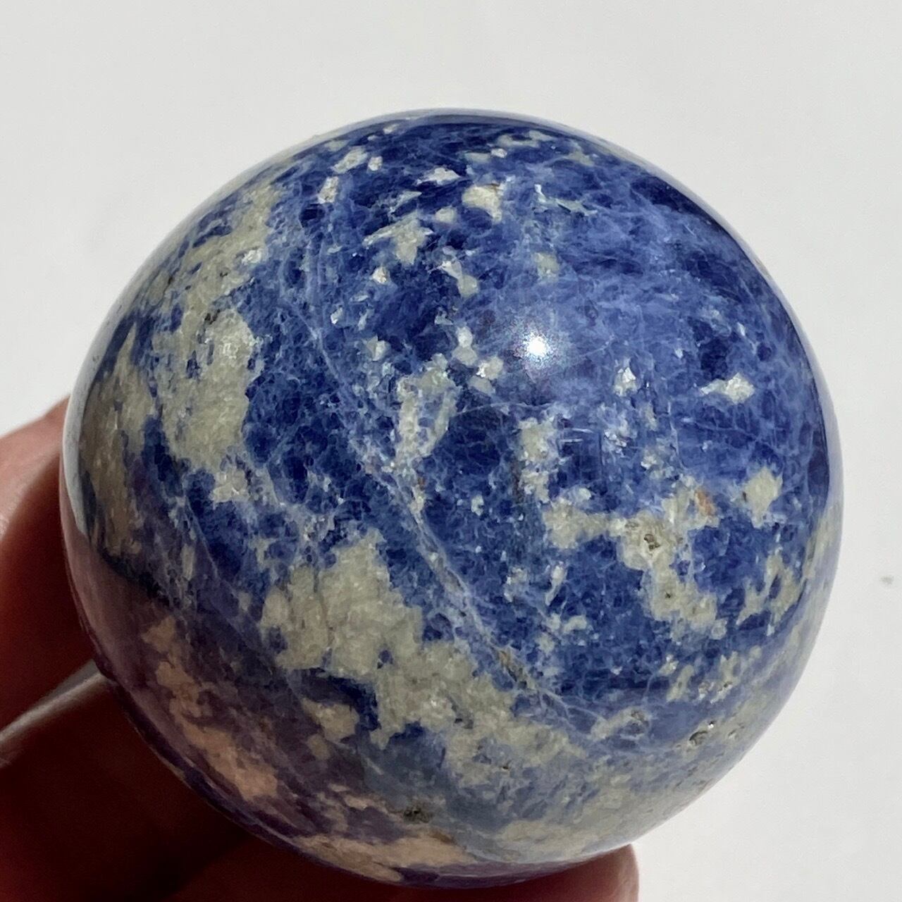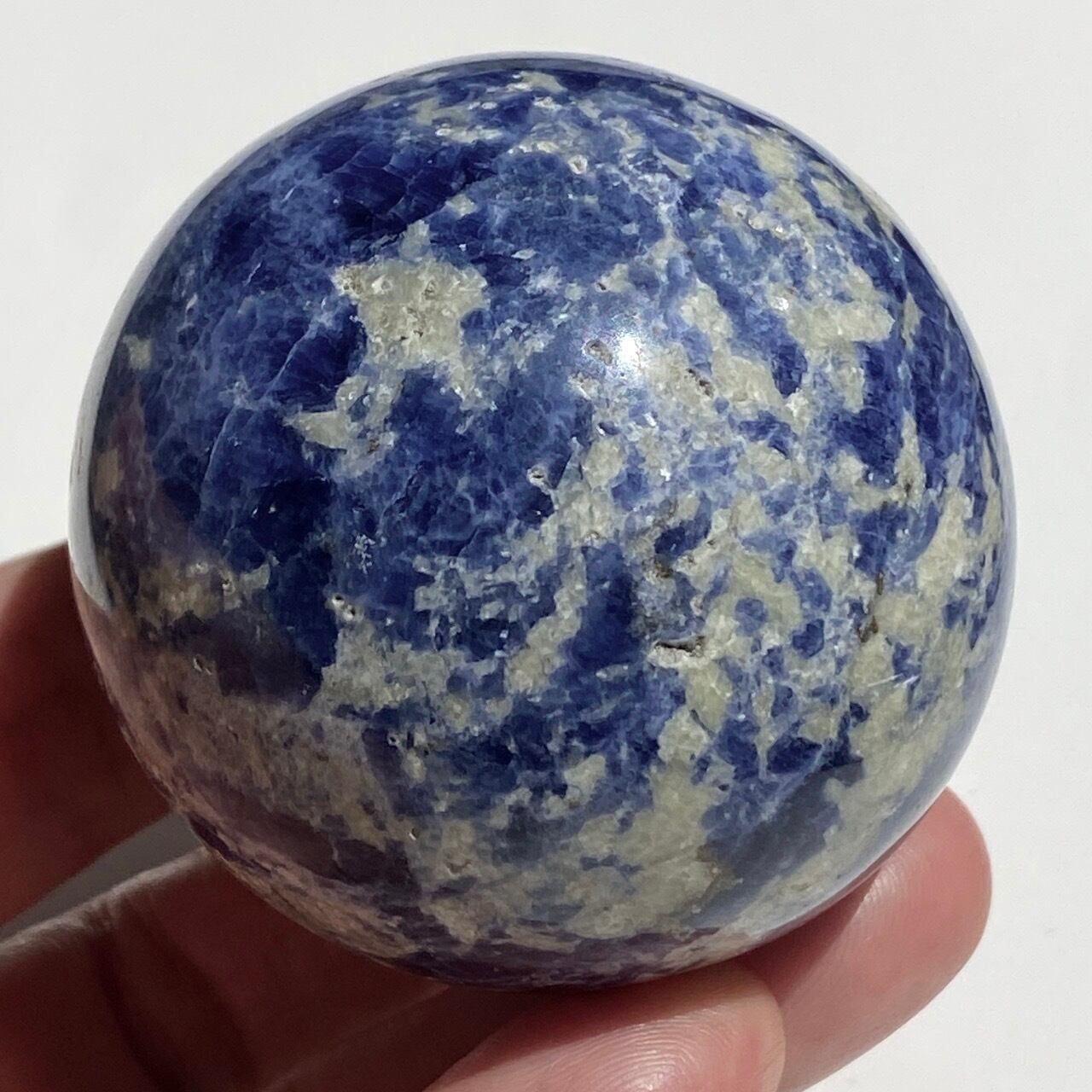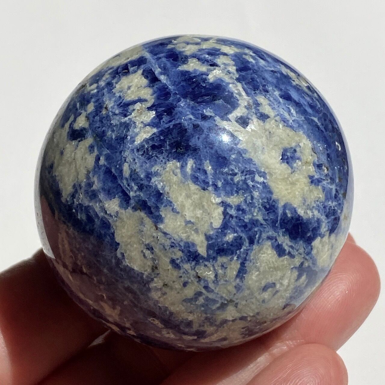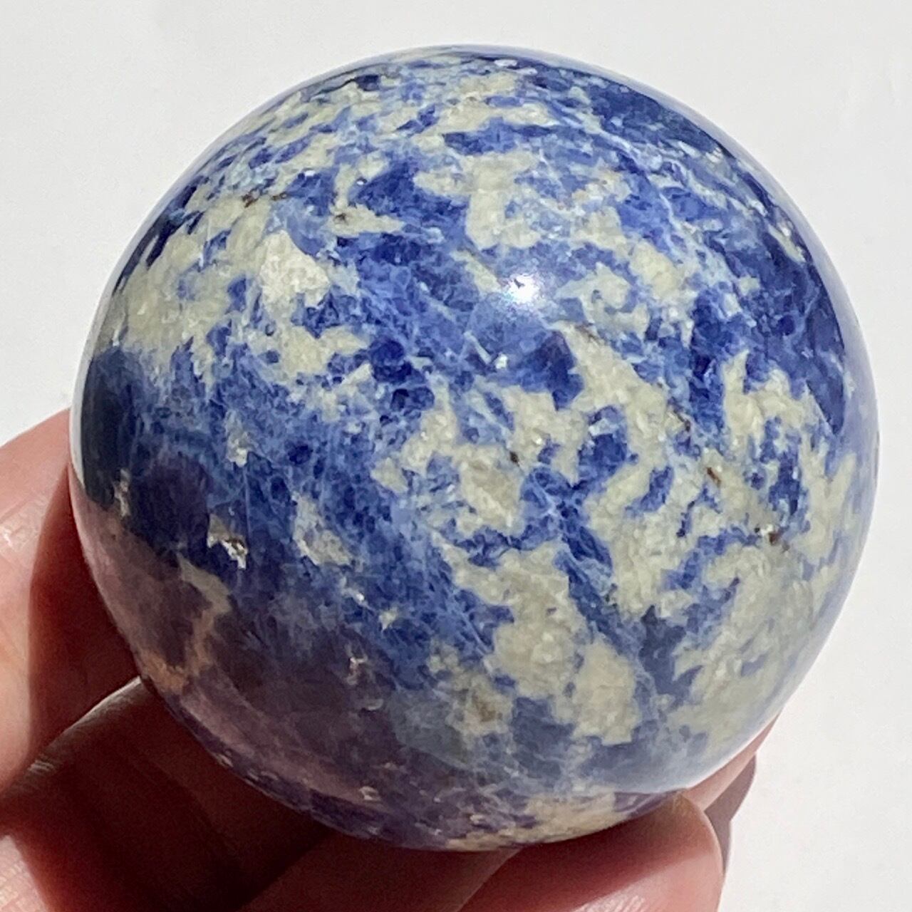 藍色の濃淡とグレーや白が霜降りのように混ざった陶器のような見た目のソーダライトのスフィアになります。濃い色味のソーダライトも素敵ですが、このタイプも可愛いです。