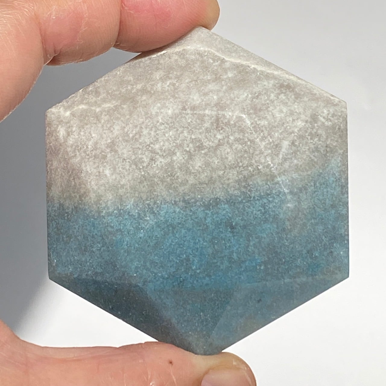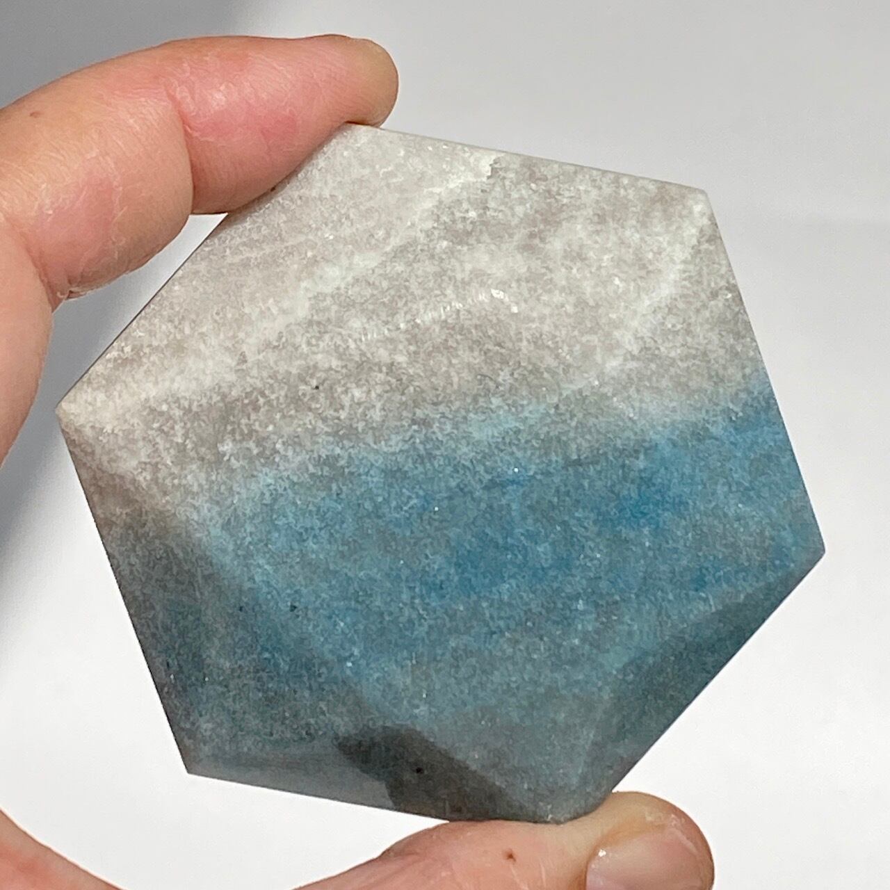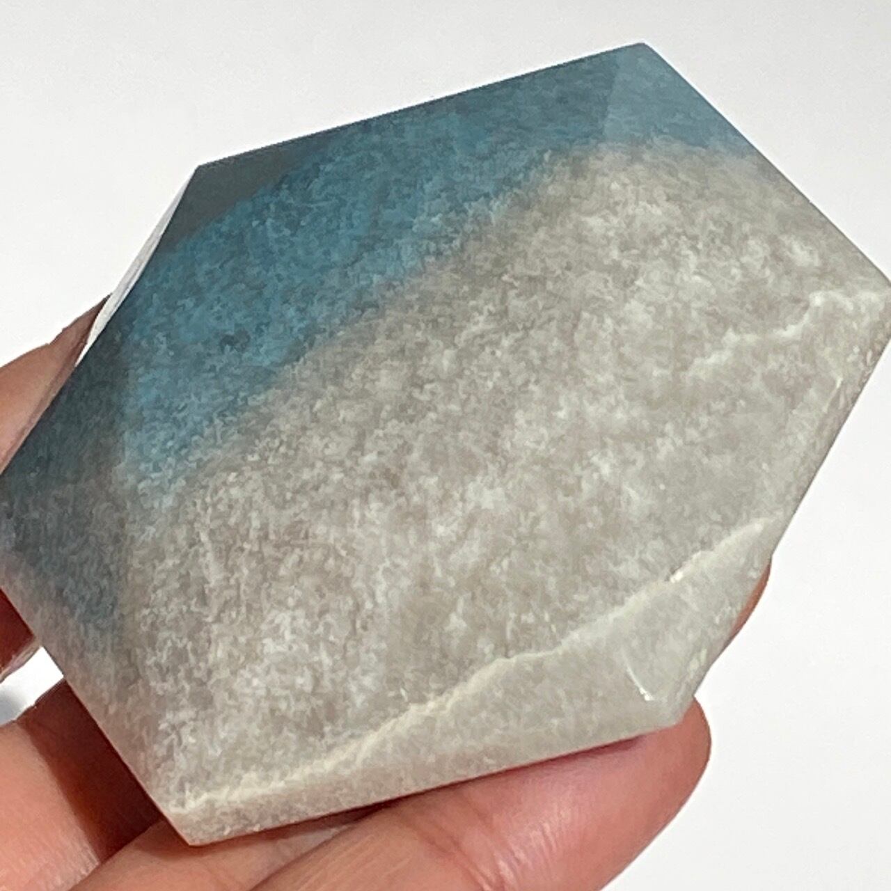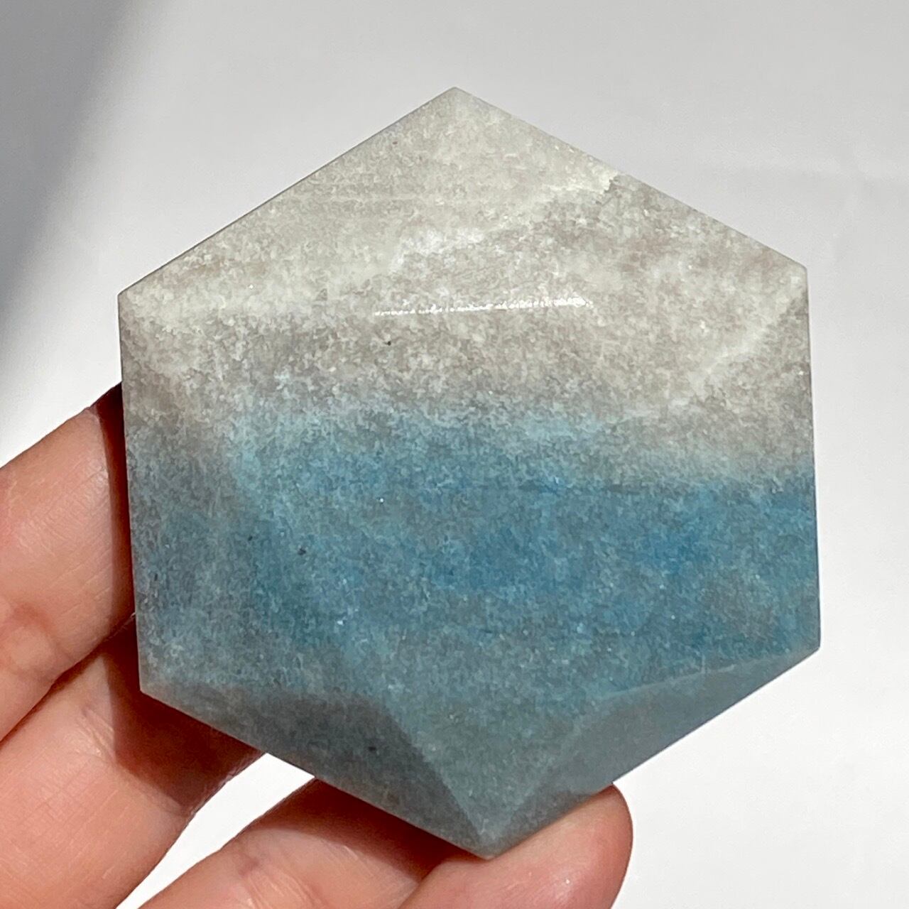 二つの正三角形を逆に重ねた六芒星(ヘキサグラム)が面取りにて両面に施されたヘキサゴンです。ブルーとオフホワイト(グレーも混じっています)のバイカラーが海と空を思わせるような子です。トロレアイトの魅力である粒々感が存分に味わえ、オフホワイトのもくもくしたタッチが雲のようです。真ん中の平らな部分に小物を置くことが可能です。ちなみに、例えば他の石やクリスタル、動物のカービングや天使などを飾るのもキュートです。今回はマカバを置いて撮影してみました。