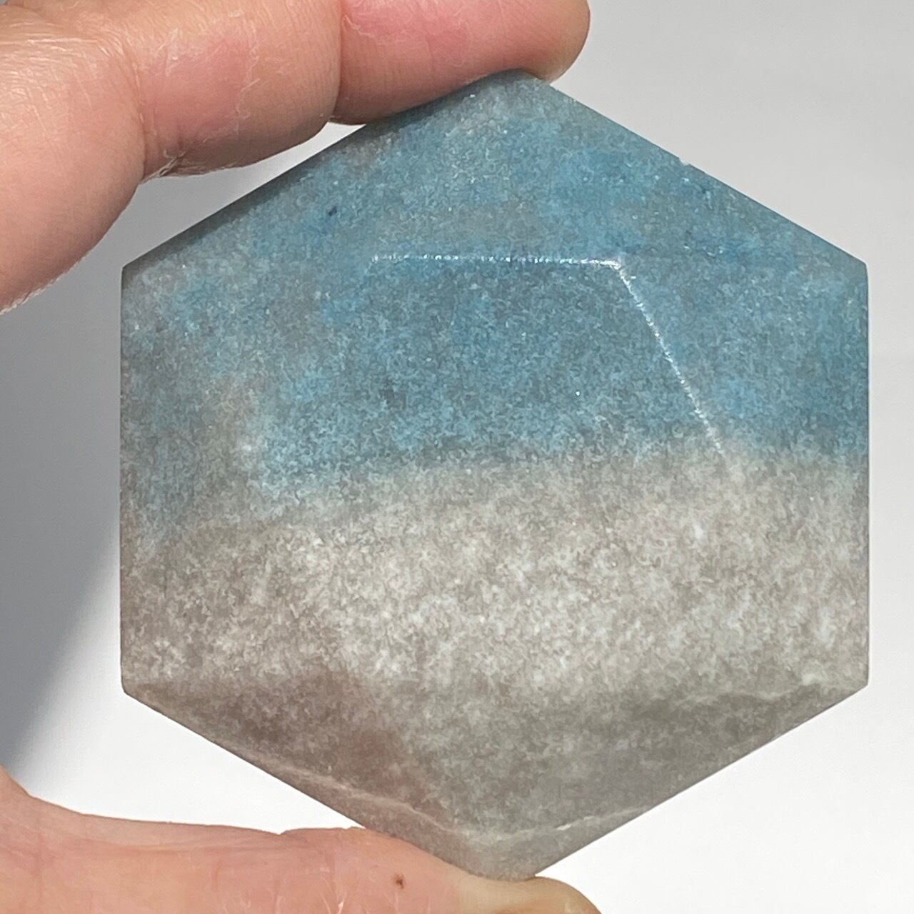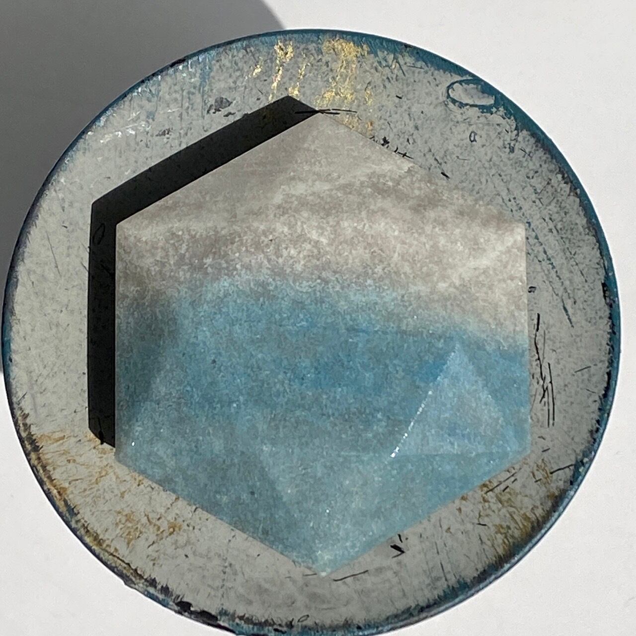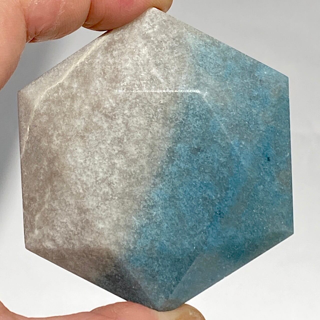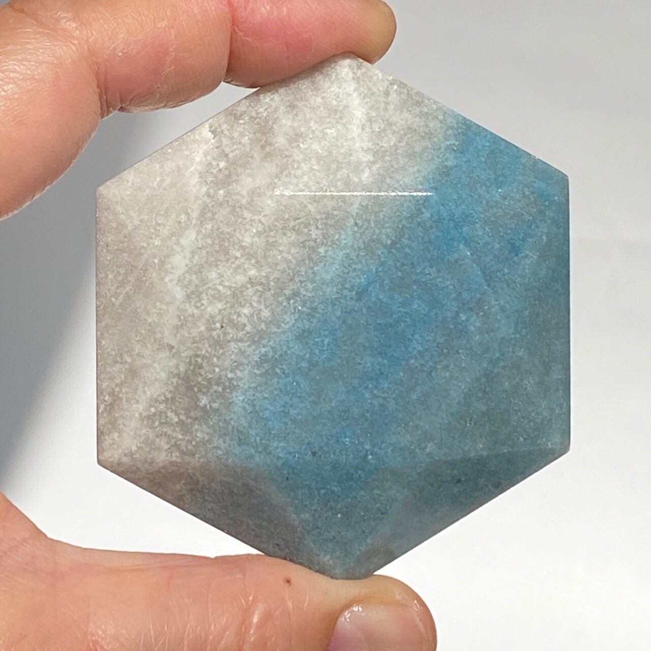 二つの正三角形を逆に重ねた六芒星(ヘキサグラム)が面取りにて両面に施されたヘキサゴンです。ブルーとオフホワイト(グレーも混じっています)のバイカラーが海と空を思わせるような子です。トロレアイトの魅力である粒々感が存分に味わえ、オフホワイトのもくもくしたタッチが雲のようです。真ん中の平らな部分に小物を置くことが可能です。ちなみに、例えば他の石やクリスタル、動物のカービングや天使などを飾るのもキュートです。今回はマカバを置いて撮影してみました。