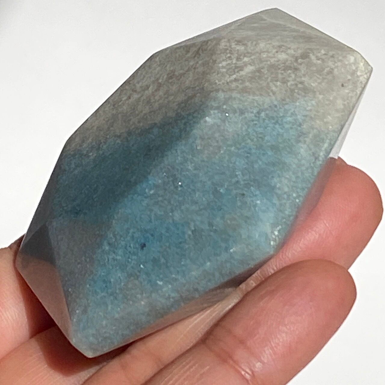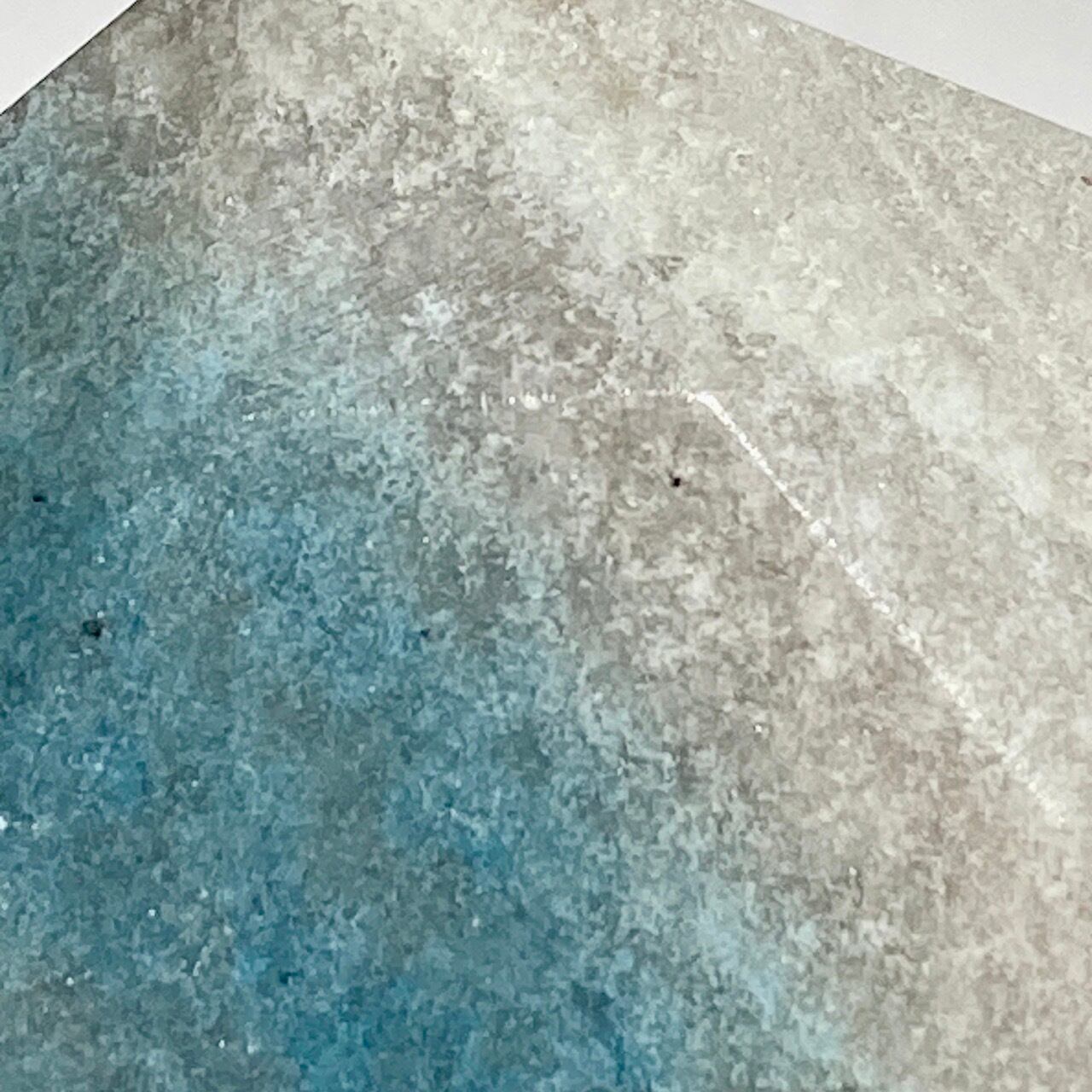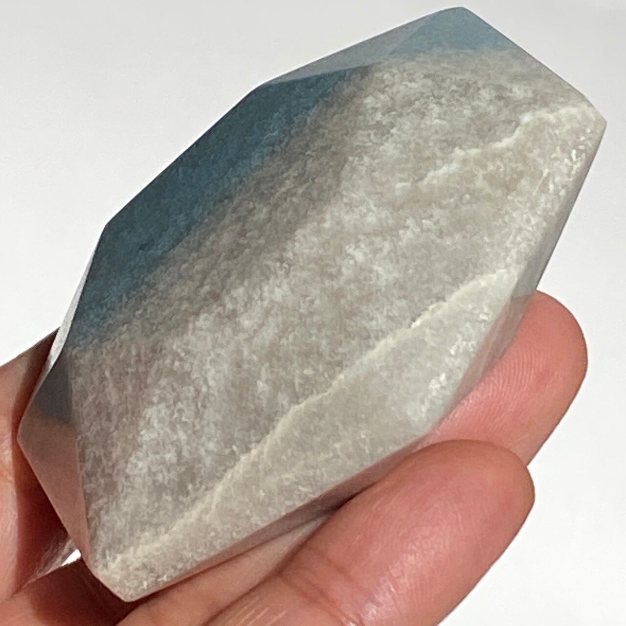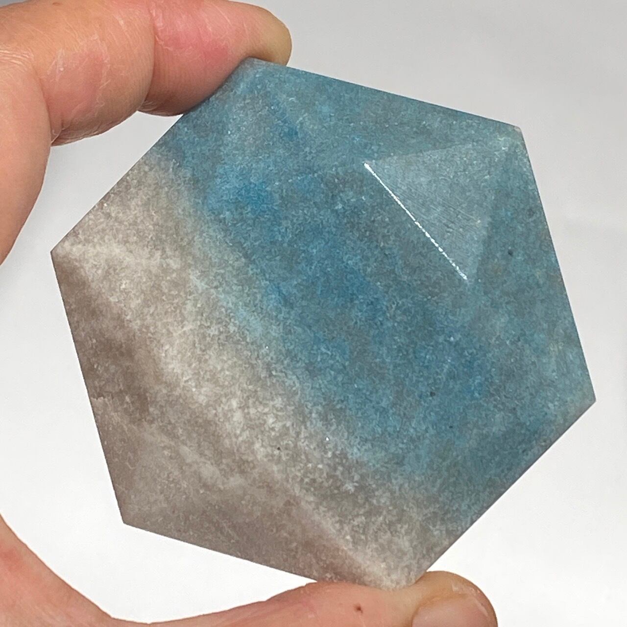二つの正三角形を逆に重ねた六芒星(ヘキサグラム)が面取りにて両面に施されたヘキサゴンです。ブルーとオフホワイト(グレーも混じっています)のバイカラーが海と空を思わせるような子です。トロレアイトの魅力である粒々感が存分に味わえ、オフホワイトのもくもくしたタッチが雲のようです。真ん中の平らな部分に小物を置くことが可能です。ちなみに、例えば他の石やクリスタル、動物のカービングや天使などを飾るのもキュートです。今回はマカバを置いて撮影してみました。