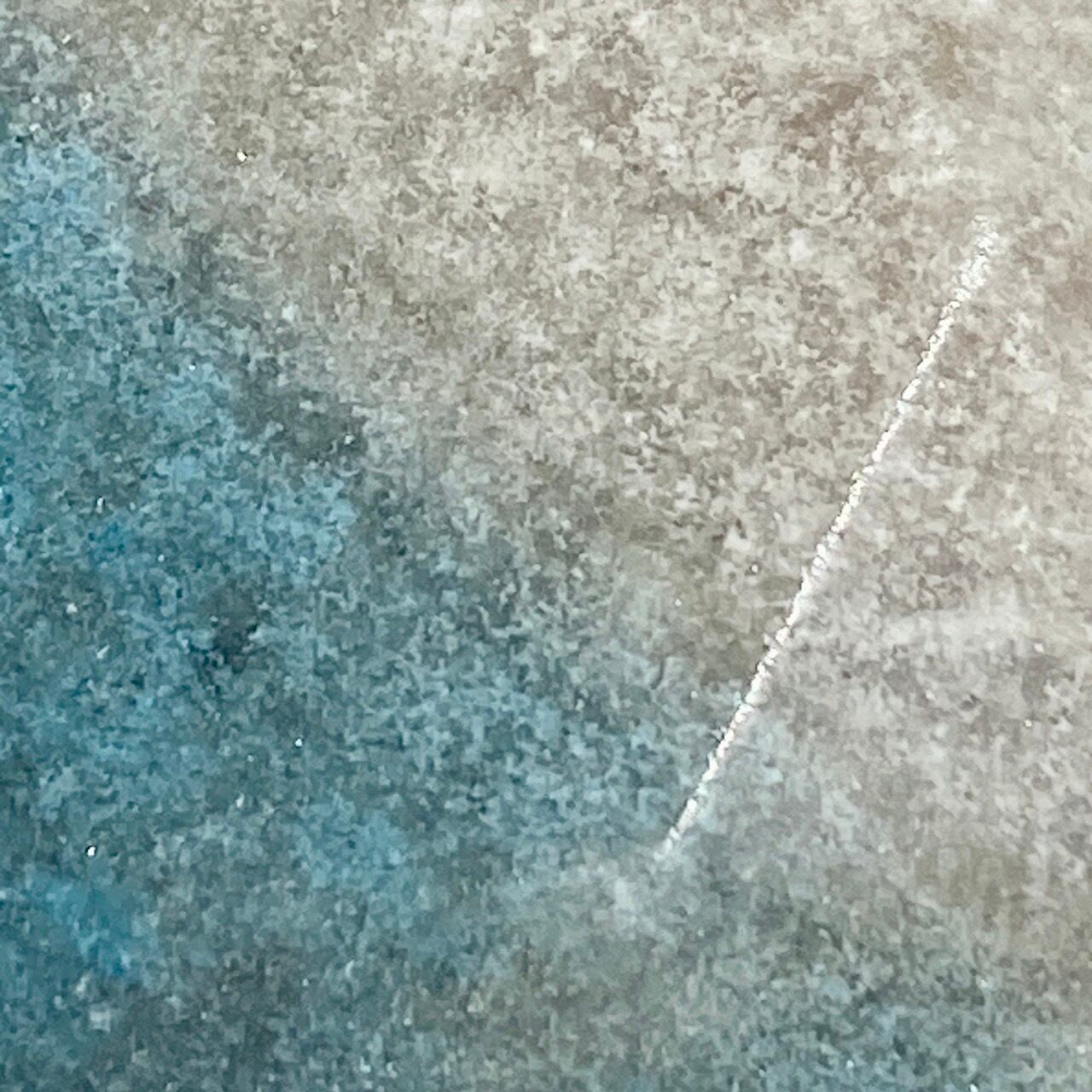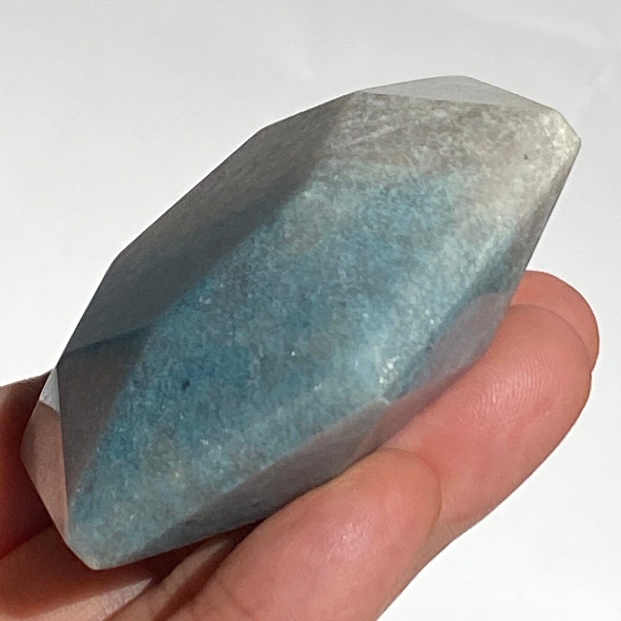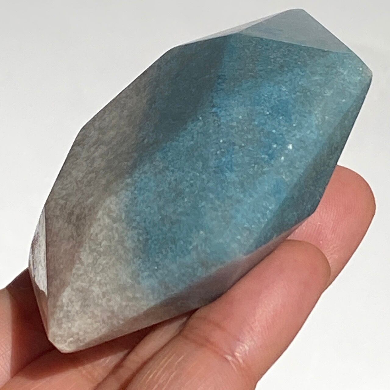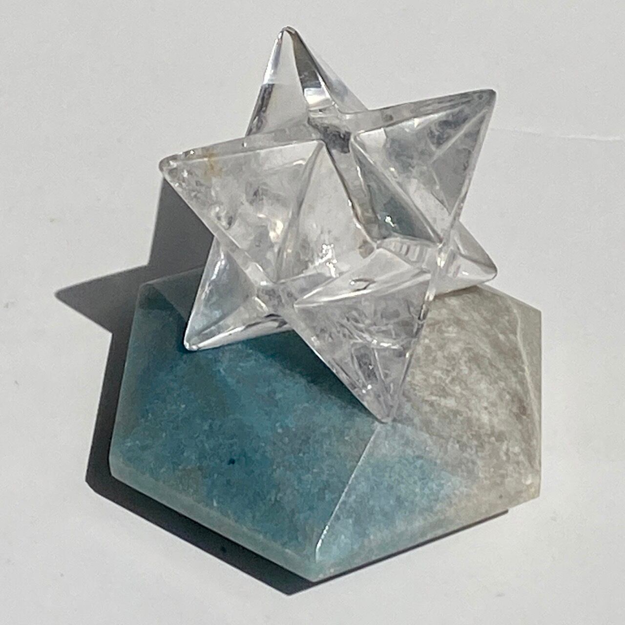 二つの正三角形を逆に重ねた六芒星(ヘキサグラム)が面取りにて両面に施されたヘキサゴンです。ブルーとオフホワイト(グレーも混じっています)のバイカラーが海と空を思わせるような子です。トロレアイトの魅力である粒々感が存分に味わえ、オフホワイトのもくもくしたタッチが雲のようです。真ん中の平らな部分に小物を置くことが可能です。ちなみに、例えば他の石やクリスタル、動物のカービングや天使などを飾るのもキュートです。今回はマカバを置いて撮影してみました。