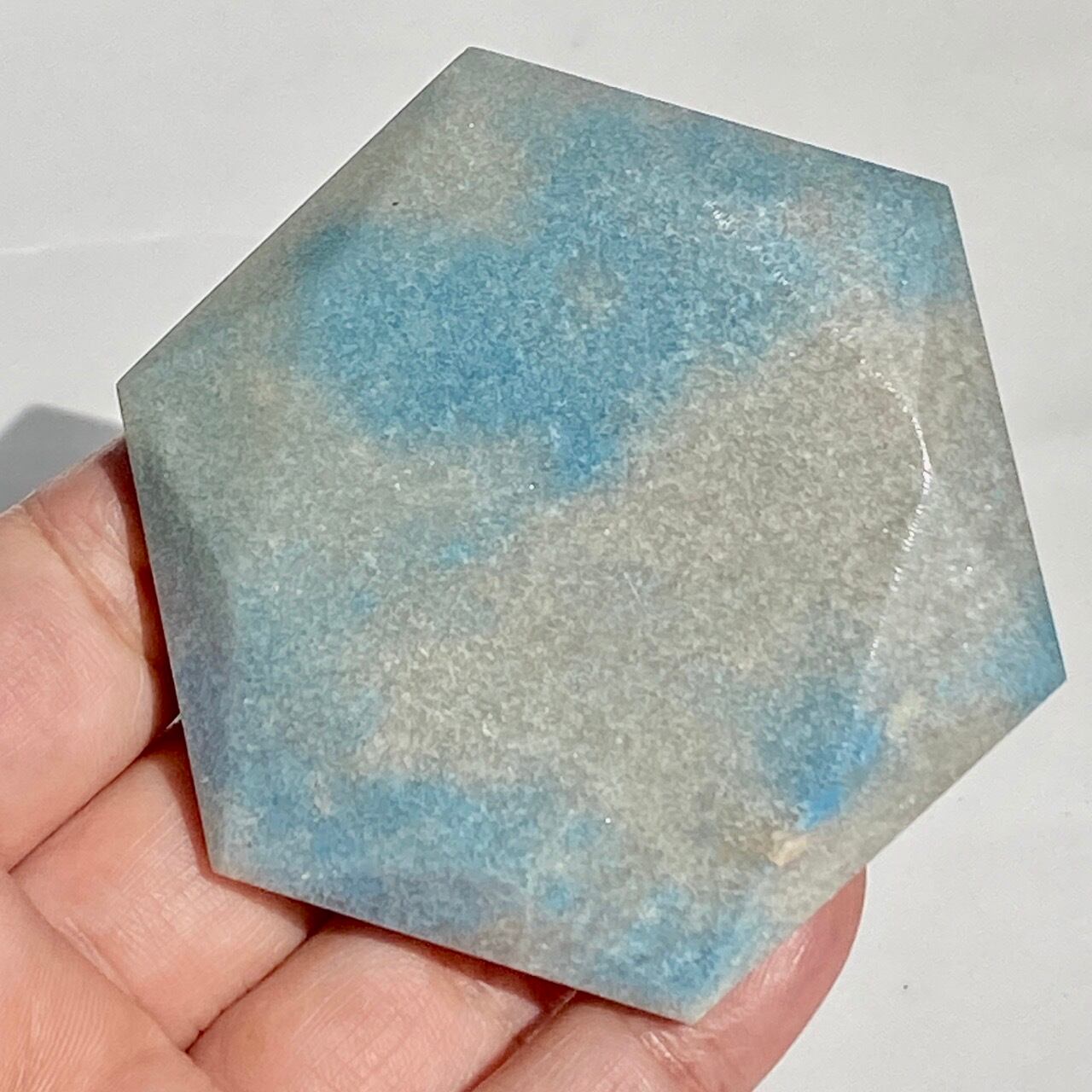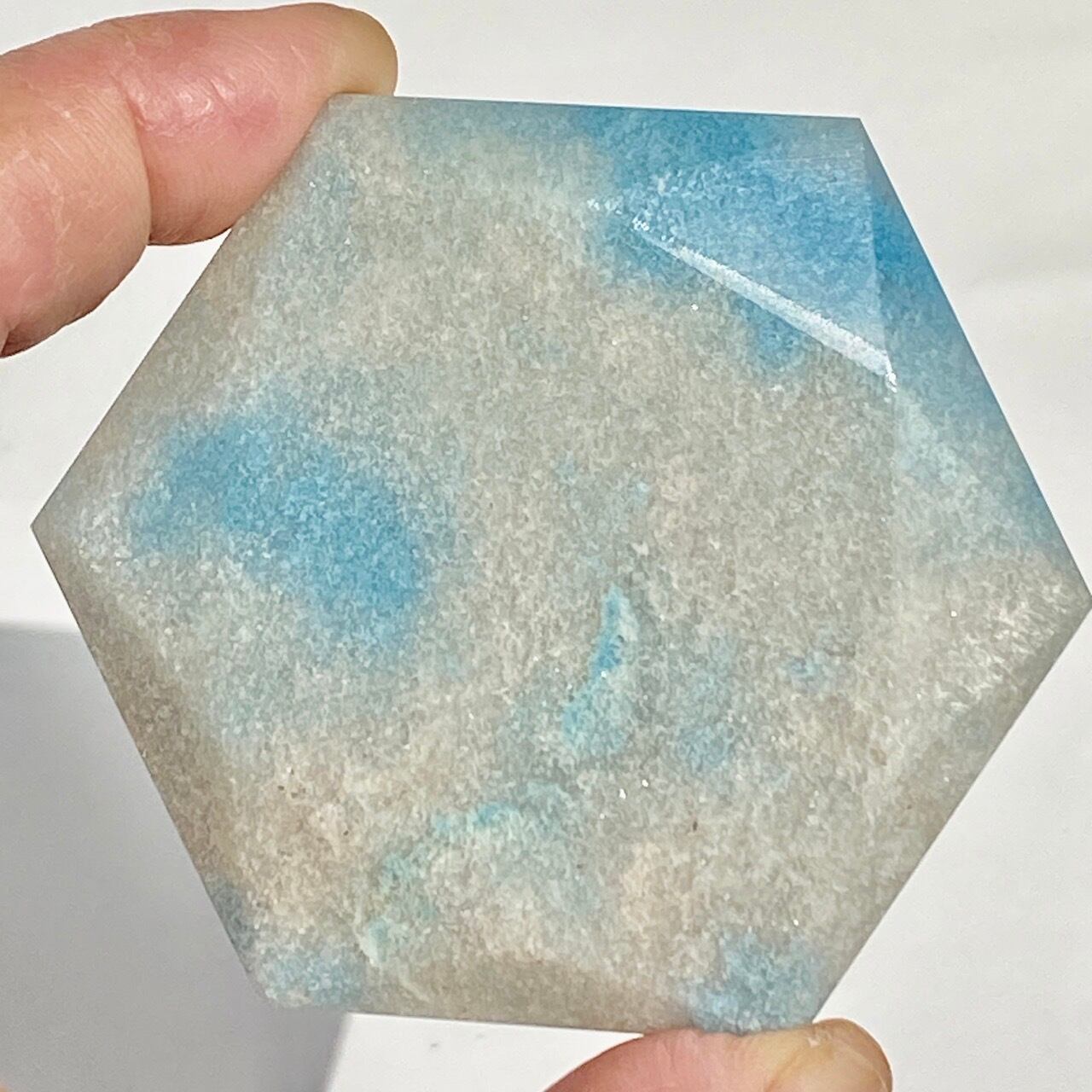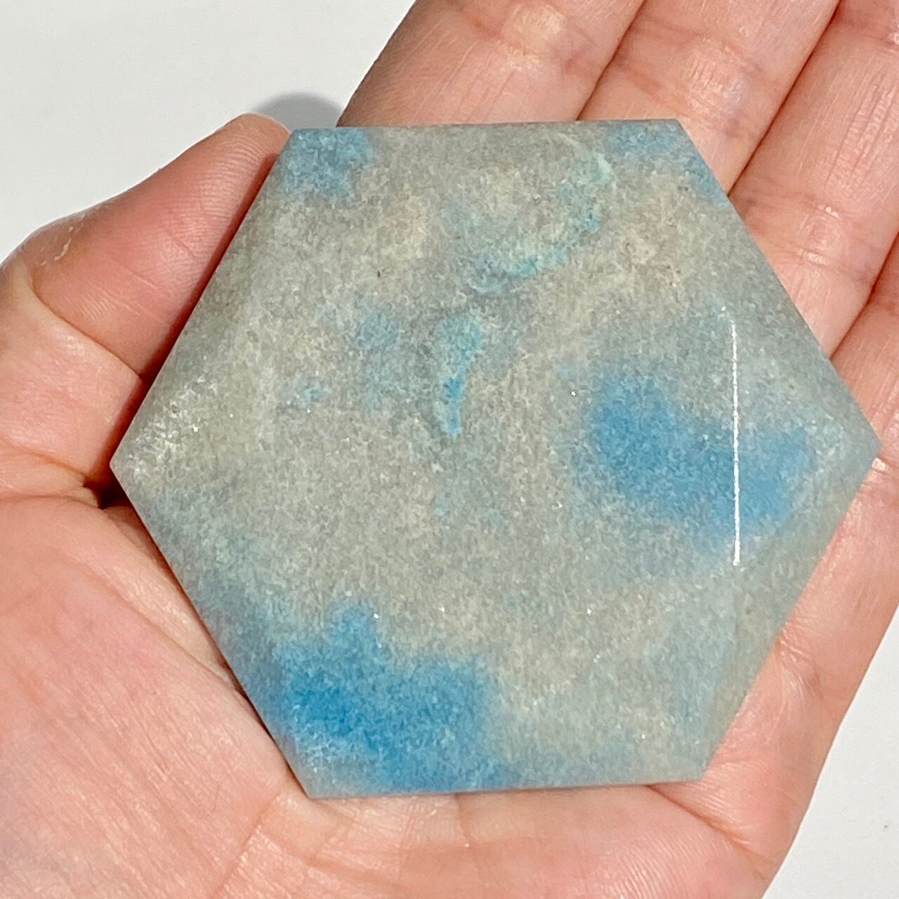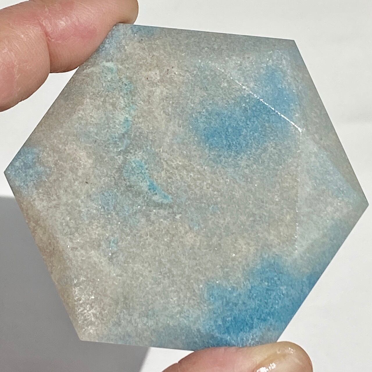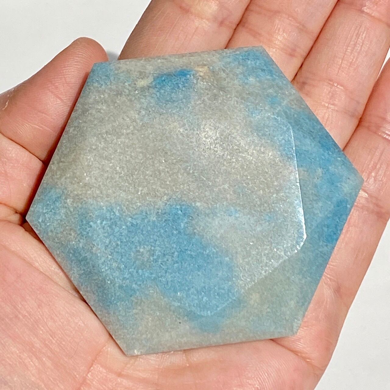 二つの正三角形を逆に重ねた六芒星(ヘキサグラム)が面取りにて両面に施されたヘキサゴンです。淡いグレーのベースに可愛いブルーのパッチが入っていて、空と雲を思わせるような子です。トロレアイトの魅力である粒々感が味わえ、天使のようなイメージも感じさせます。真ん中の平らな部分に小物を置くことが可能です。ちなみに、例えば他の石やクリスタル、動物のカービングや天使などを飾るのもキュートです。今回はマカバを置いて撮影してみました。
