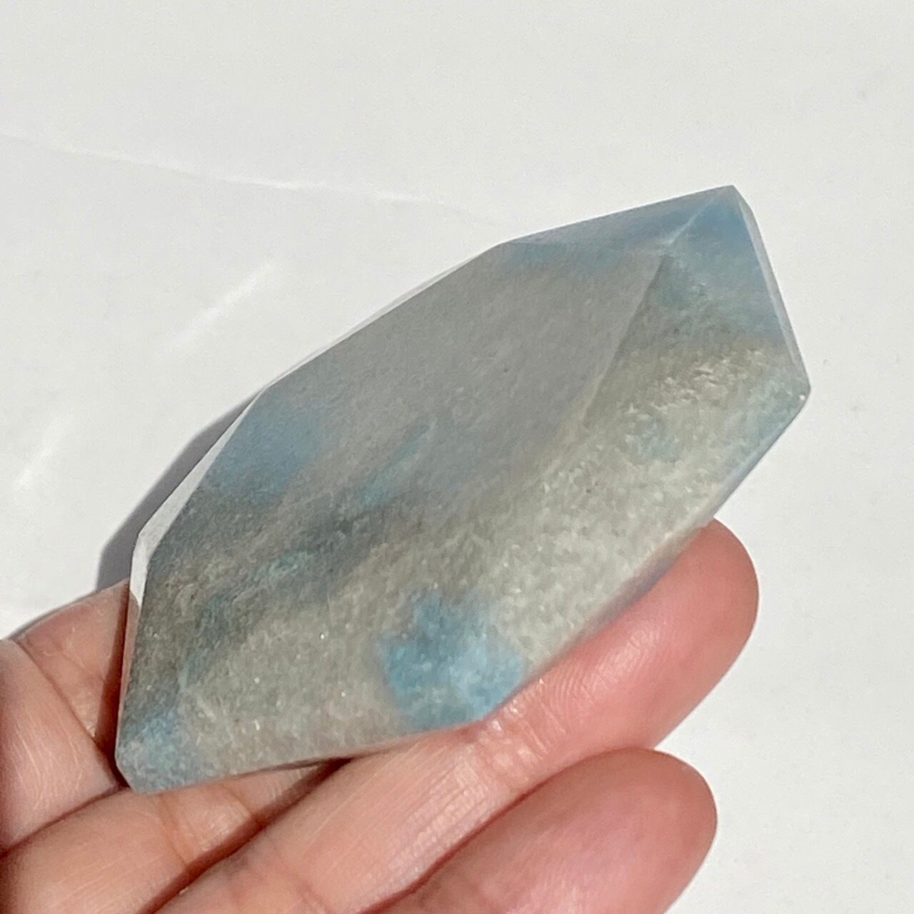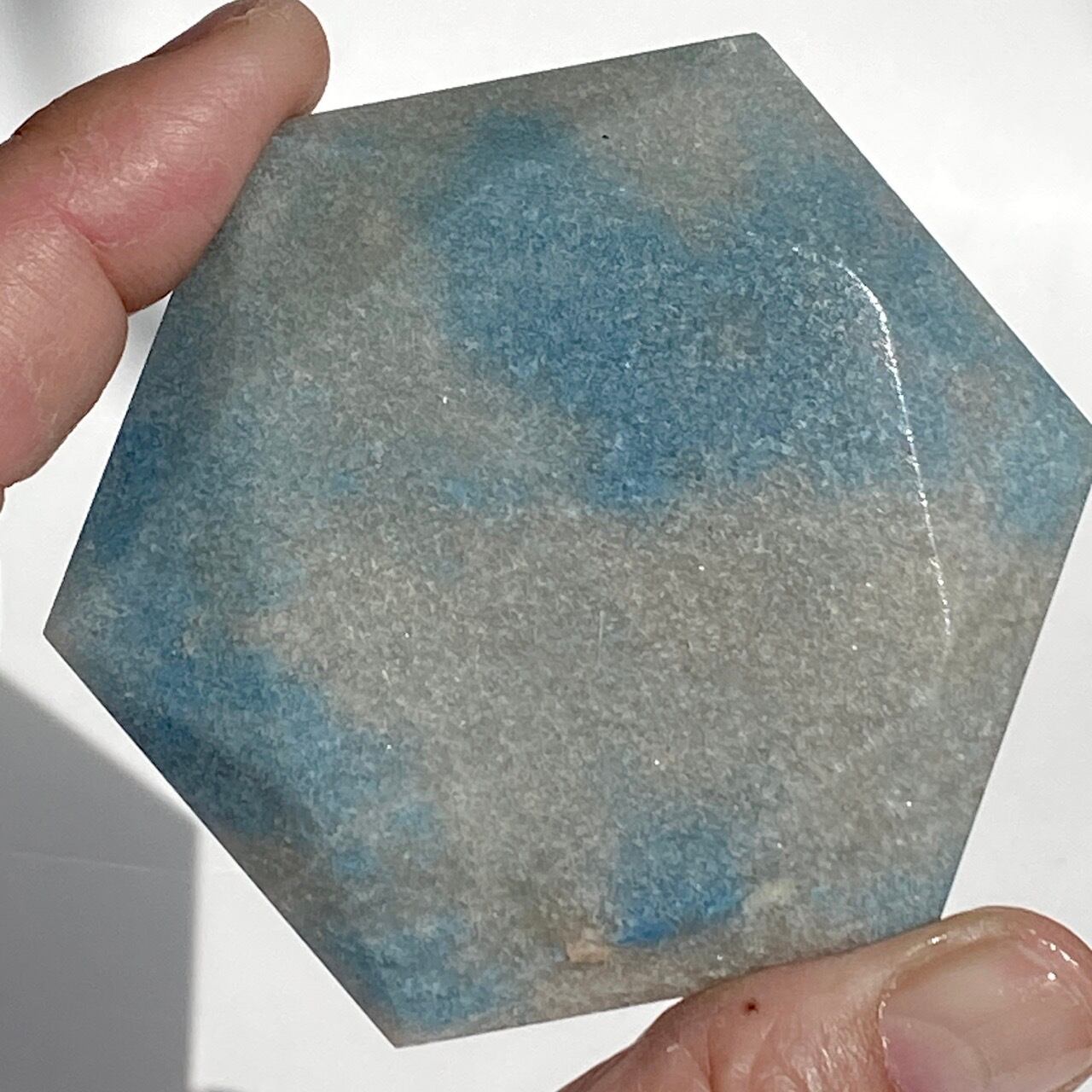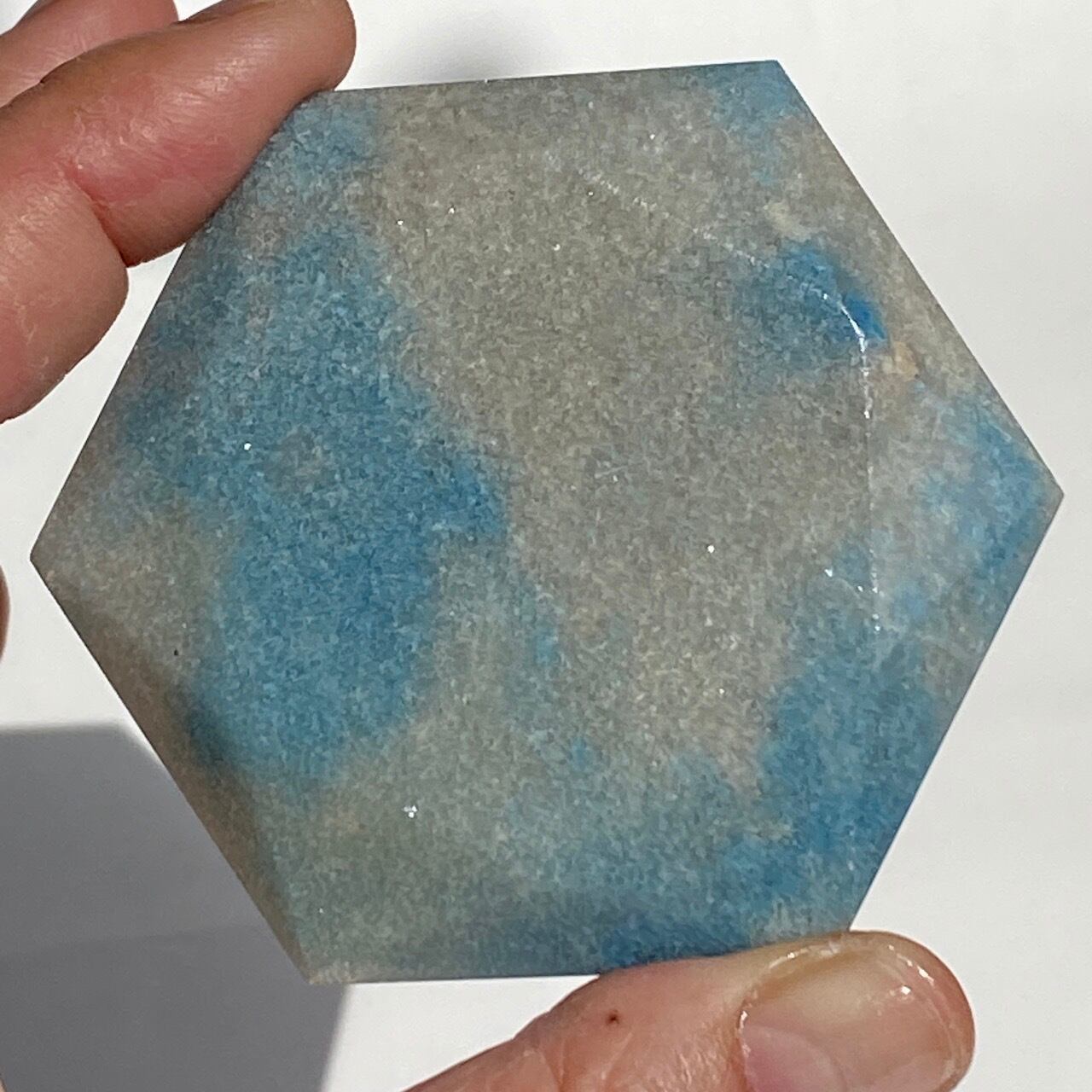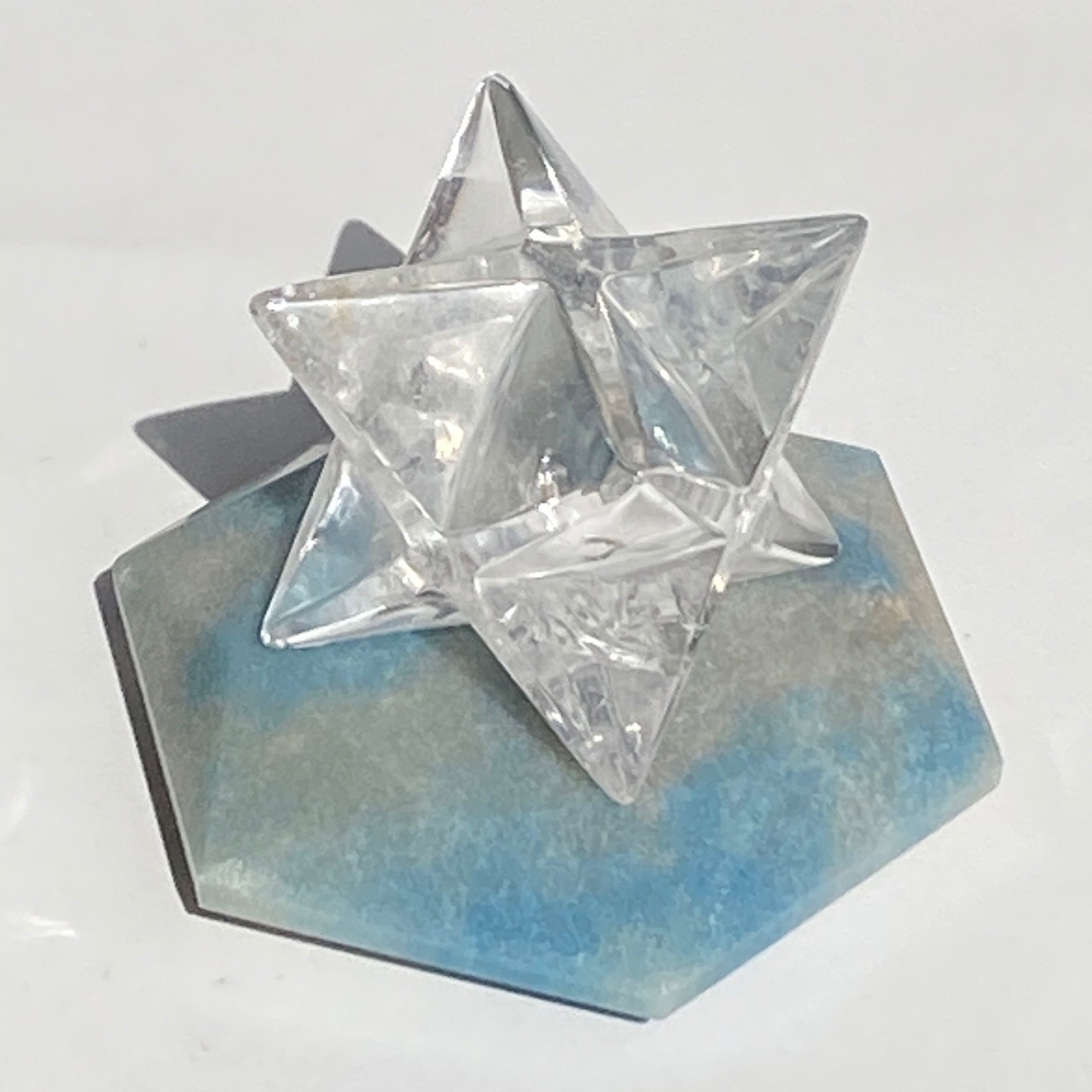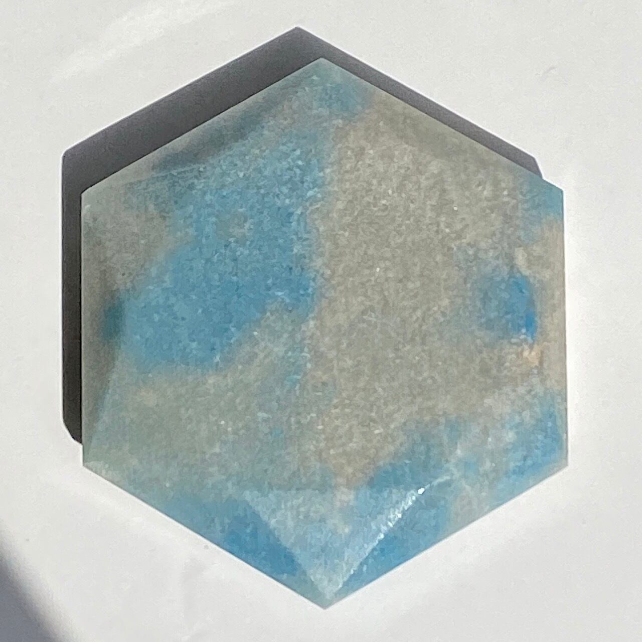 二つの正三角形を逆に重ねた六芒星(ヘキサグラム)が面取りにて両面に施されたヘキサゴンです。淡いグレーのベースに可愛いブルーのパッチが入っていて、空と雲を思わせるような子です。トロレアイトの魅力である粒々感が味わえ、天使のようなイメージも感じさせます。真ん中の平らな部分に小物を置くことが可能です。ちなみに、例えば他の石やクリスタル、動物のカービングや天使などを飾るのもキュートです。今回はマカバを置いて撮影してみました。