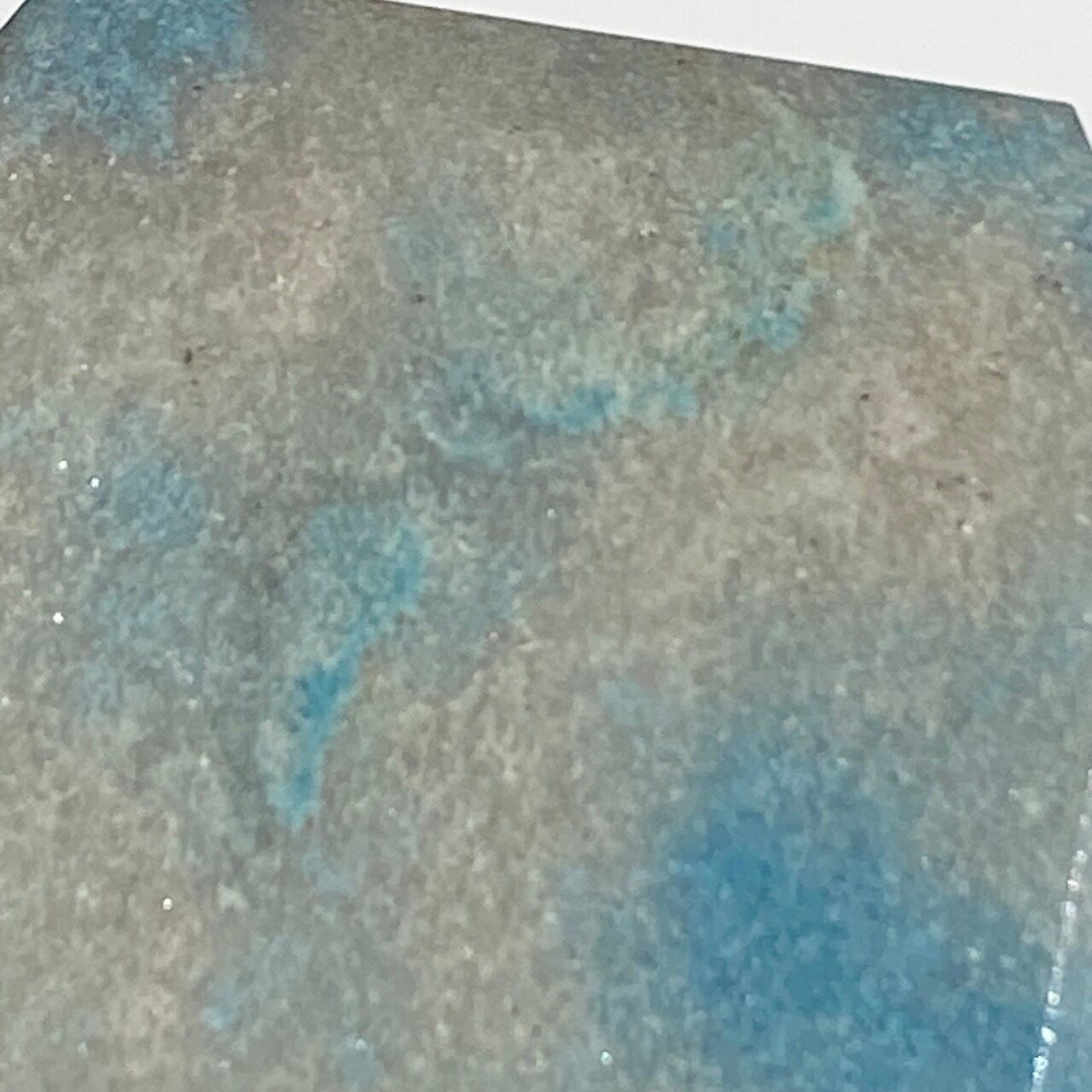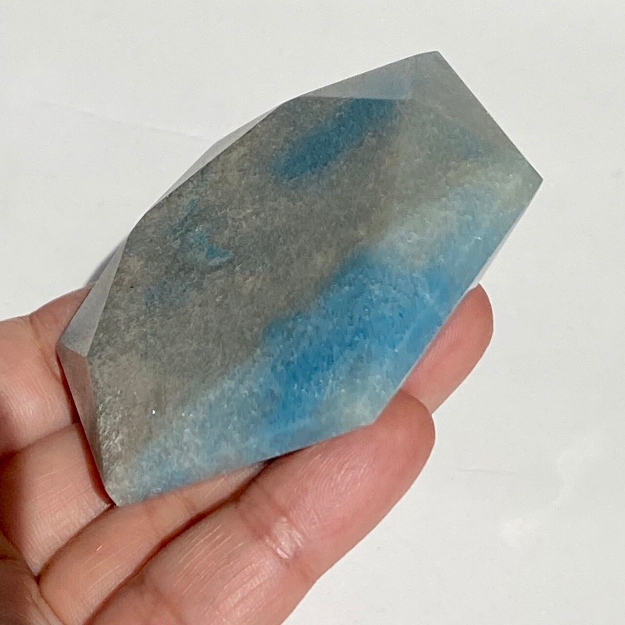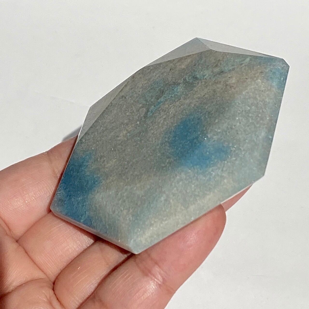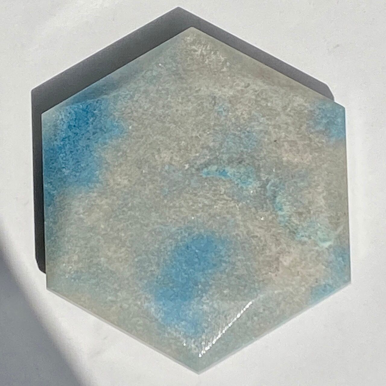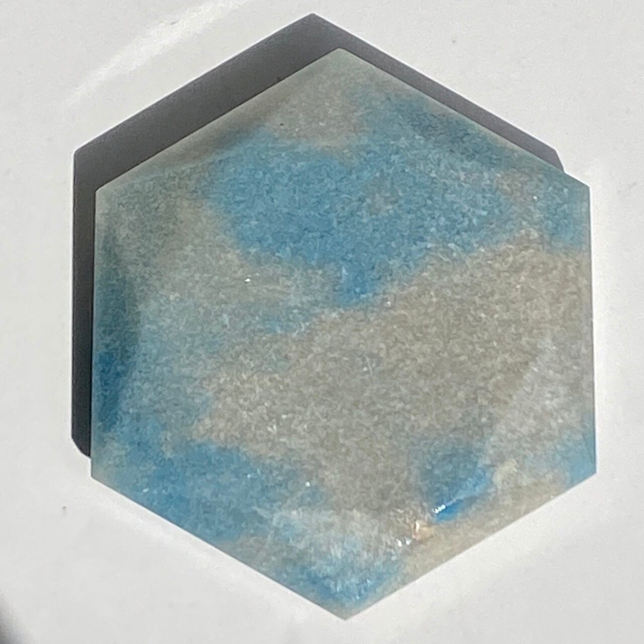 二つの正三角形を逆に重ねた六芒星(ヘキサグラム)が面取りにて両面に施されたヘキサゴンです。淡いグレーのベースに可愛いブルーのパッチが入っていて、空と雲を思わせるような子です。トロレアイトの魅力である粒々感が味わえ、天使のようなイメージも感じさせます。真ん中の平らな部分に小物を置くことが可能です。ちなみに、例えば他の石やクリスタル、動物のカービングや天使などを飾るのもキュートです。今回はマカバを置いて撮影してみました。